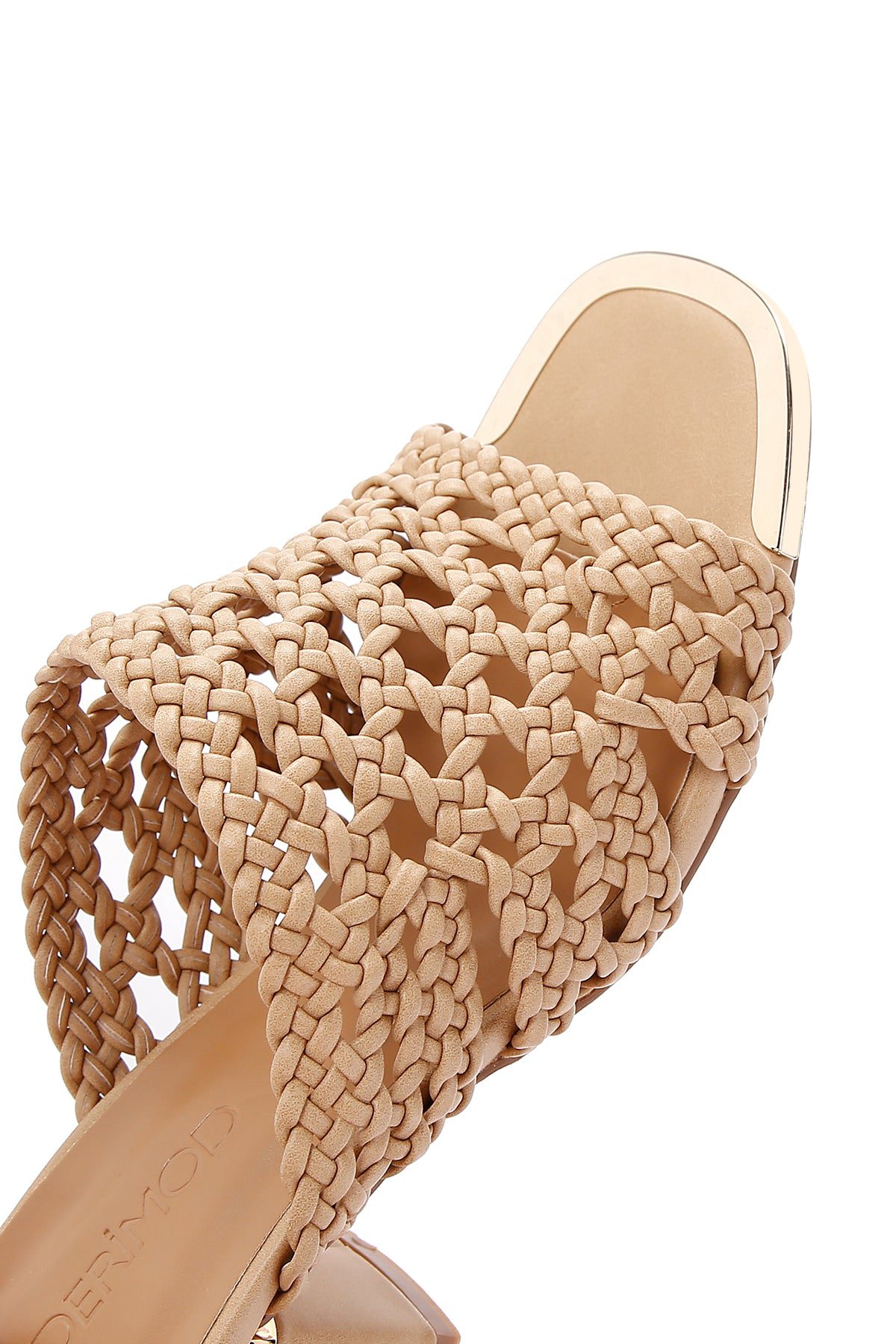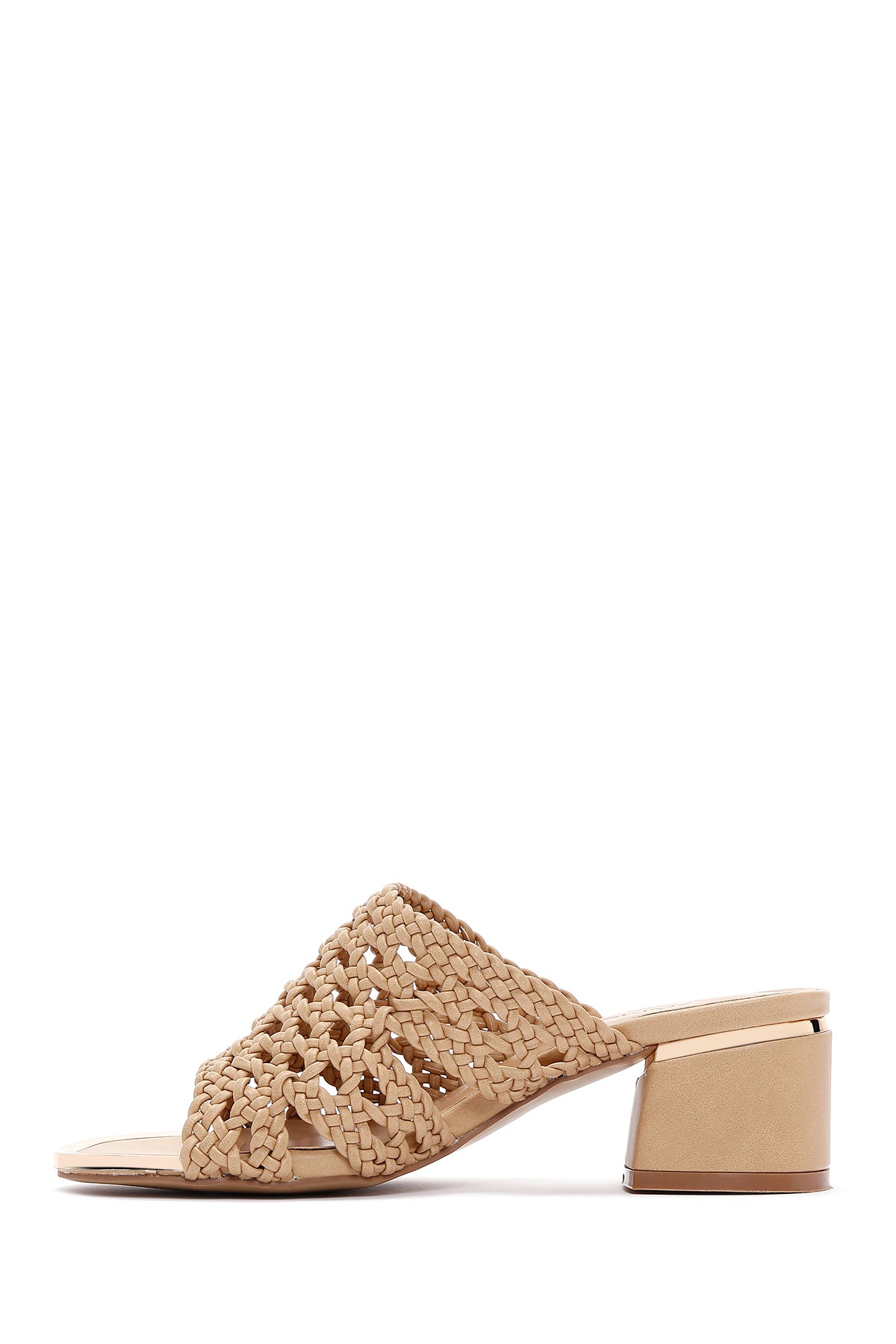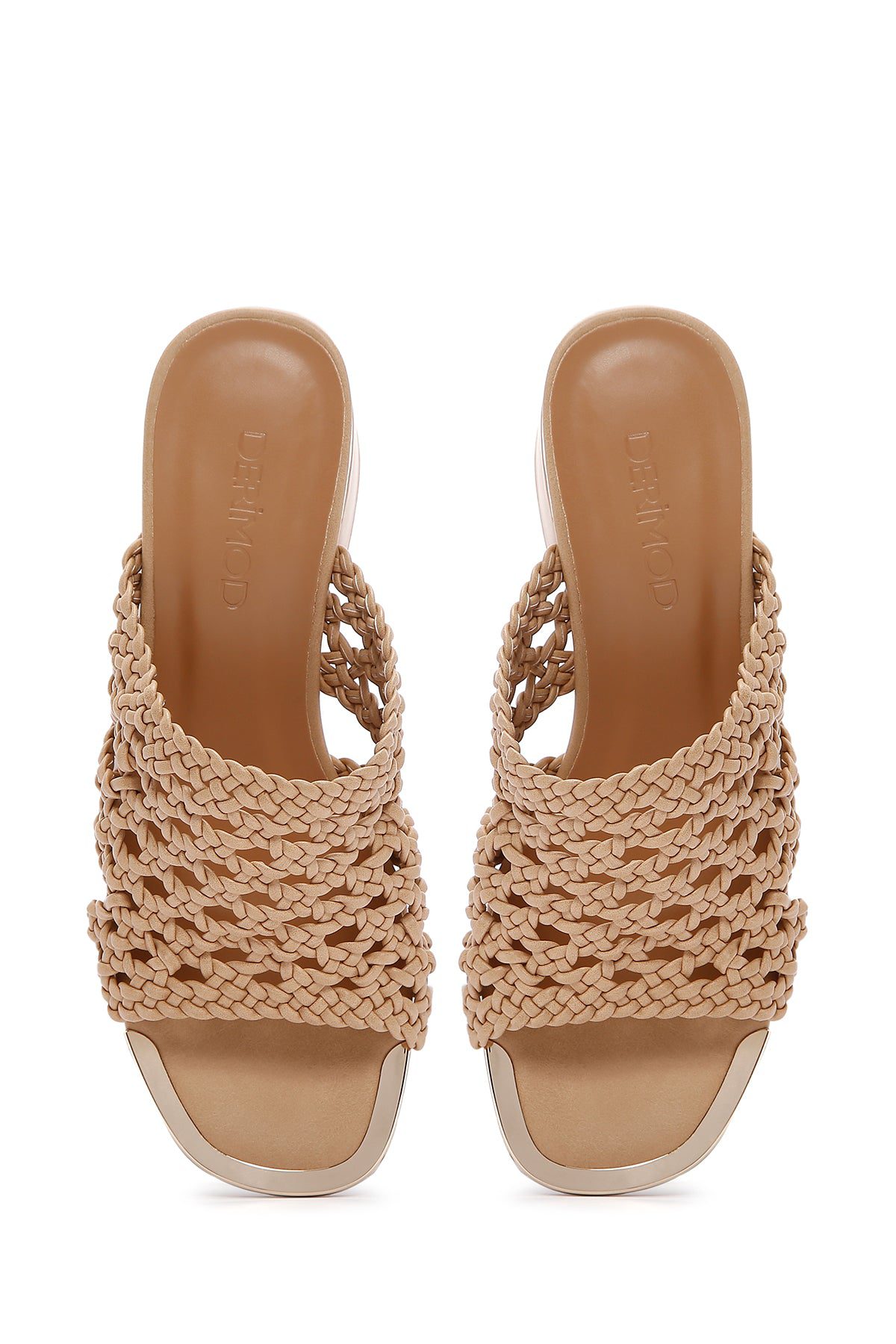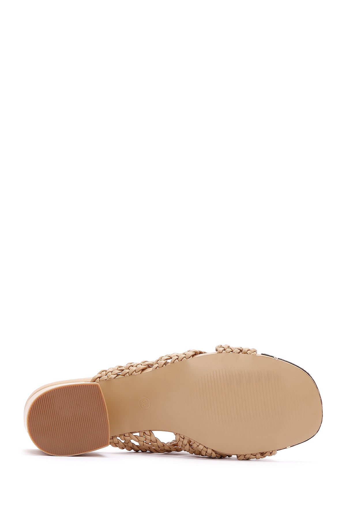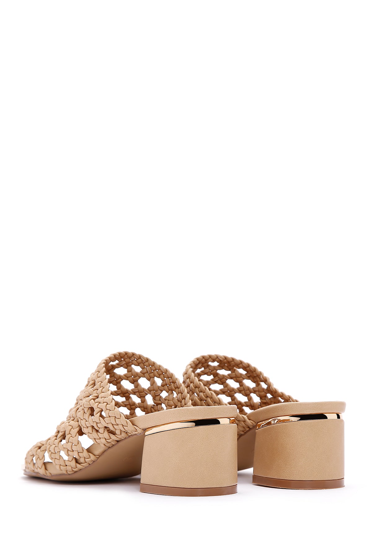 Kadın Bej Örgülü Kısa Kalın Topuklu Terlik