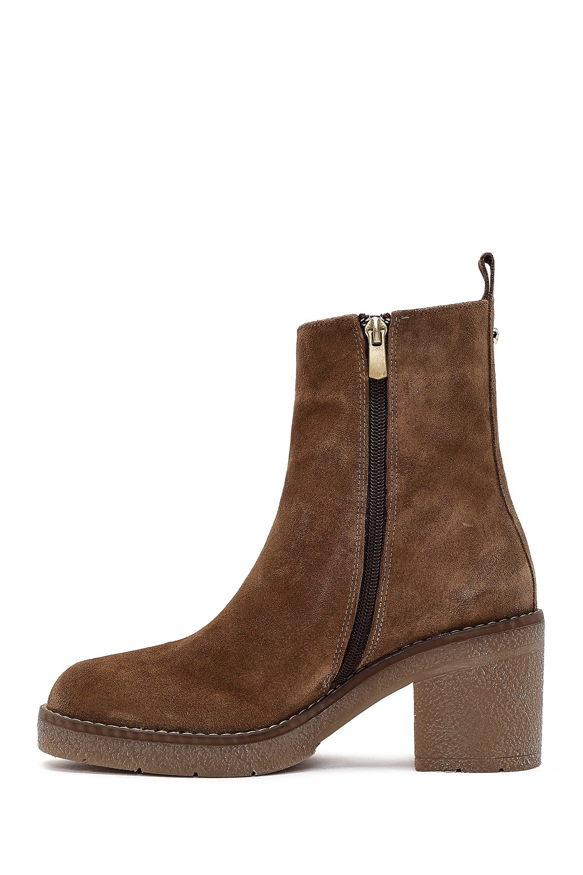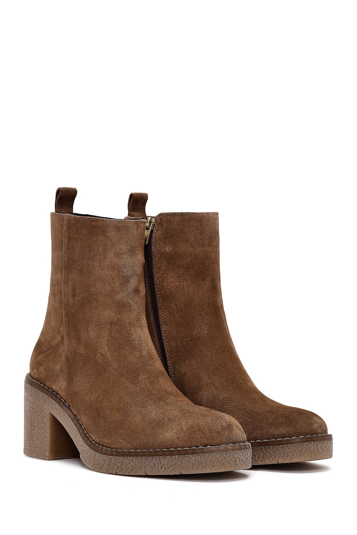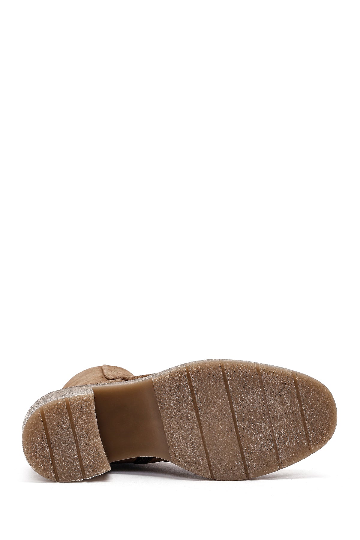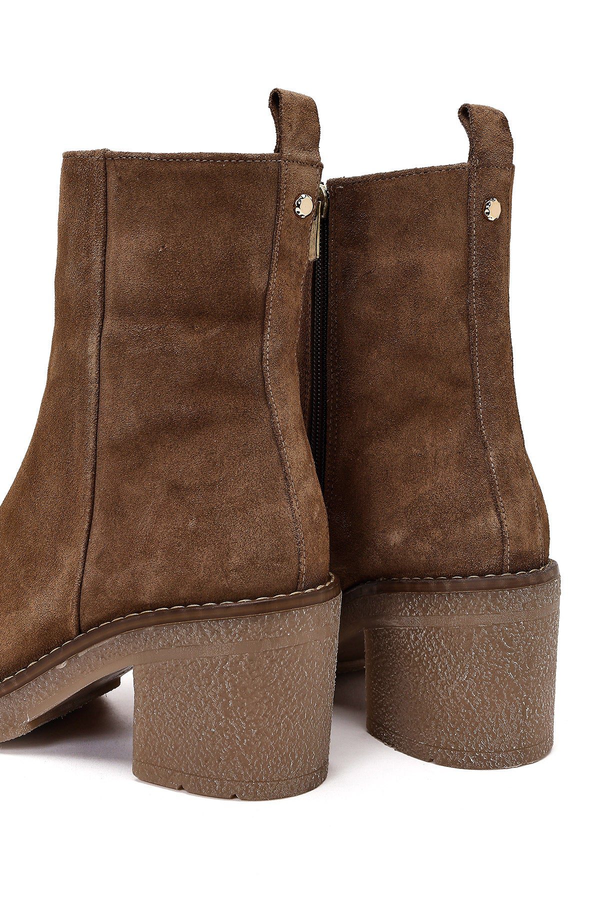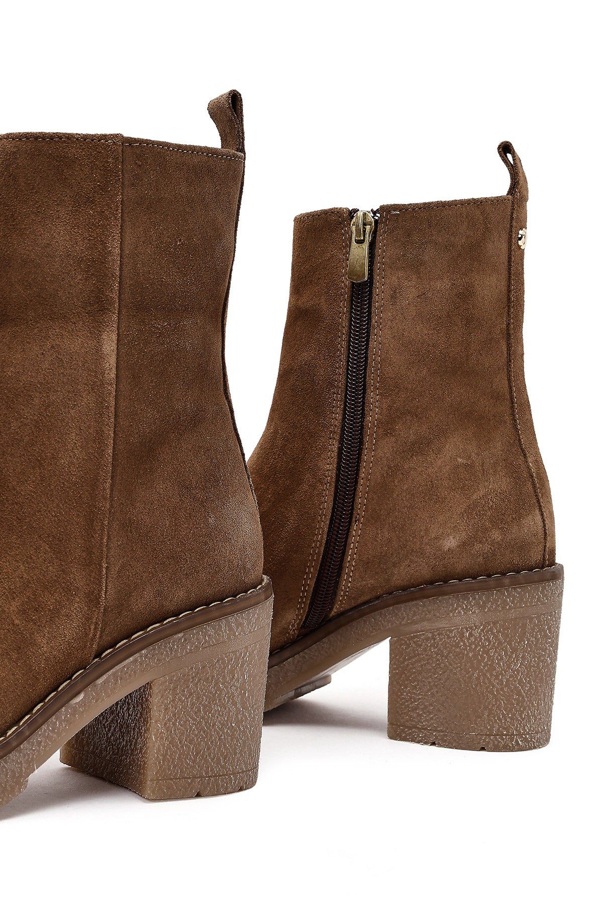 Kadın Bej Fermuarlı Kalın Topuklu Süet Deri Bot