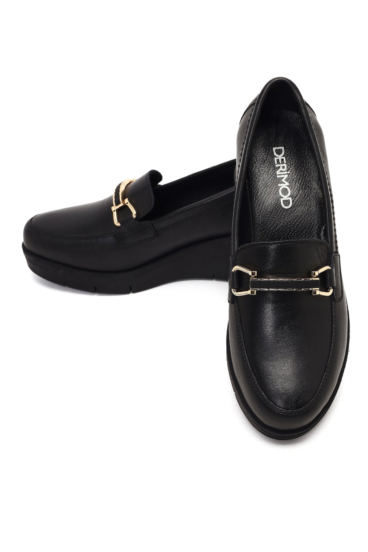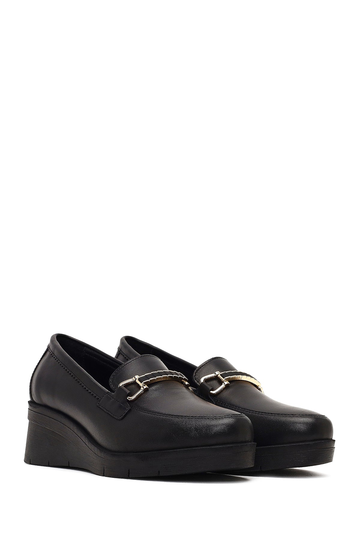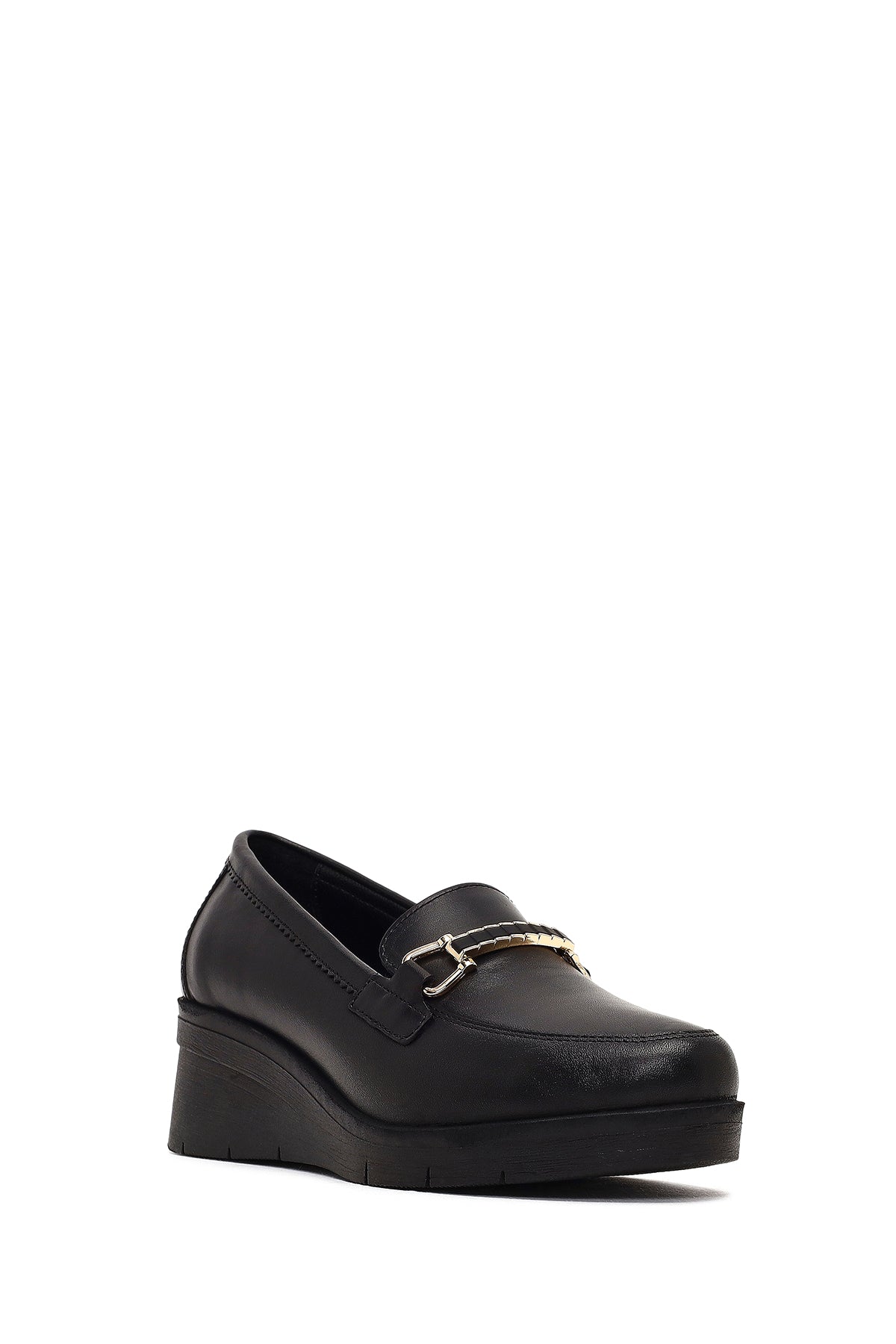 Kadın Siyah Tokalı Dolgu Topuklu Deri Comfort Loafer