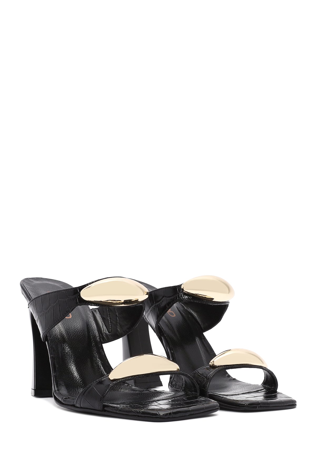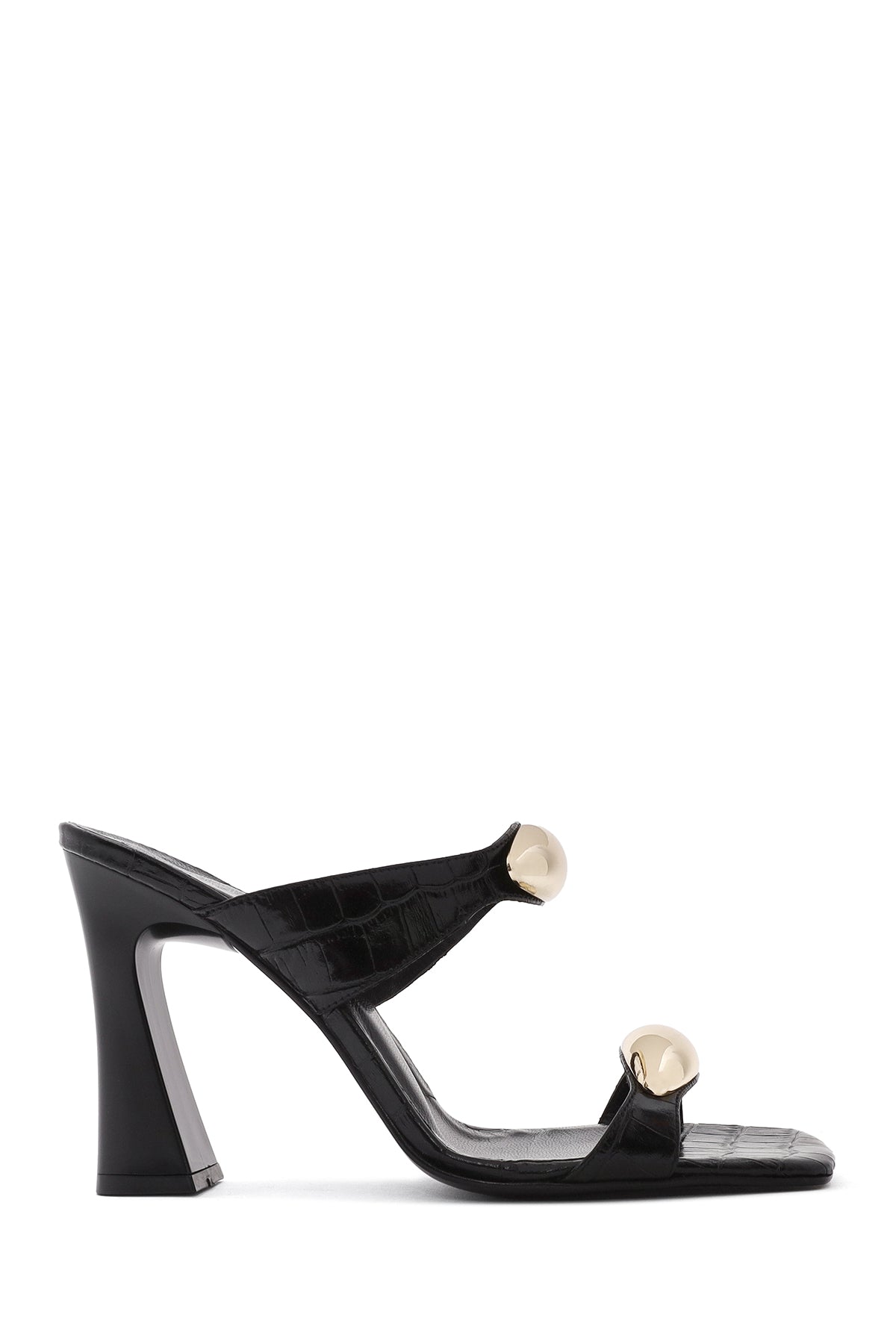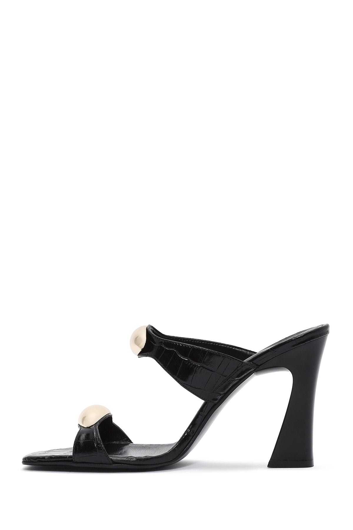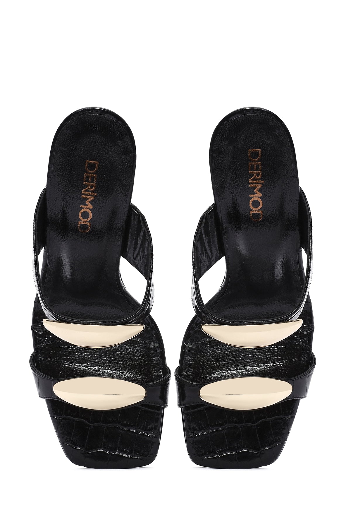 Kadın Siyah Kroko Yüksek Kalın Topuklu Deri Terlik