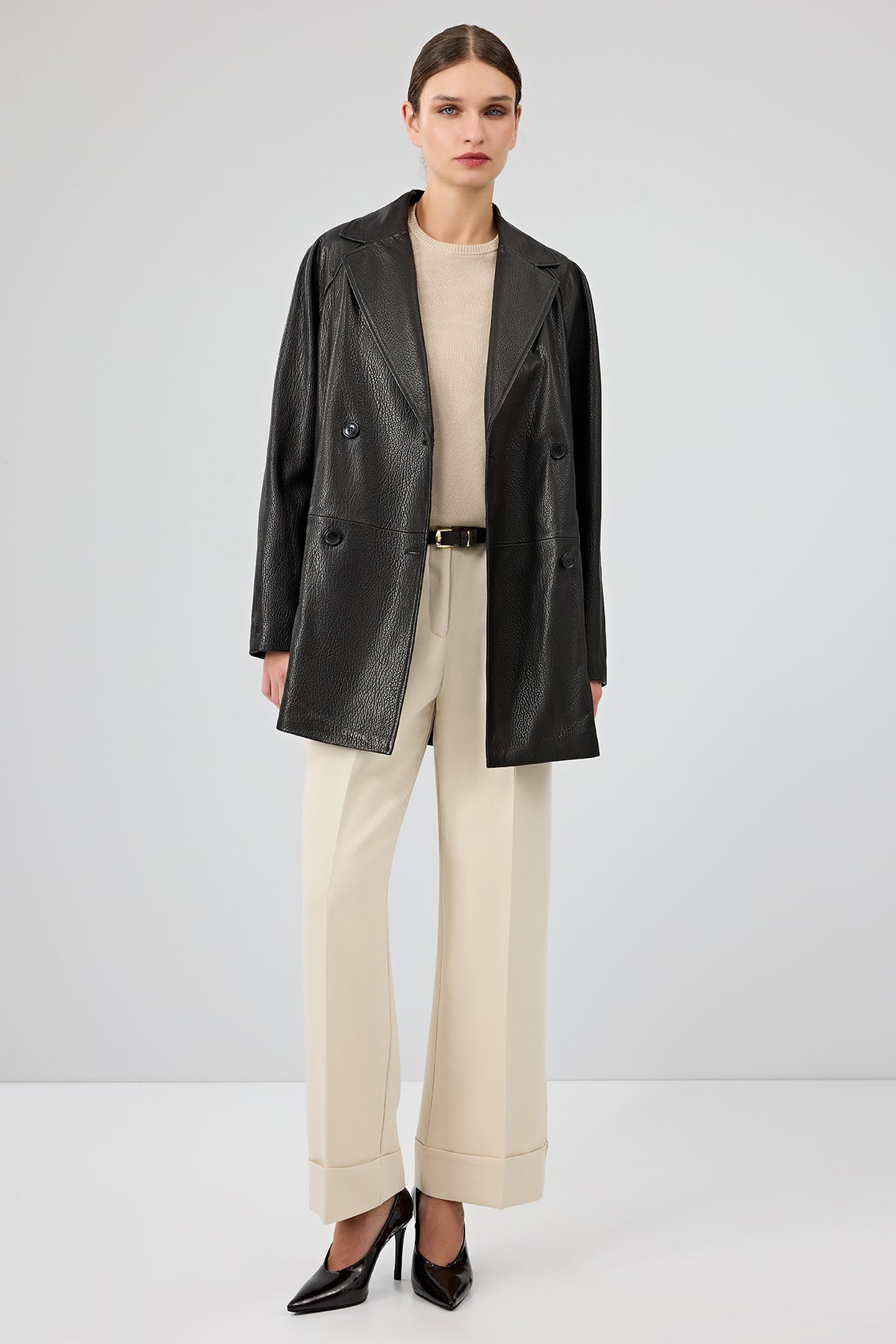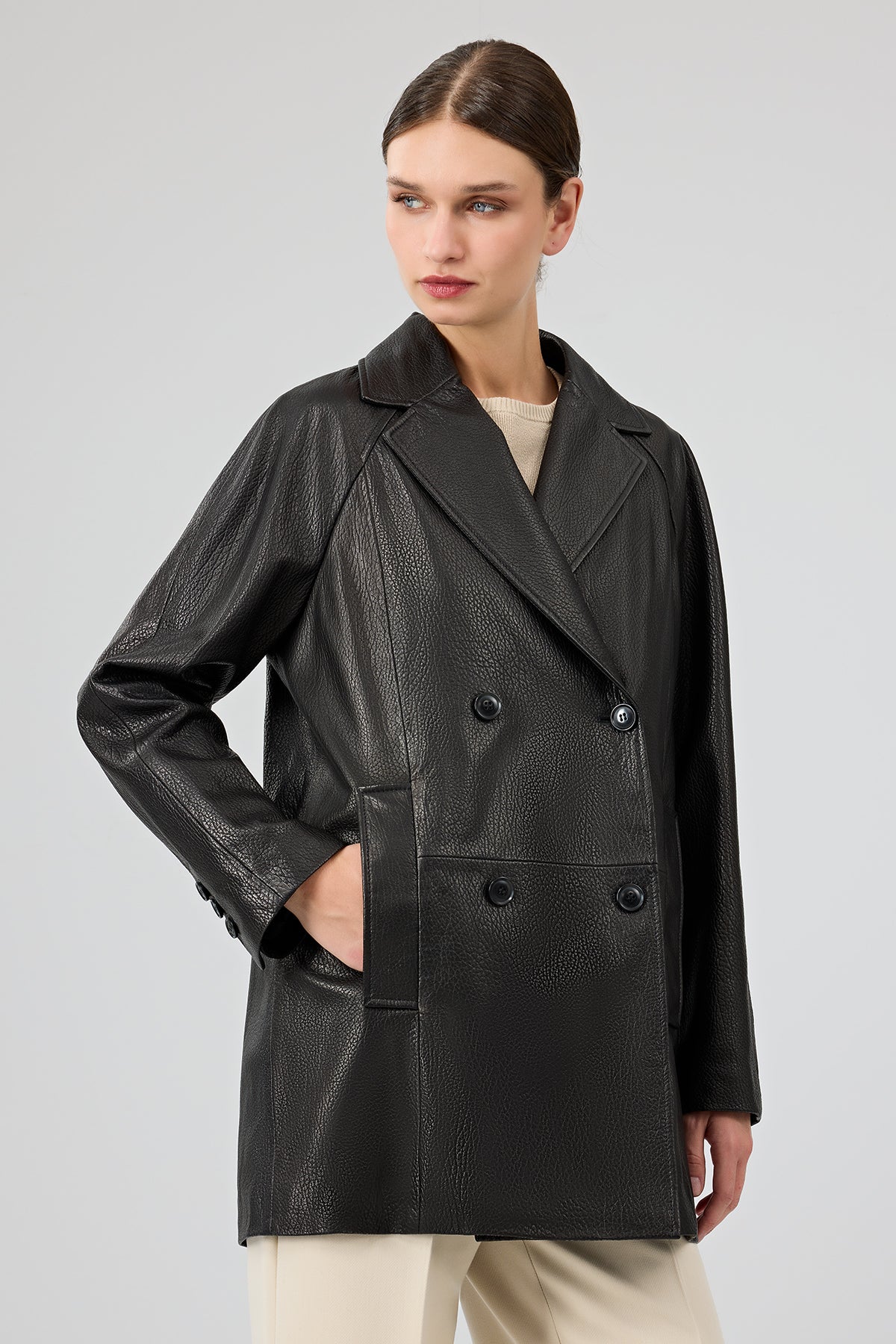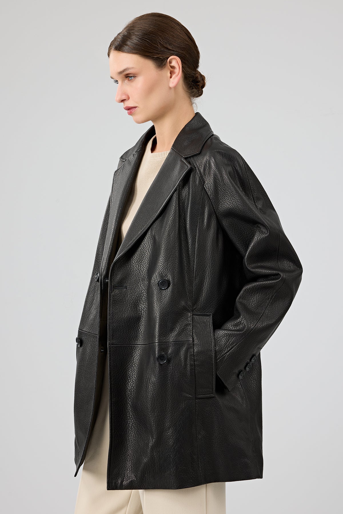 Wendy Kadın Siyah Kruvaze Yaka Uzun Deri Ceket