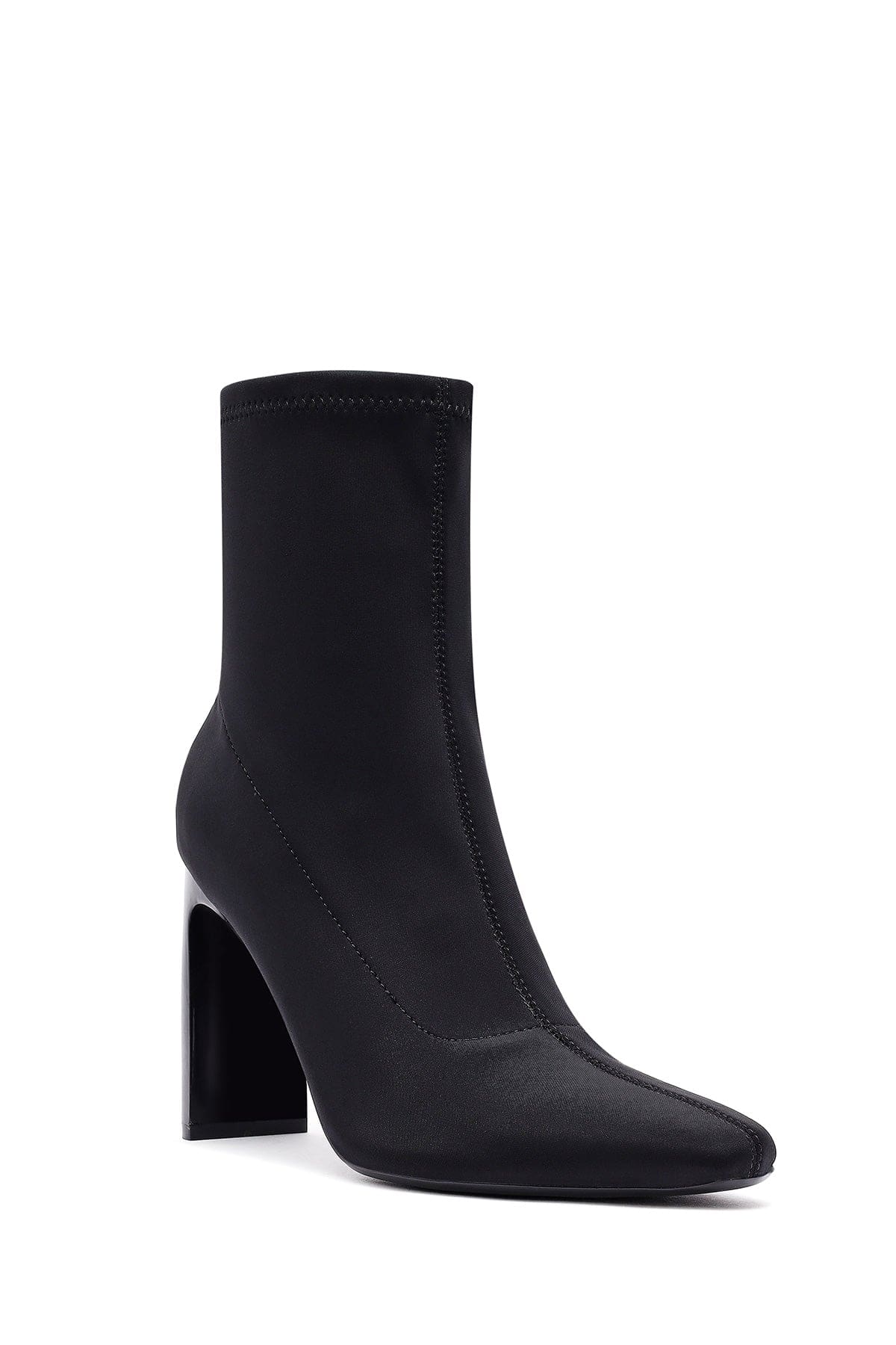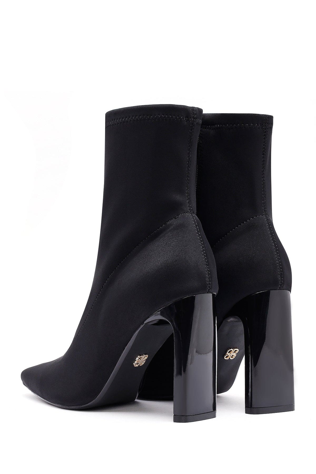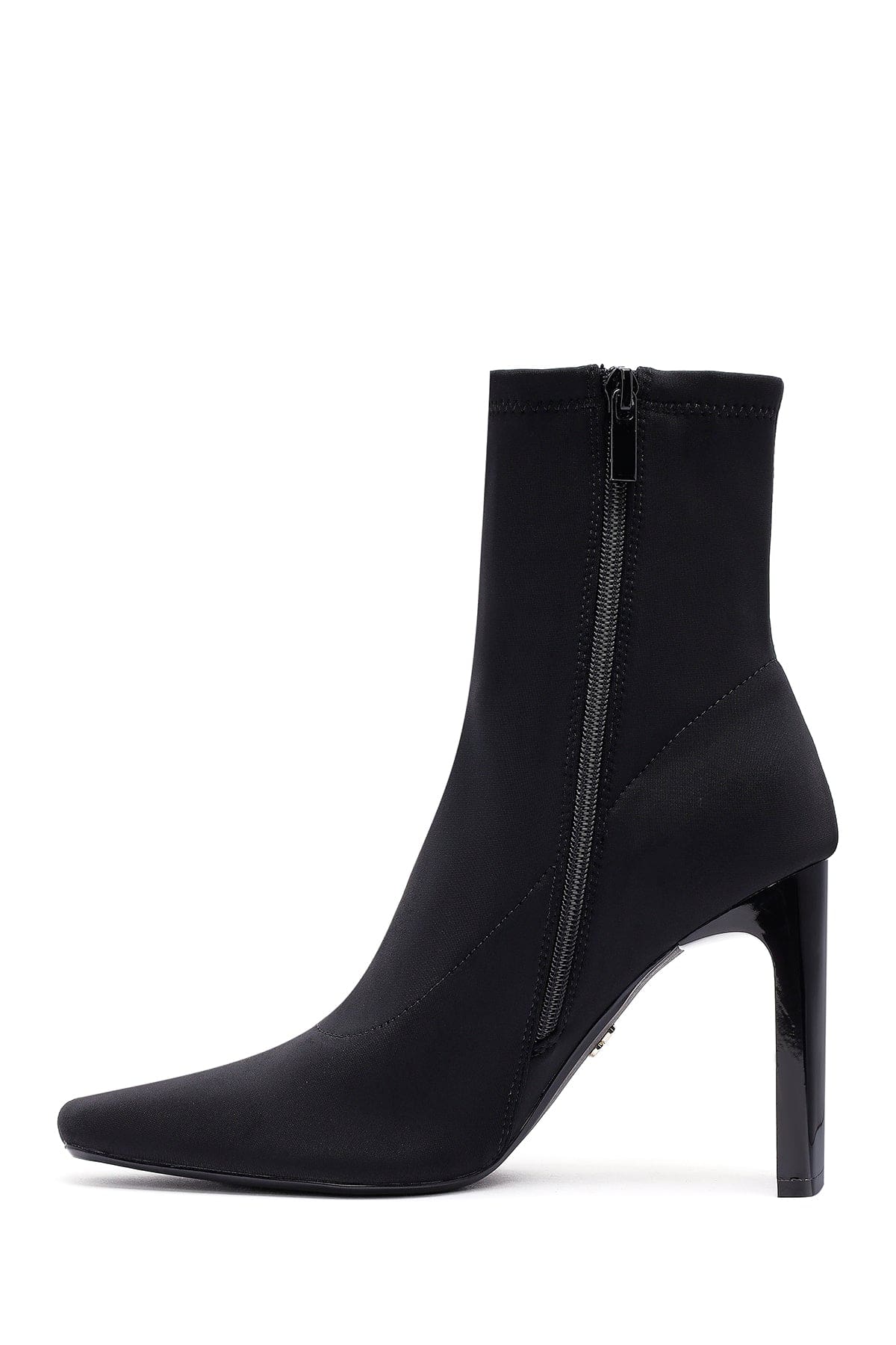 Kadın Siyah Fermuarlı Yüksek Kalın Topuklu Kumaş Bot