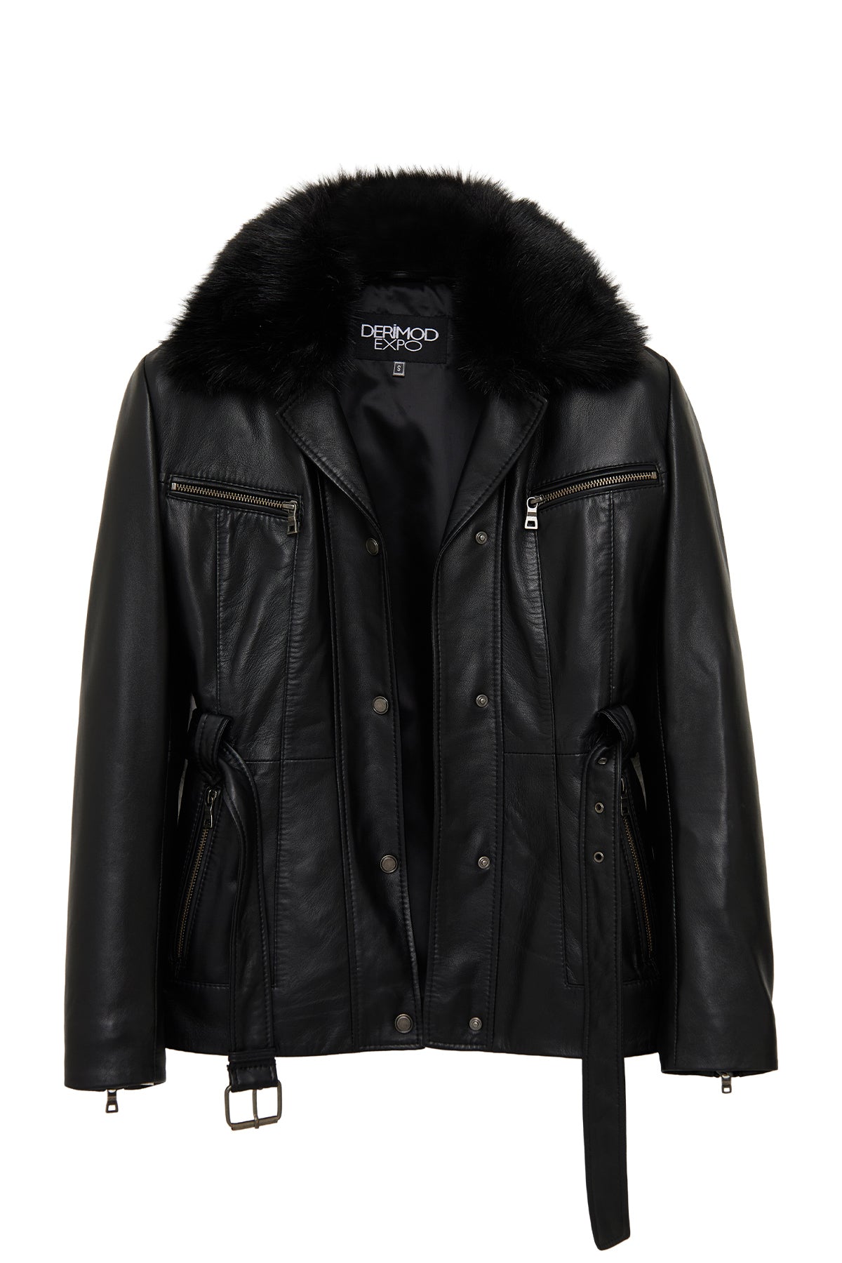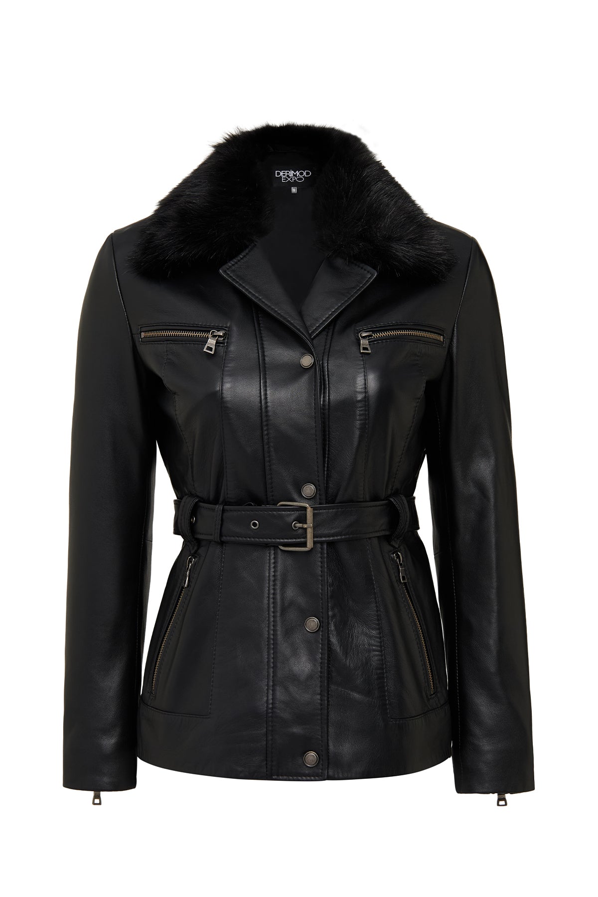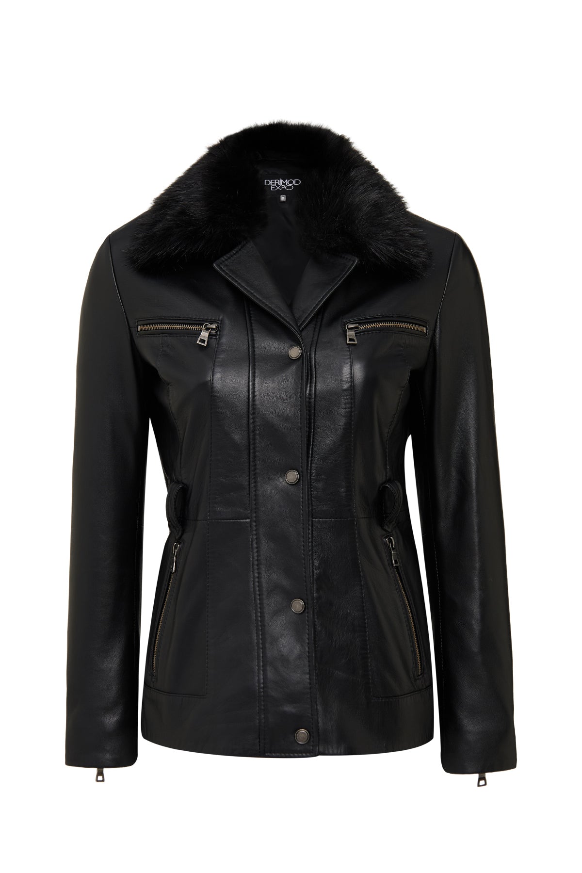کاپشن چرمی زنانه مشکی یقه خزدار Edith دری مد