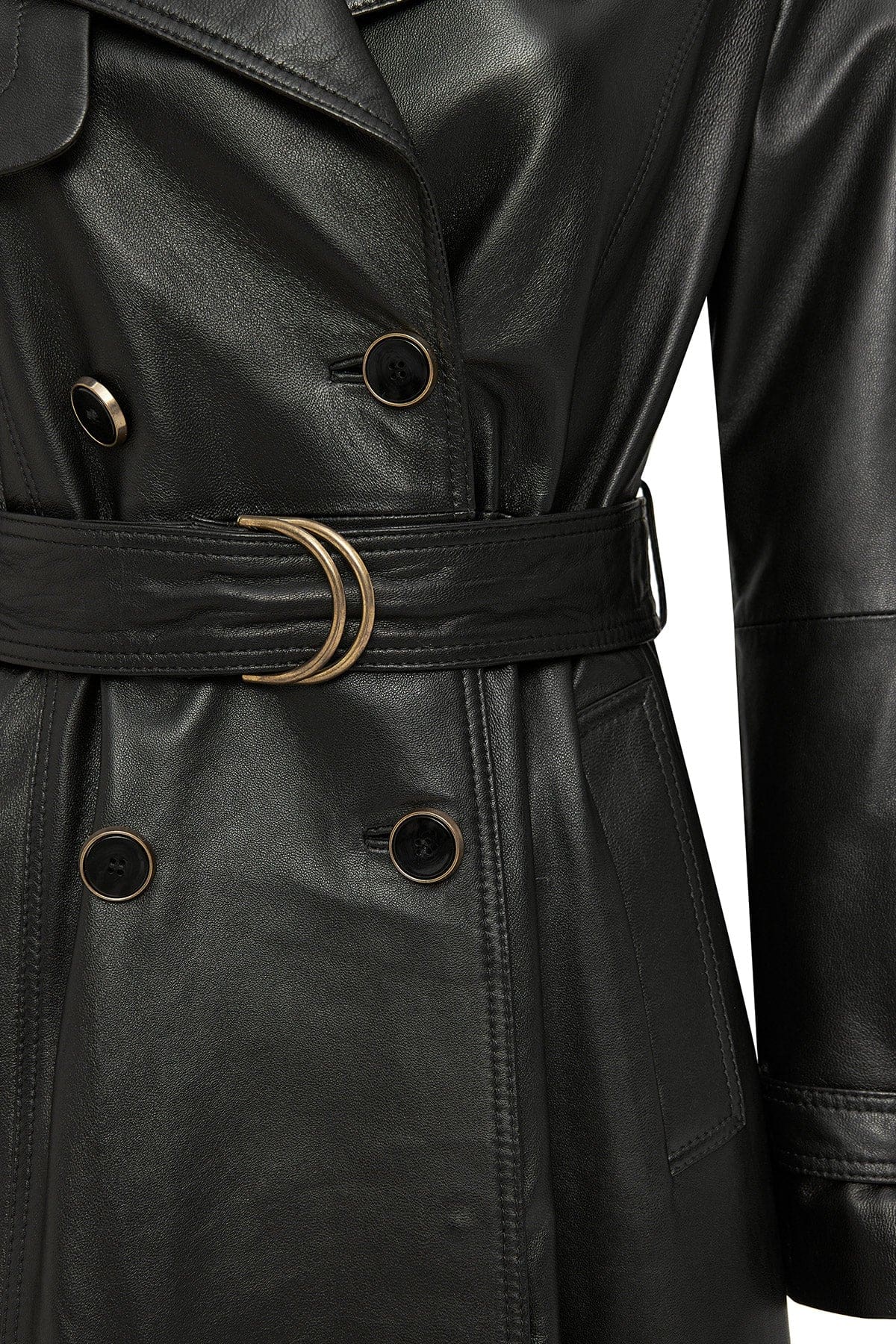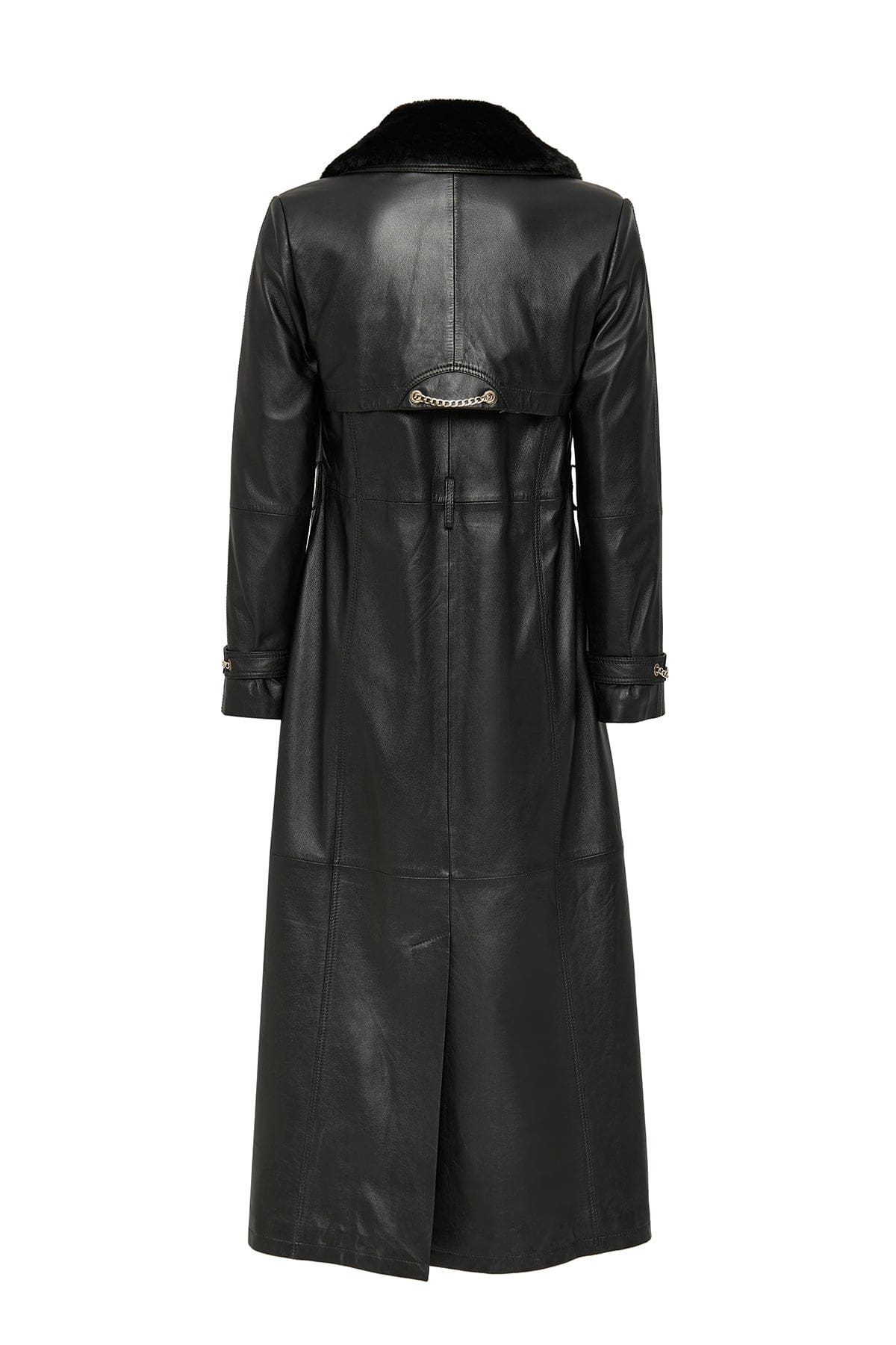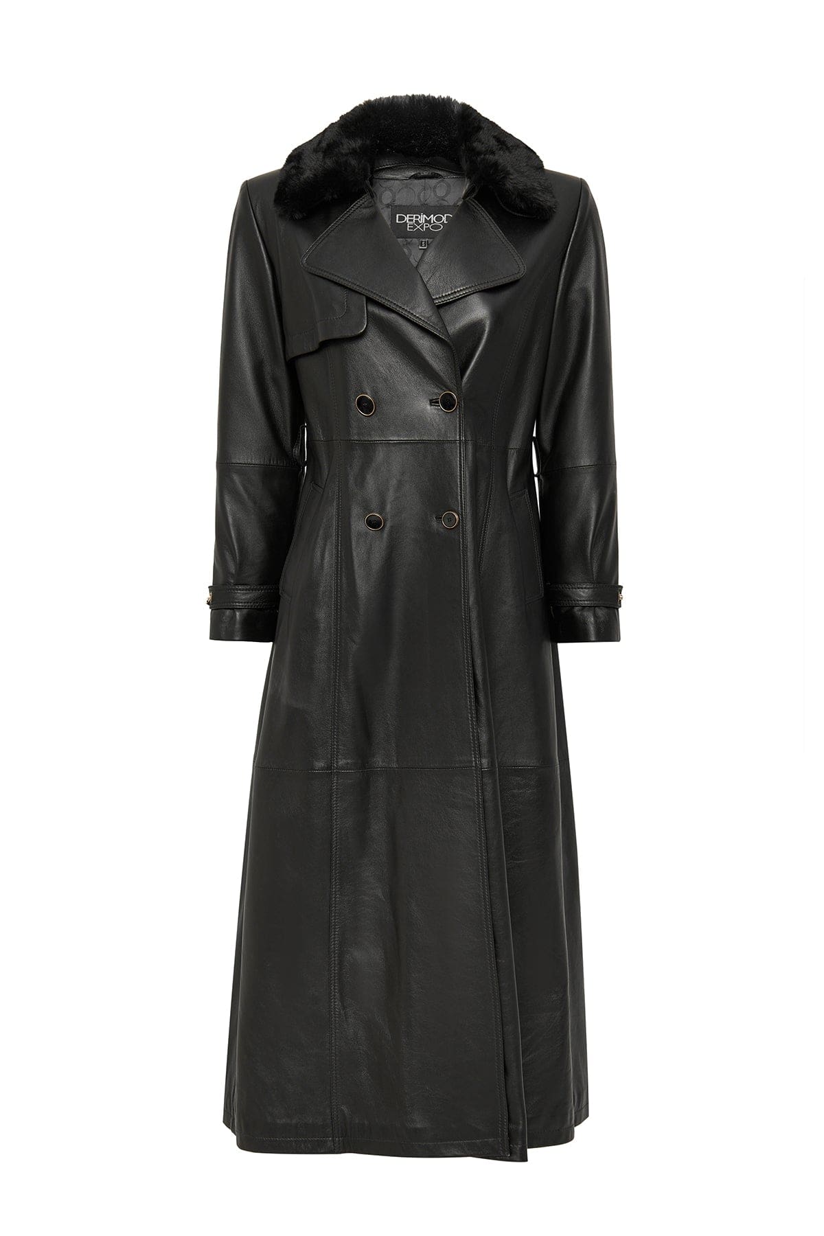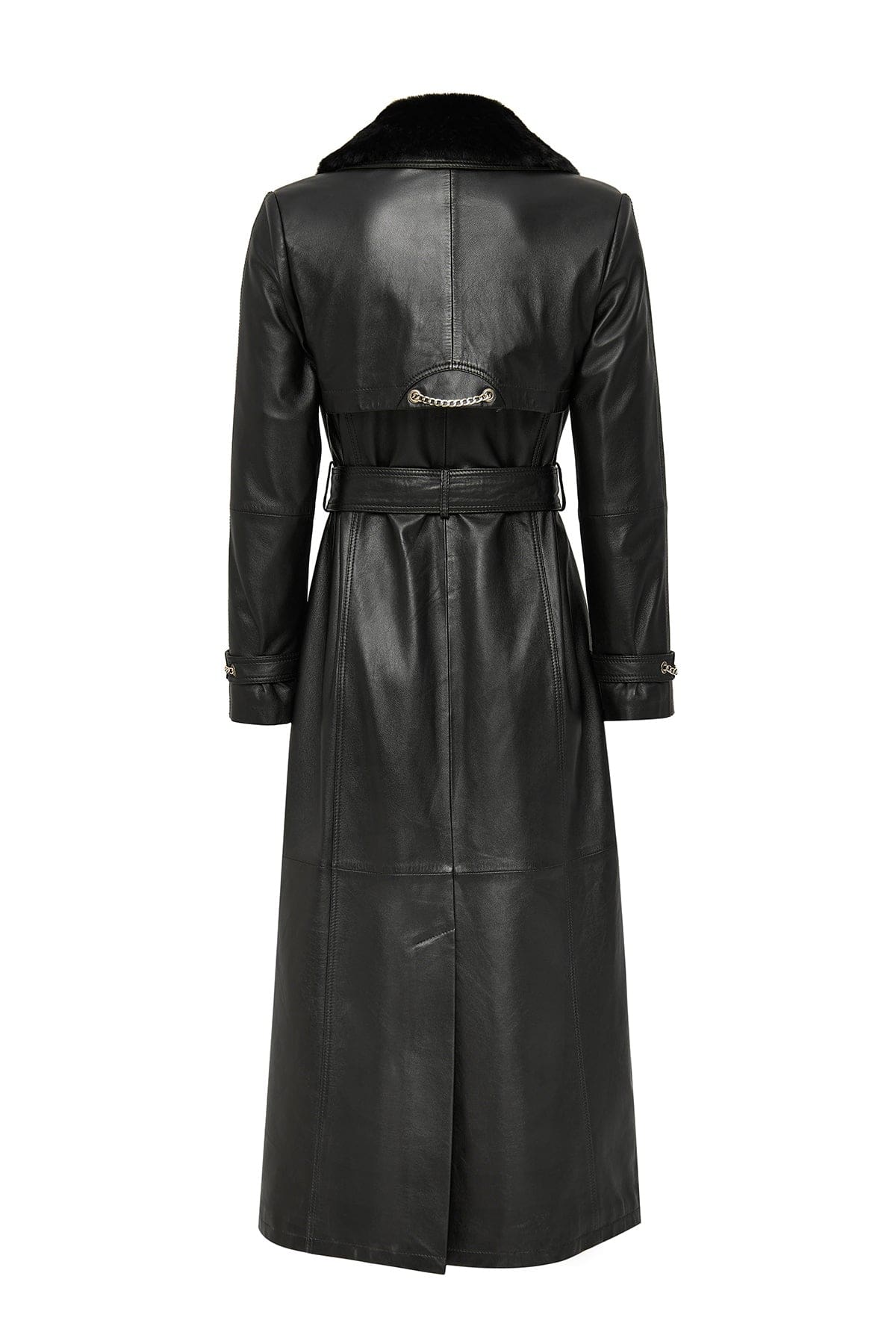 ترنچ کت چرمی زنانه مشکی یقه خزدار کمربنددار Jenny دری مد