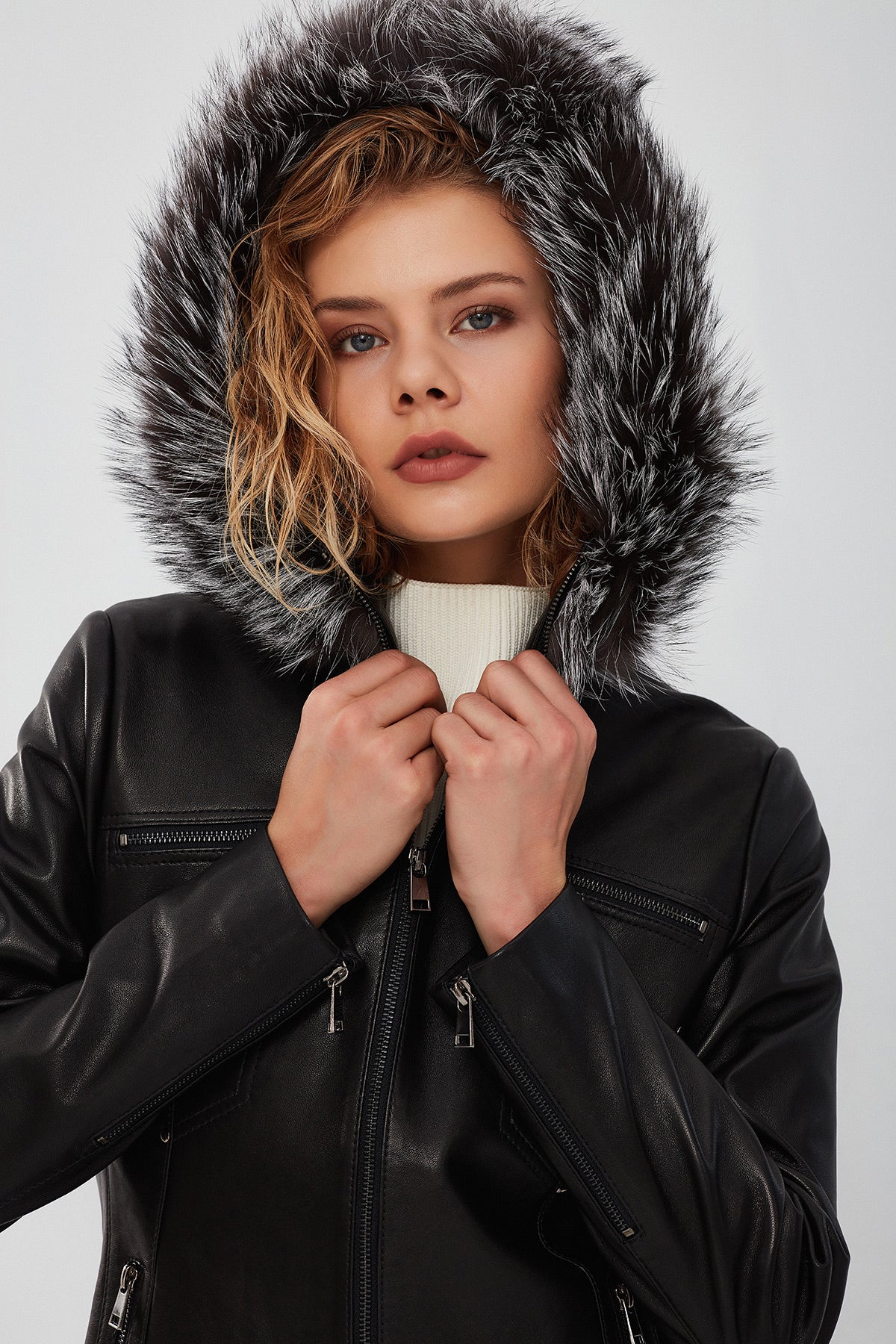 Audrey Kadın Siyah Kapüşonlu Kürklü Deri Mont