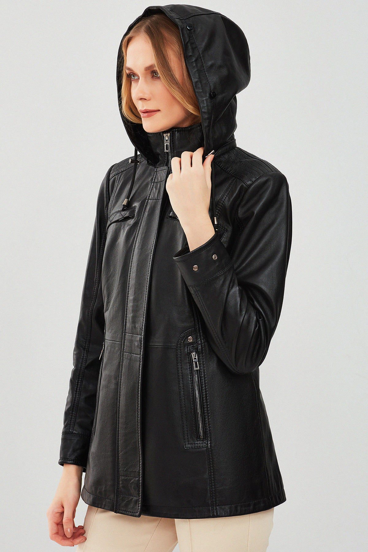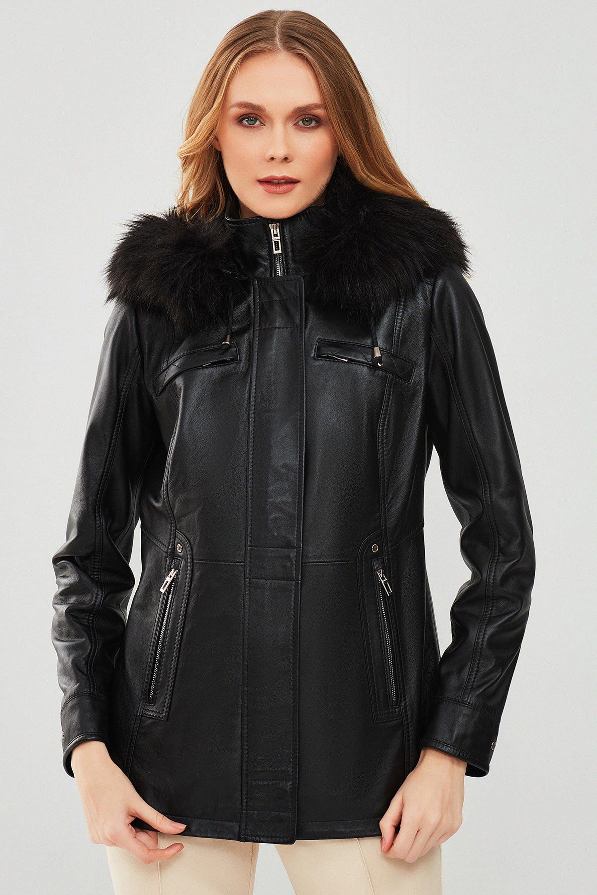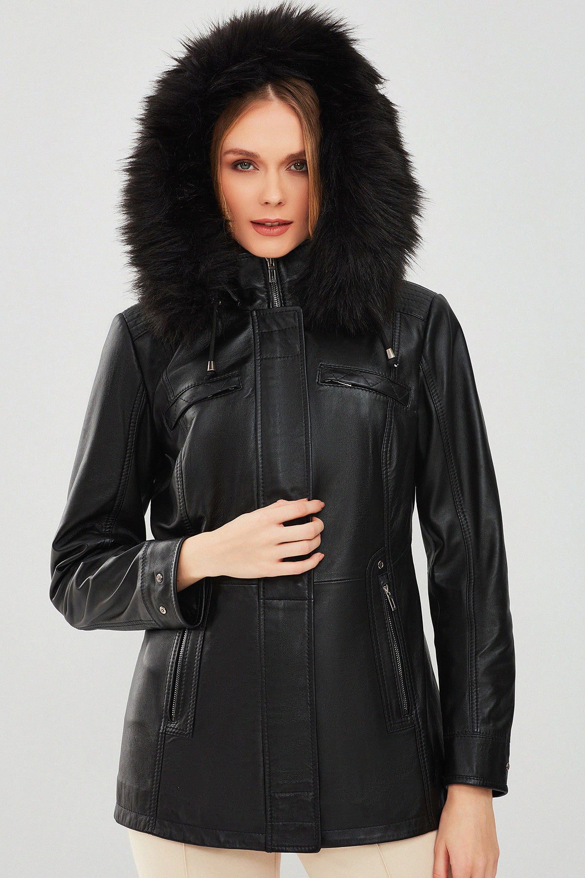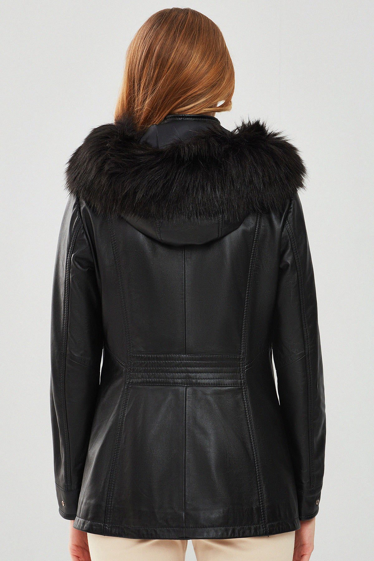 Betty Kadın Siyah Kapüşonlu Kürklü Deri Kaban