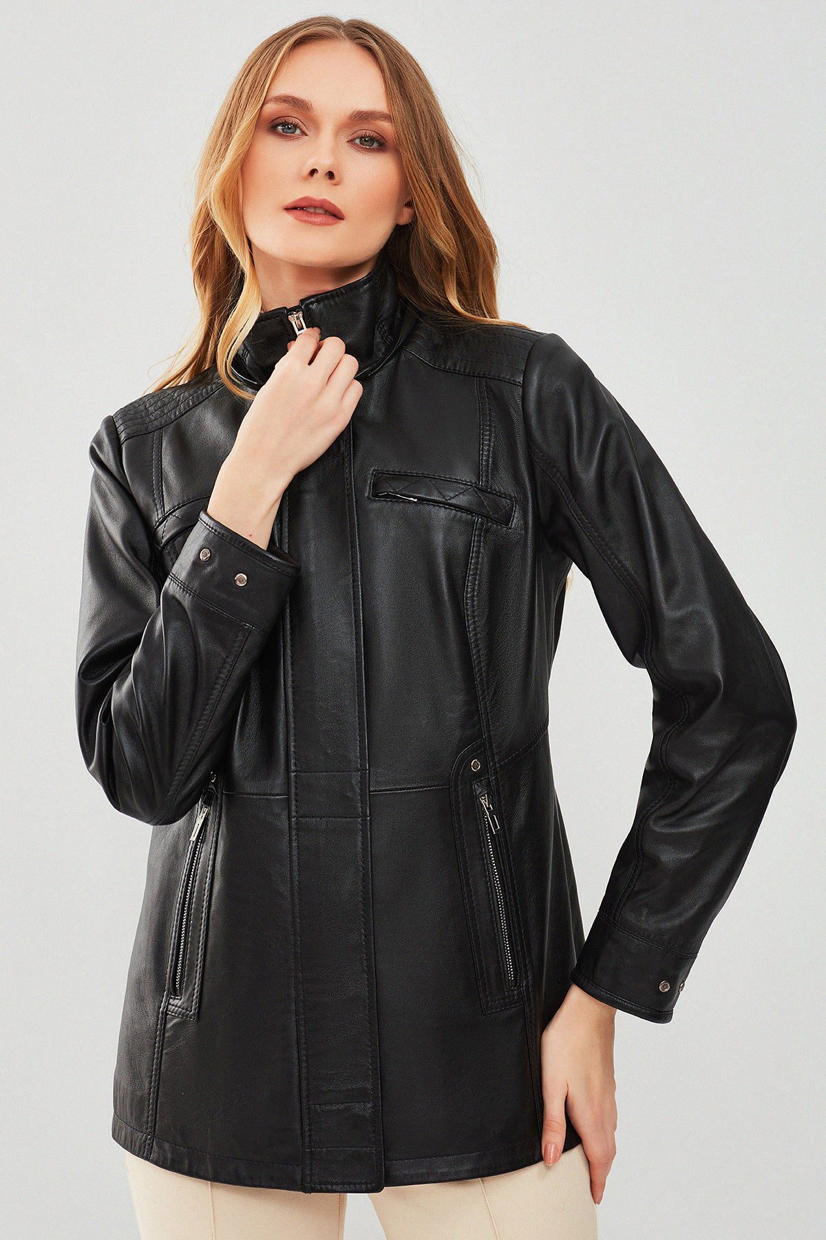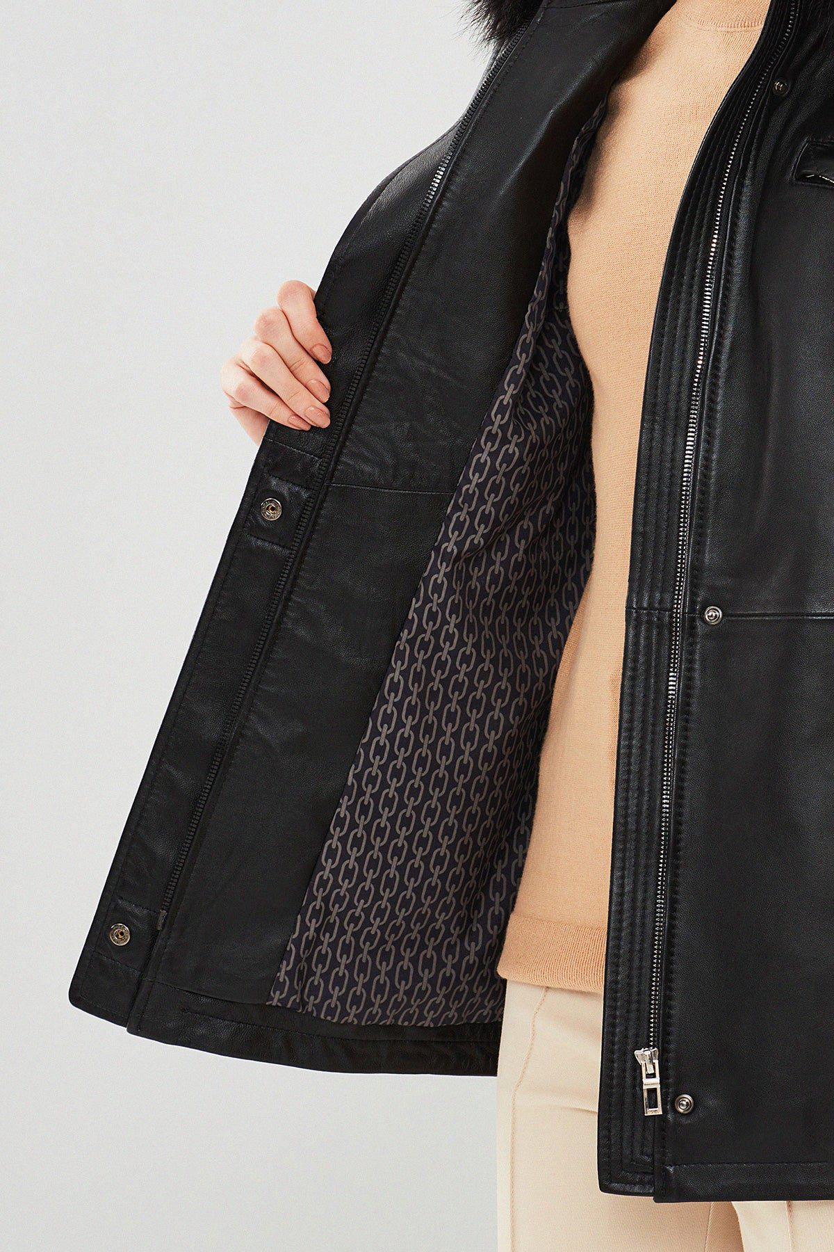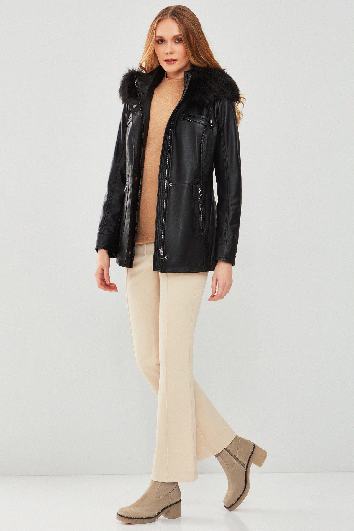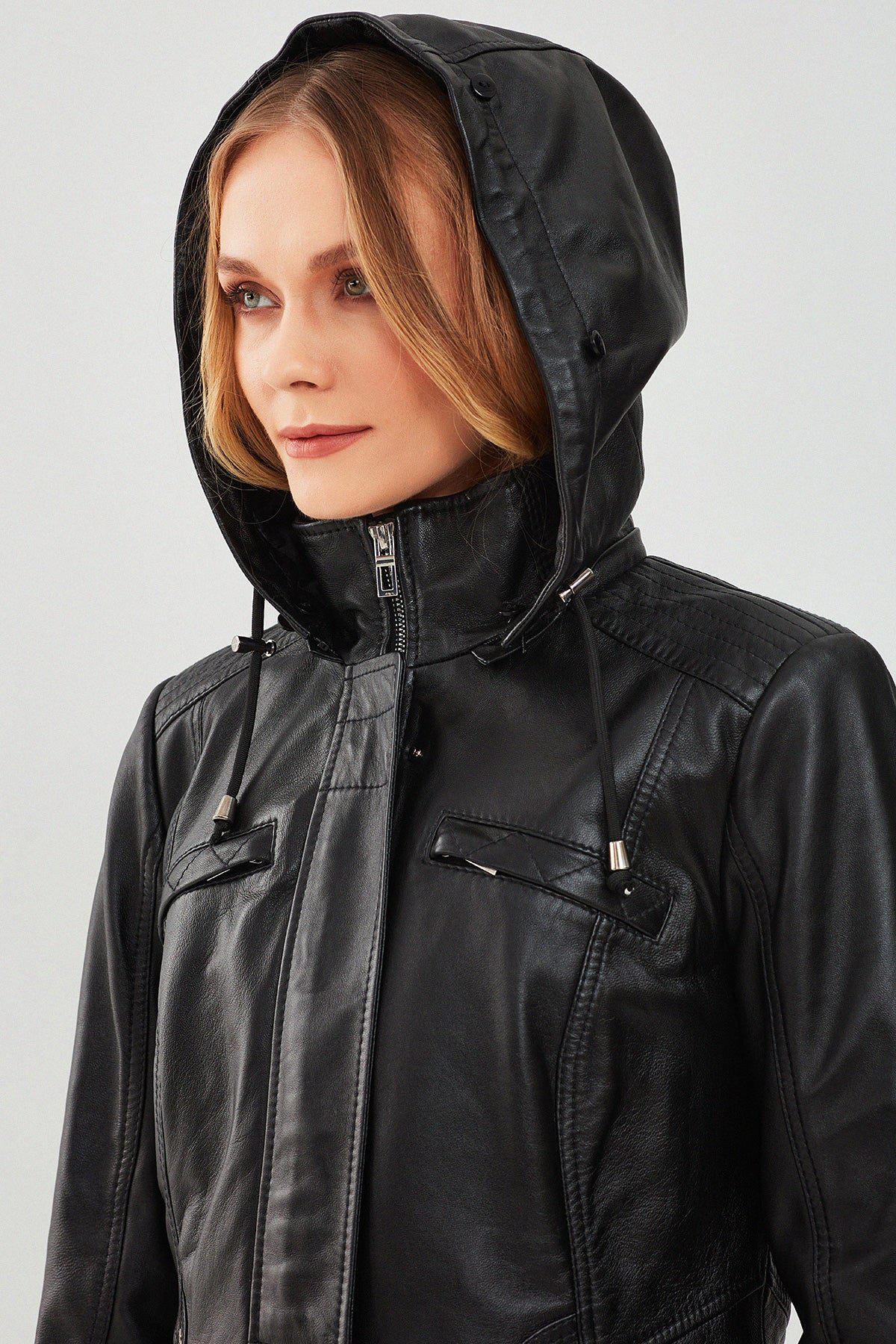 Betty Kadın Siyah Kapüşonlu Kürklü Deri Kaban