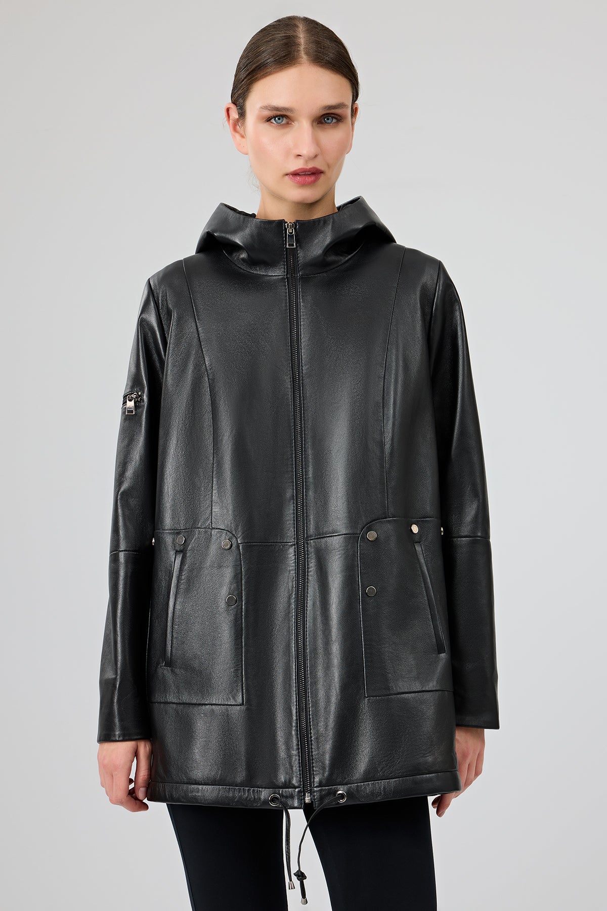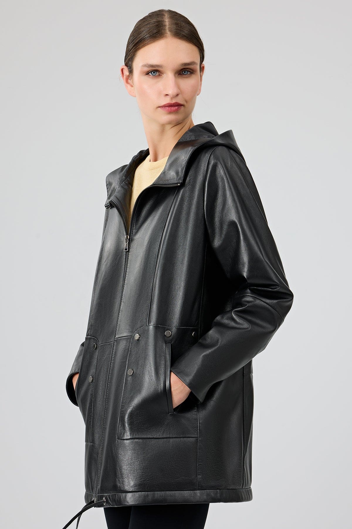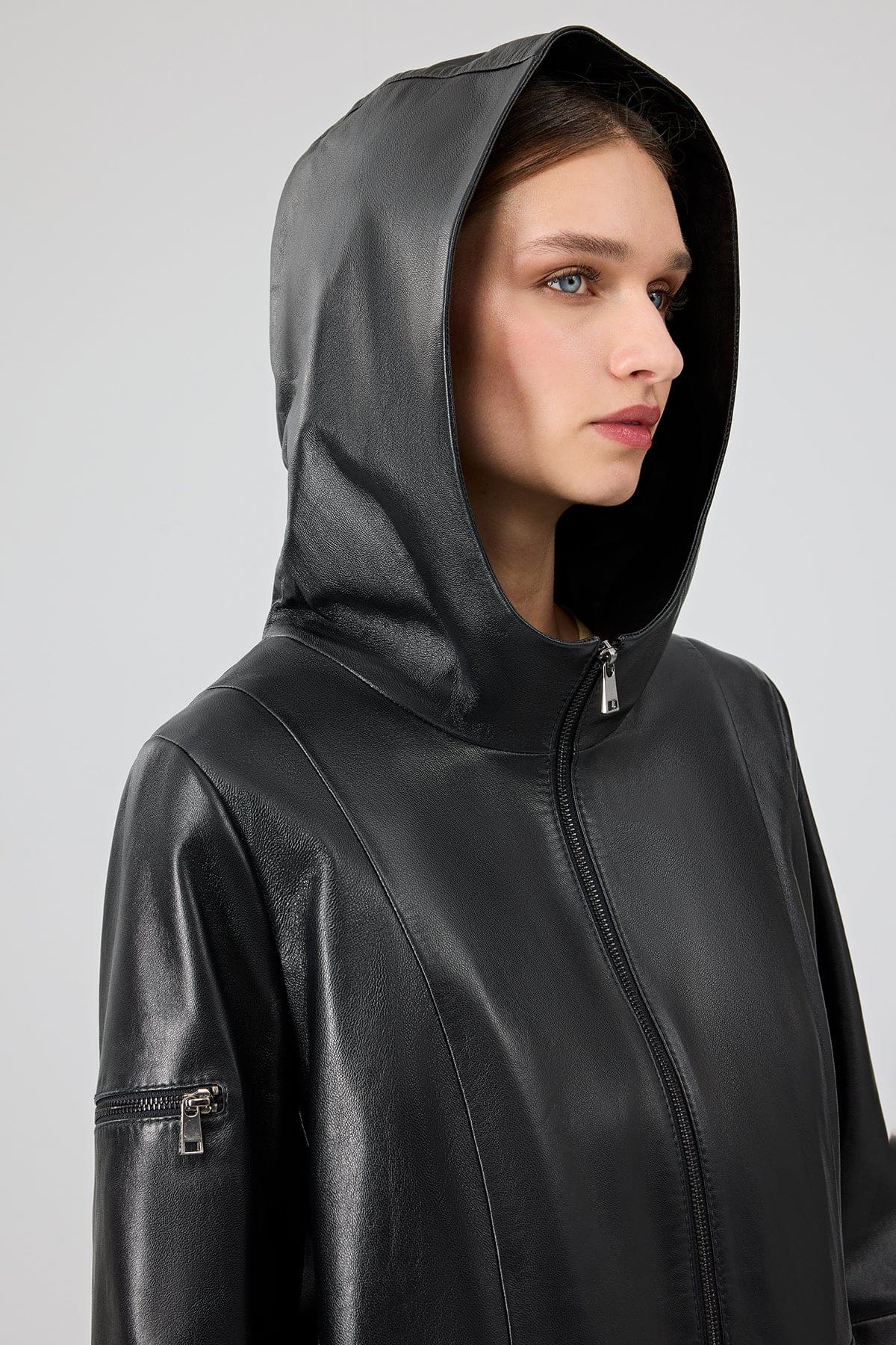 Cindy Kadın Siyah Kapüşonlu Deri Kaban