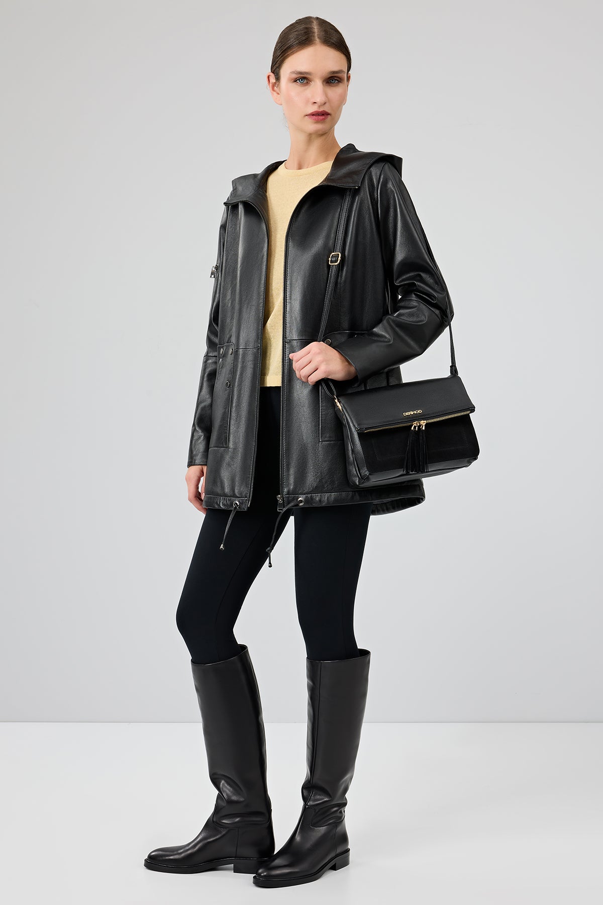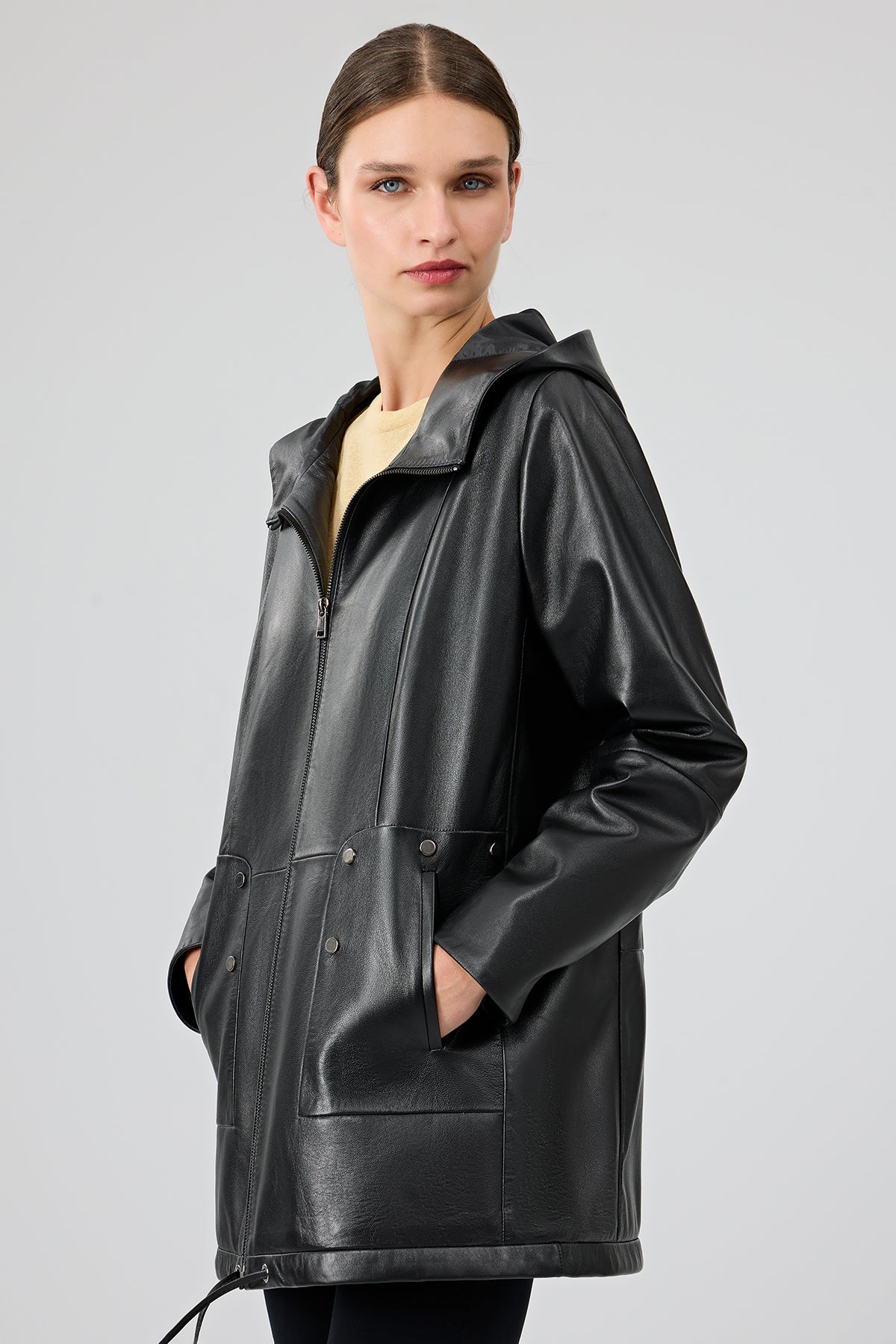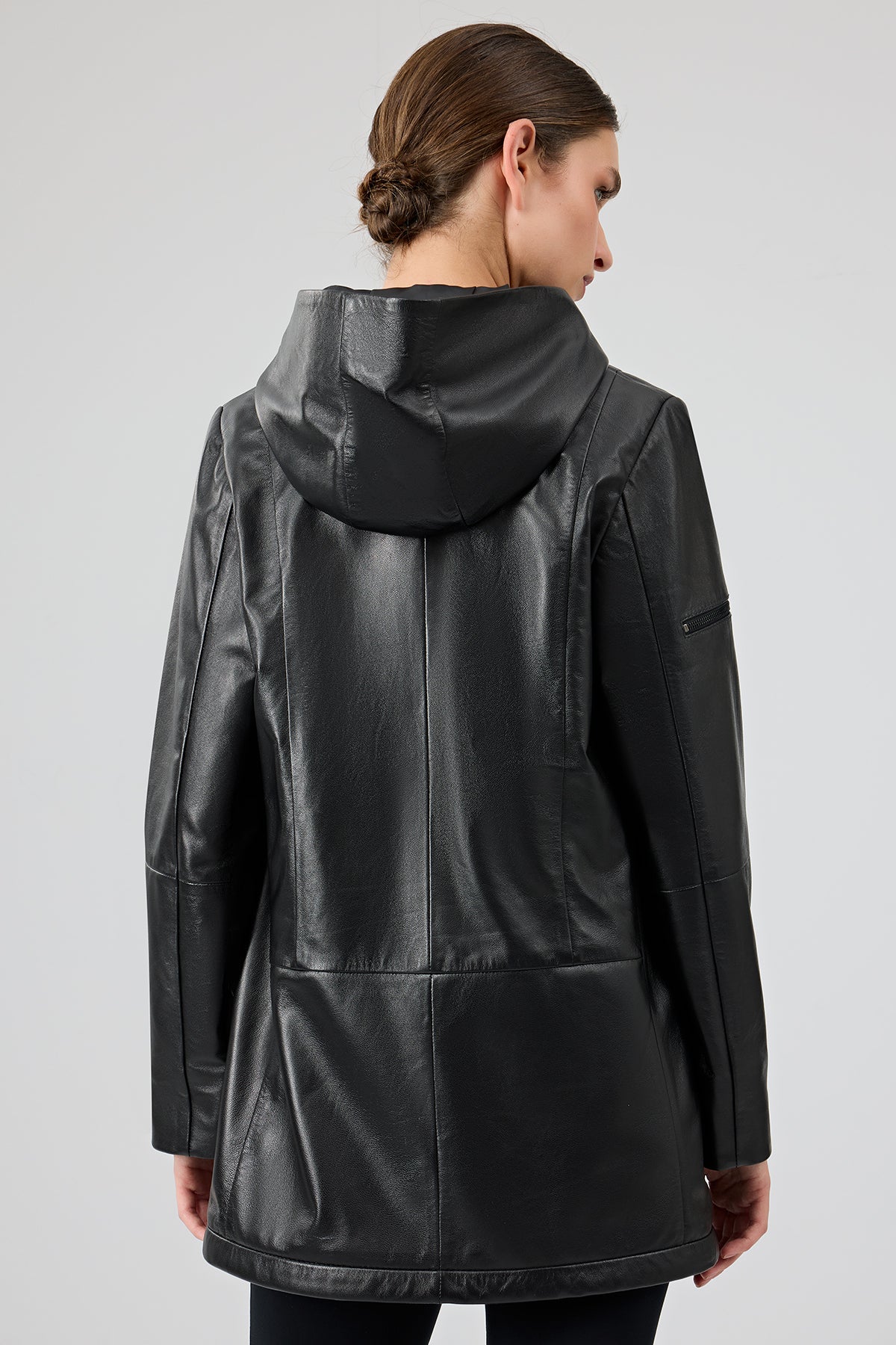 پالتو چرمی زنانه مشکی کلاه دار Cindy دری مد