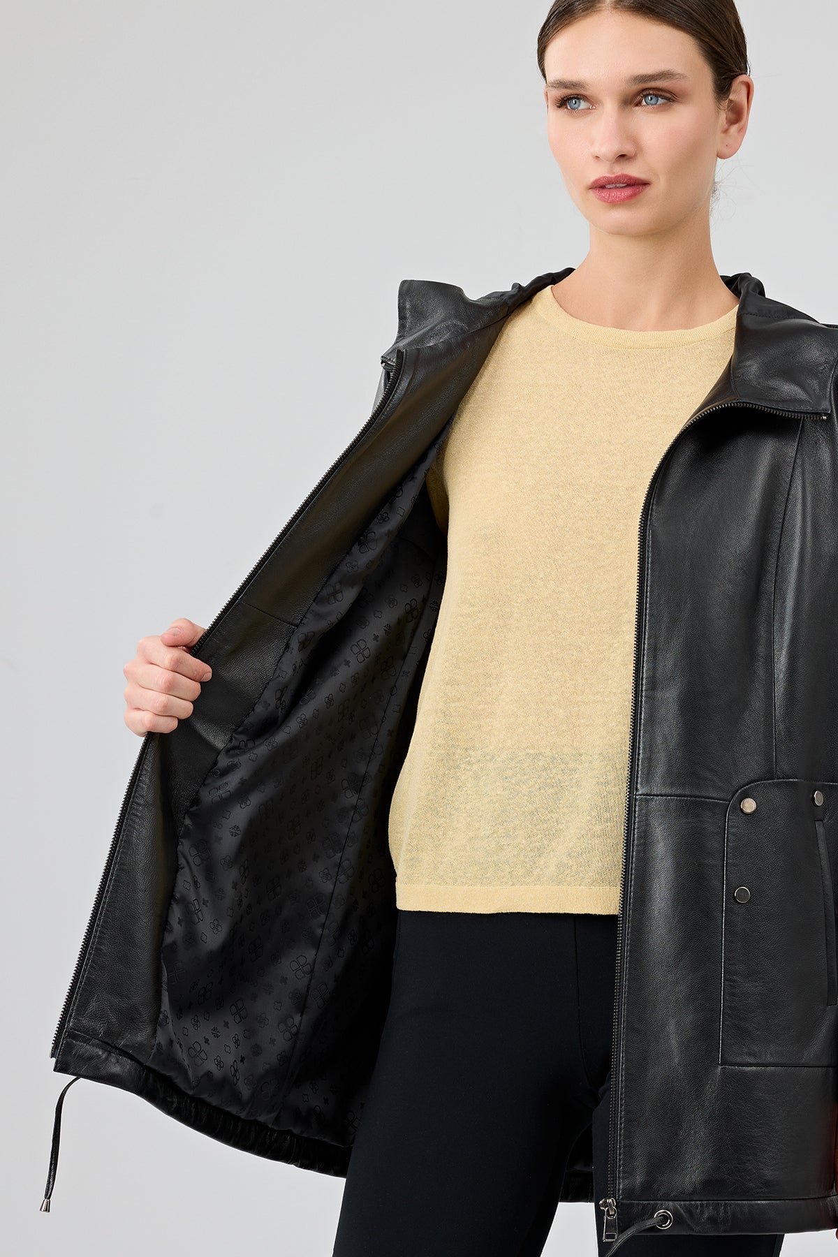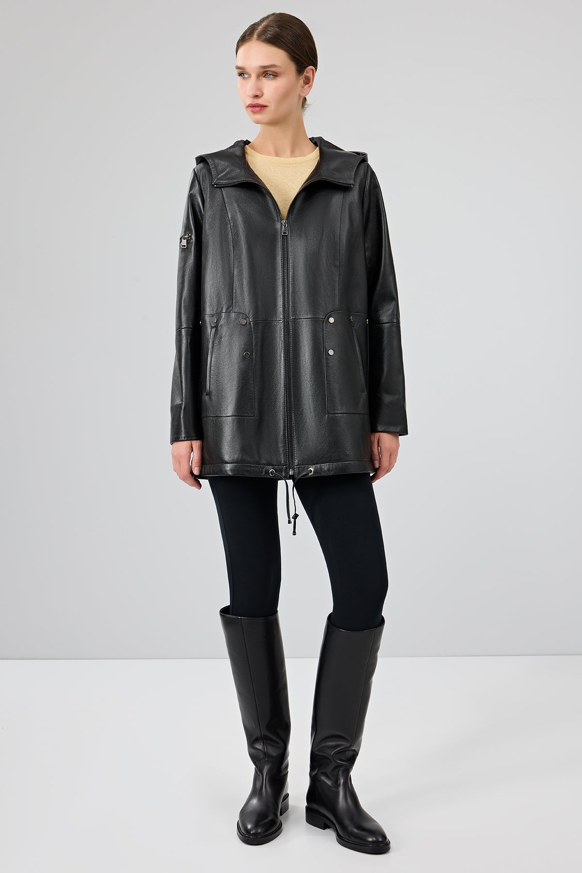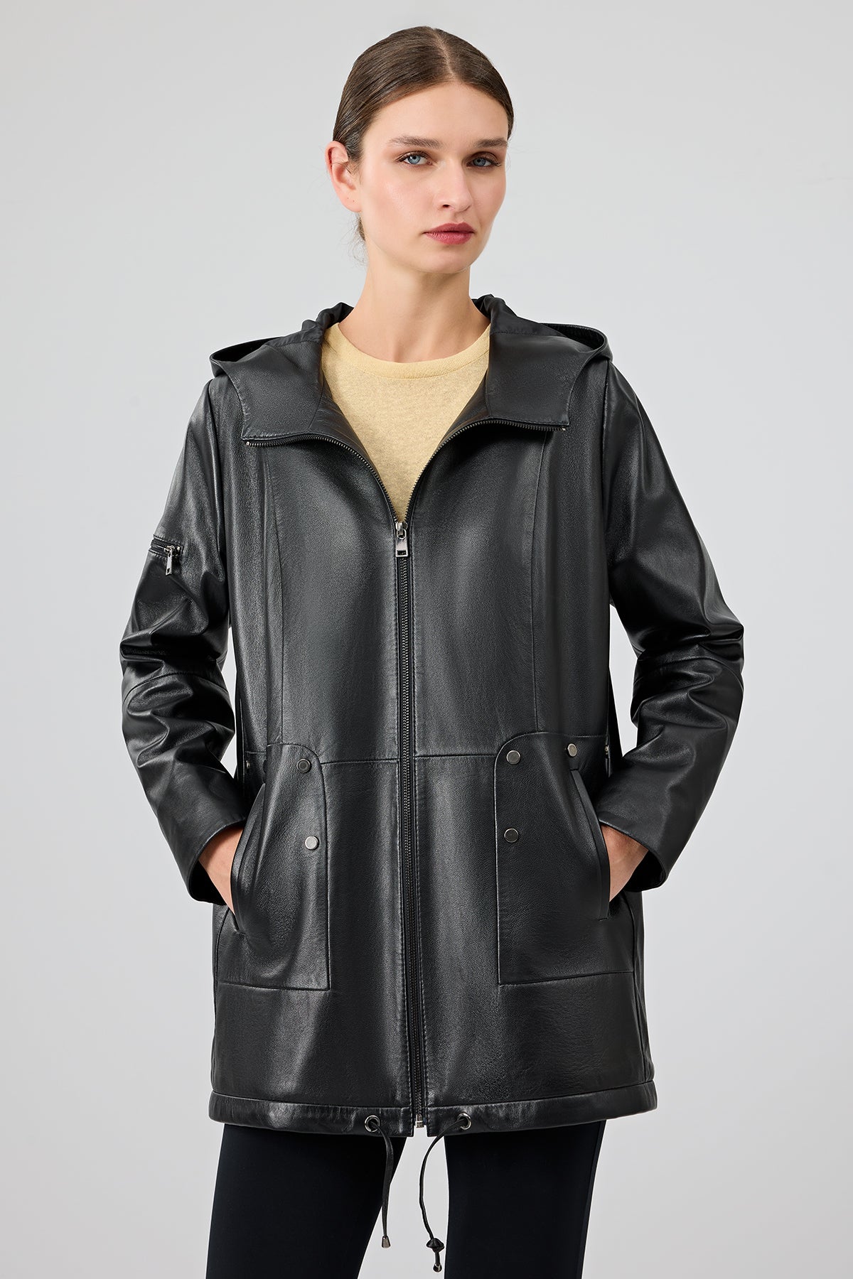 پالتو چرمی زنانه مشکی کلاه دار Cindy دری مد