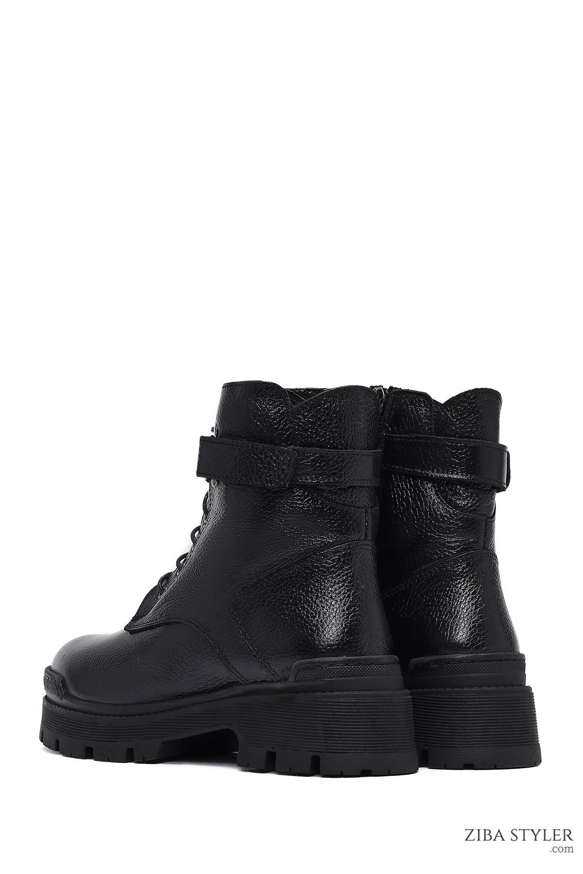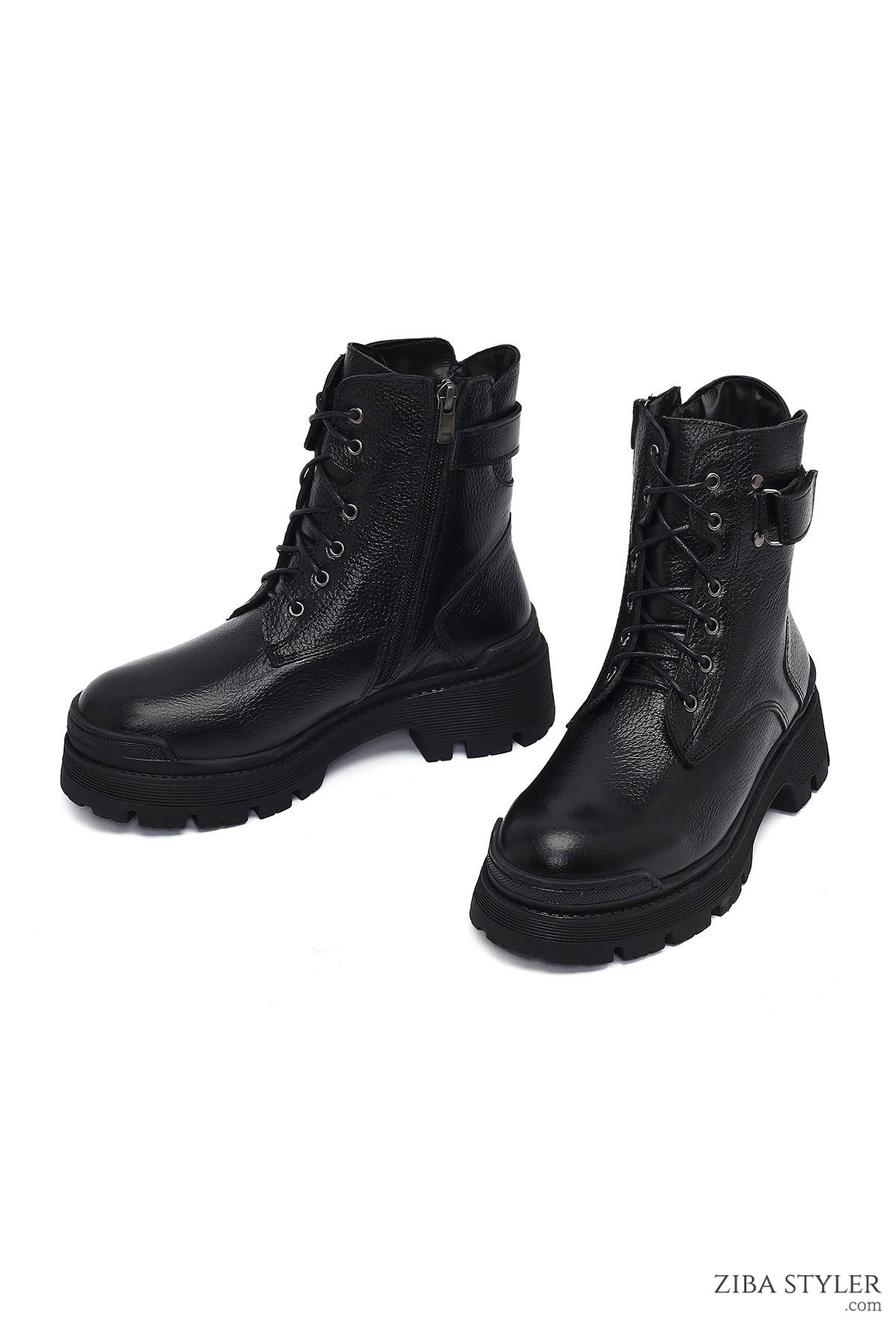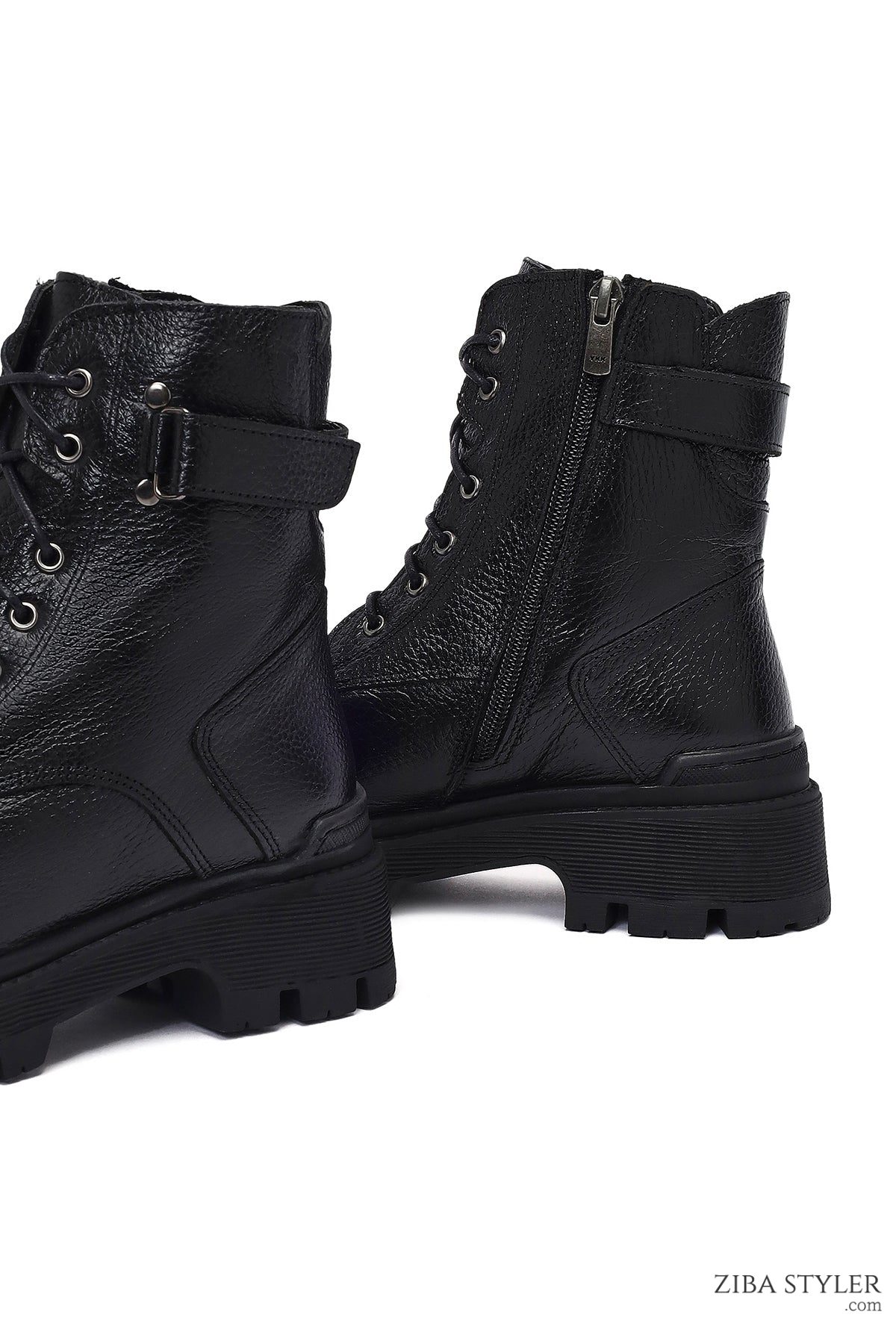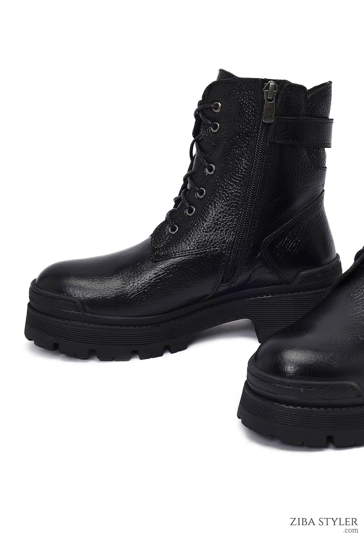 بوت پستال زنانه چرمی مشکی بند دار زیپ دار کفی ضخیم دری مد