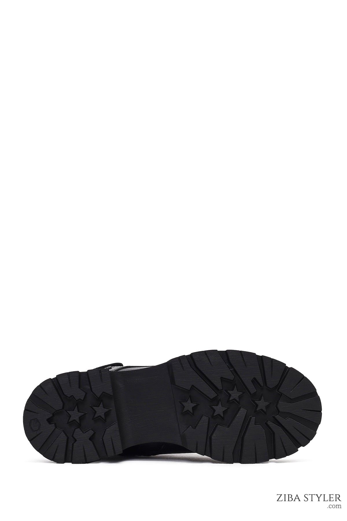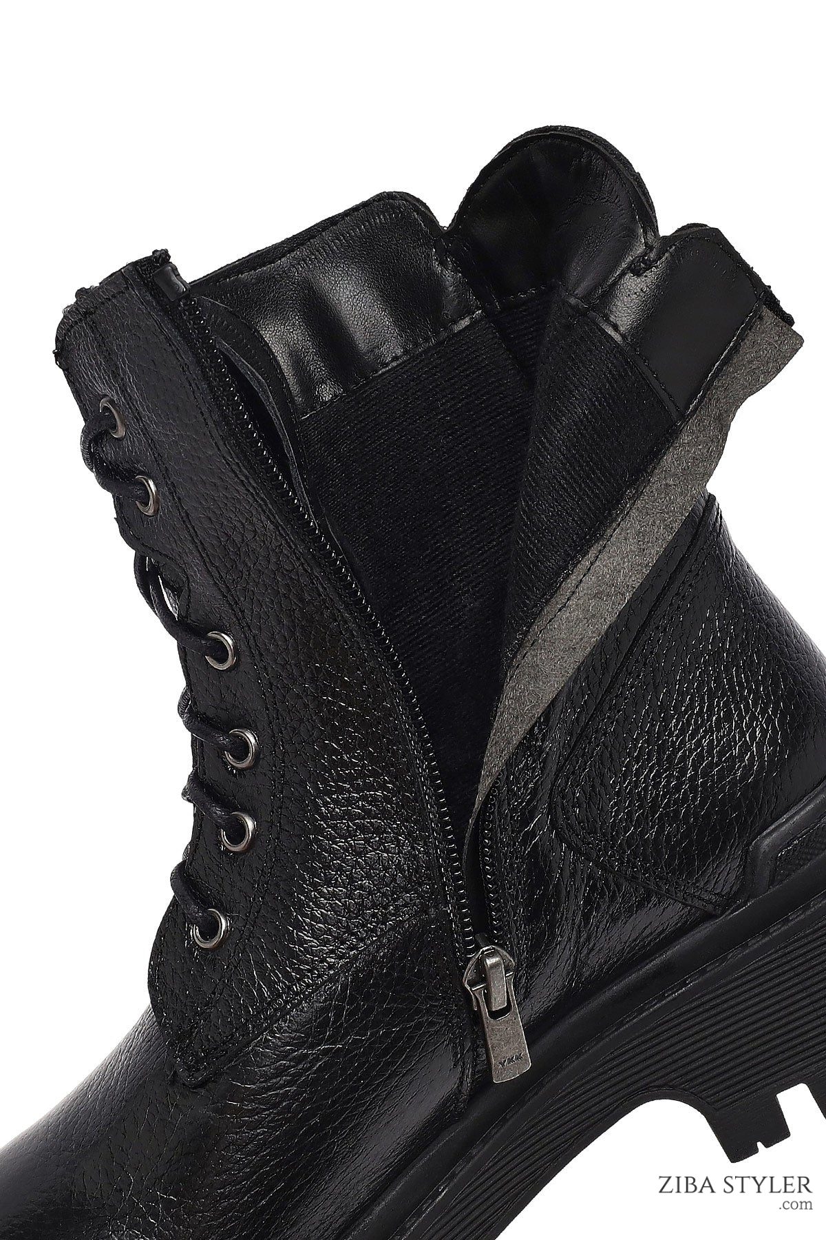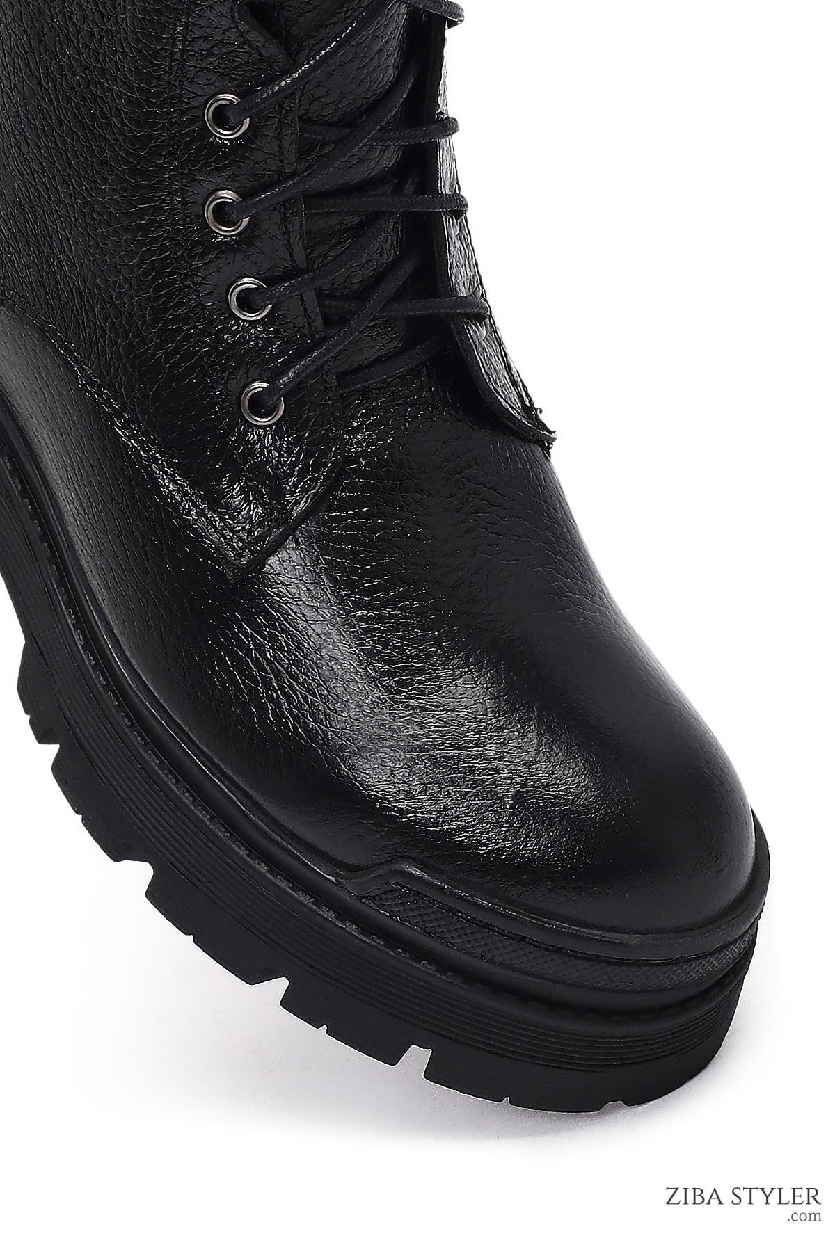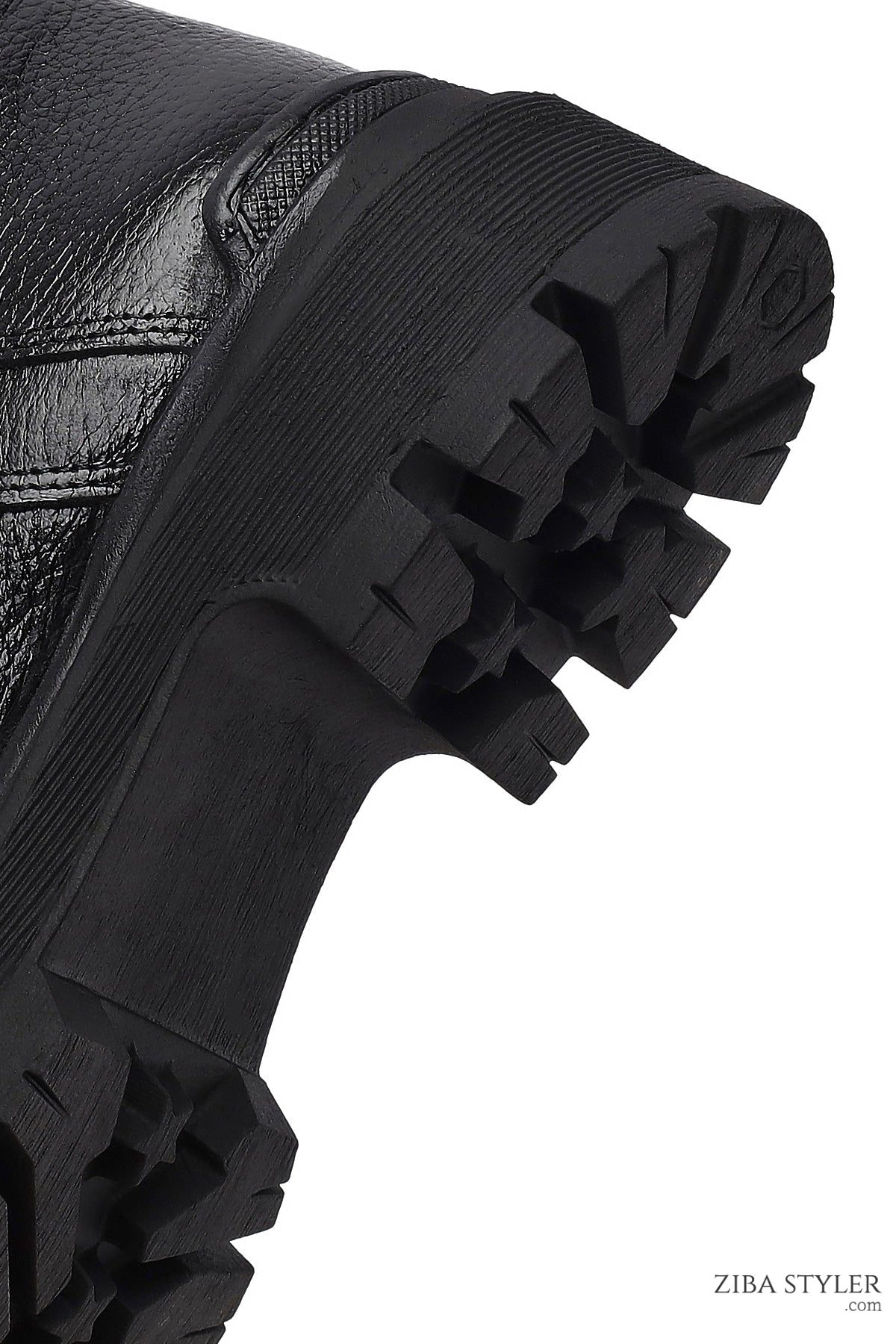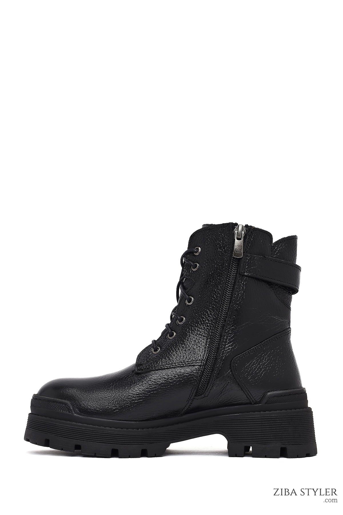 بوت پستال زنانه چرمی مشکی بند دار زیپ دار کفی ضخیم دری مد