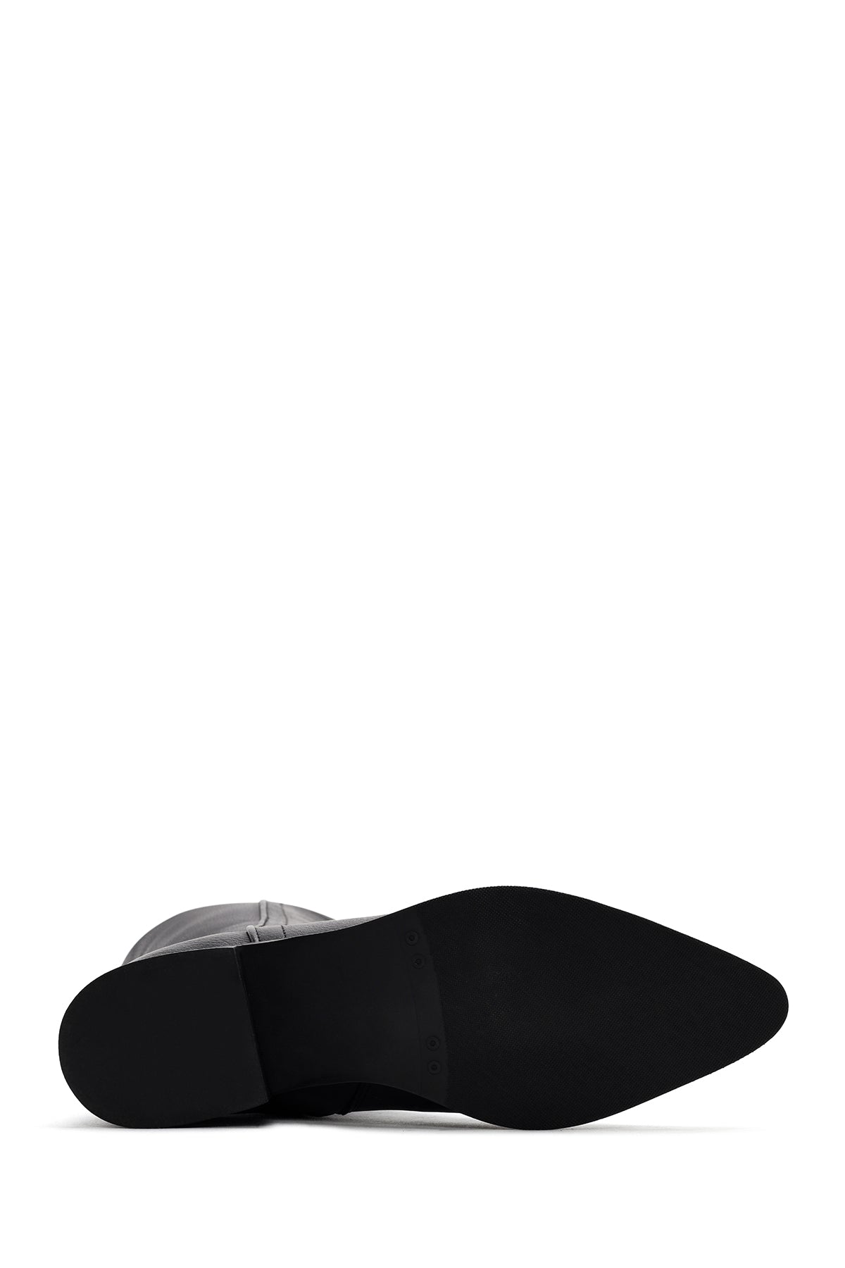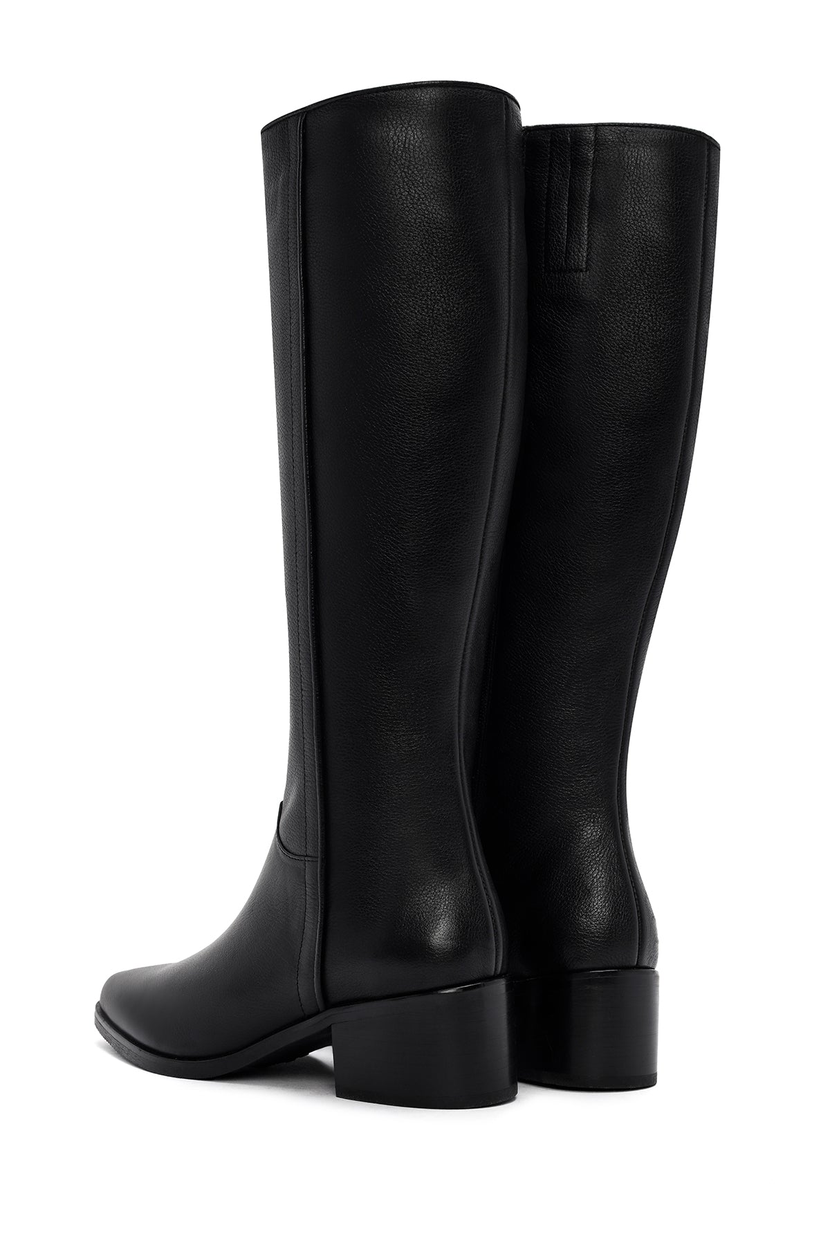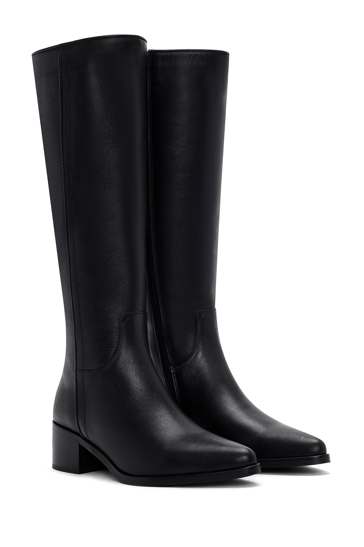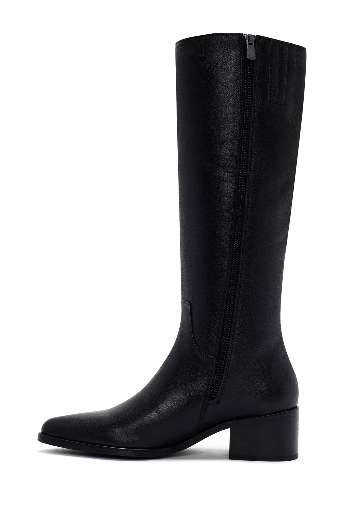 Kadın Siyah Fermuarlı Kalın Topuklu Deri Çizme