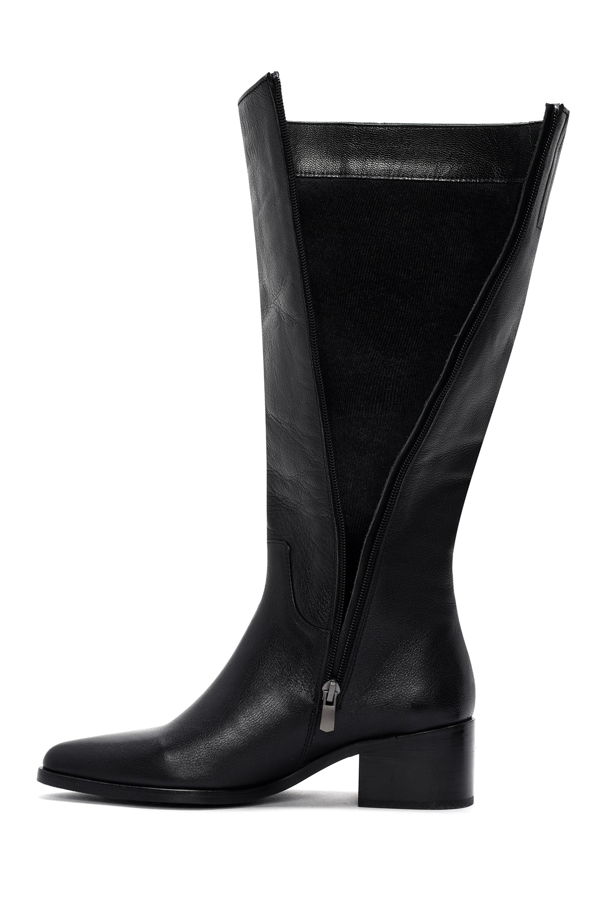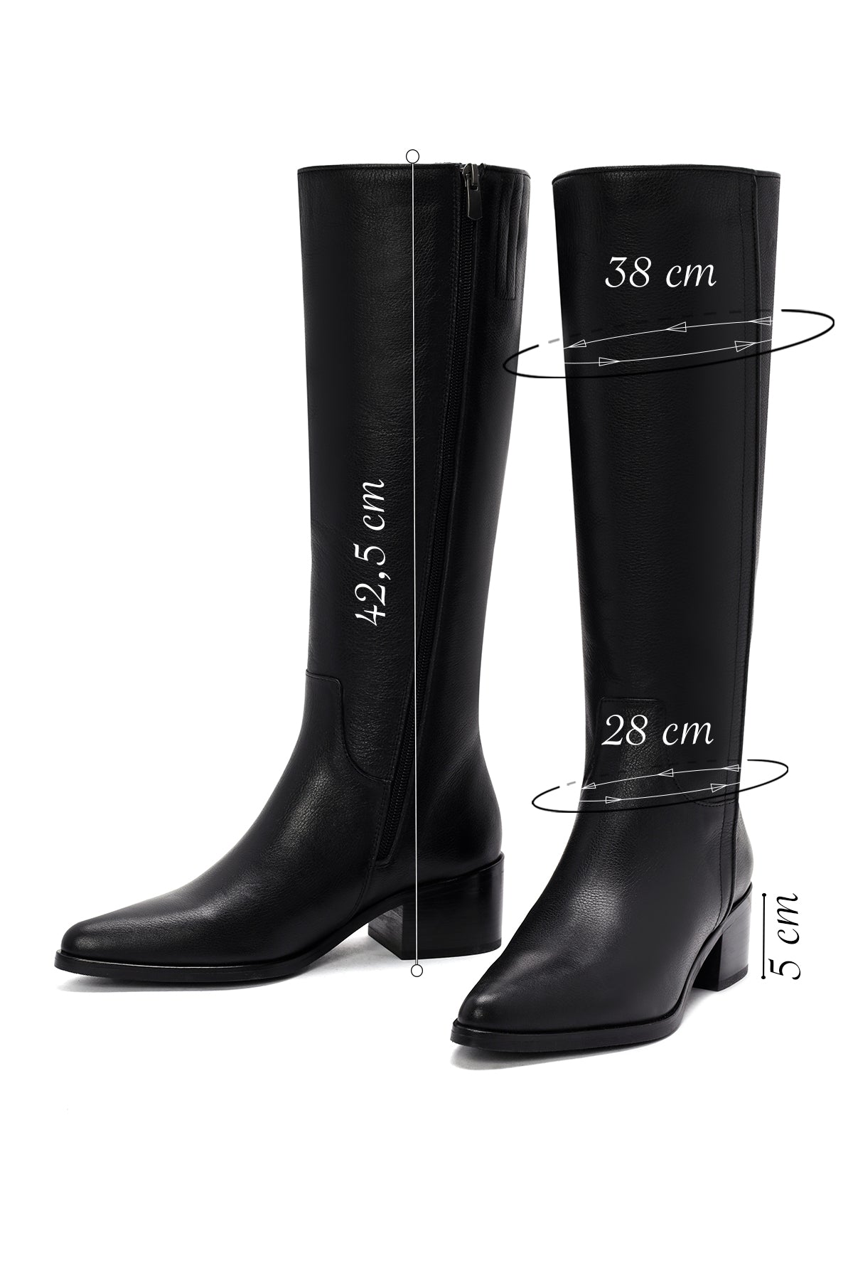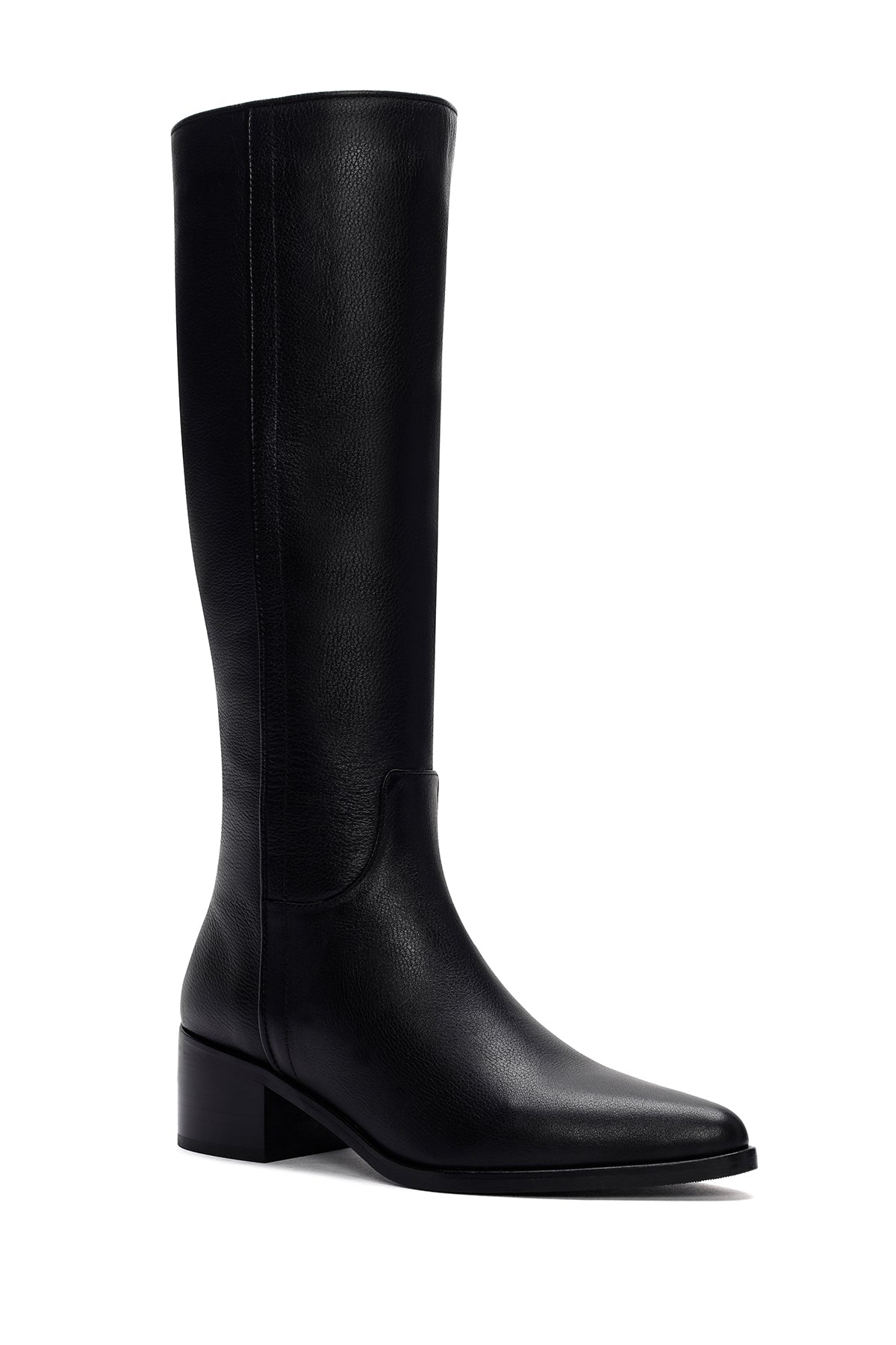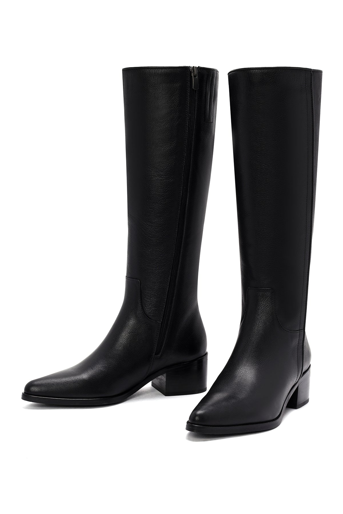 Kadın Siyah Fermuarlı Kalın Topuklu Deri Çizme