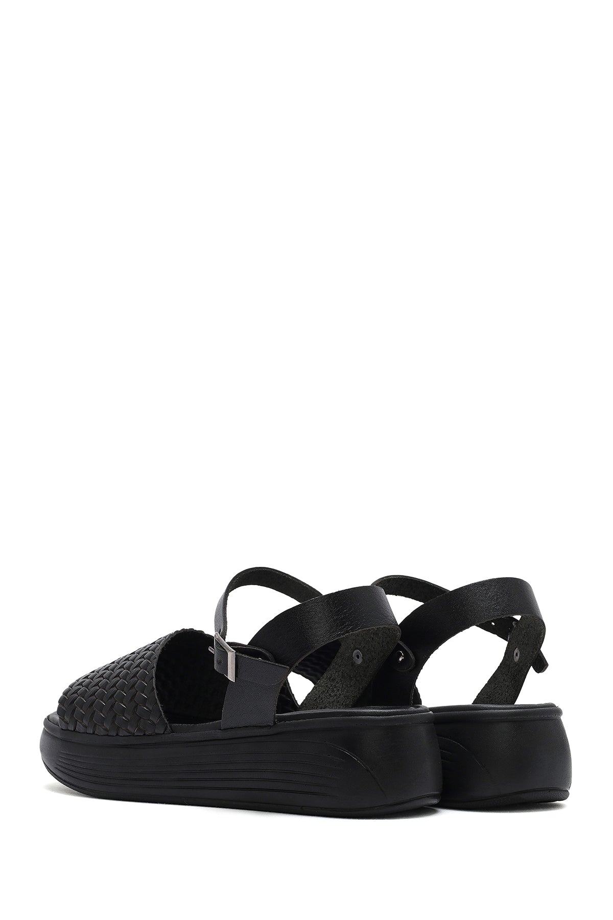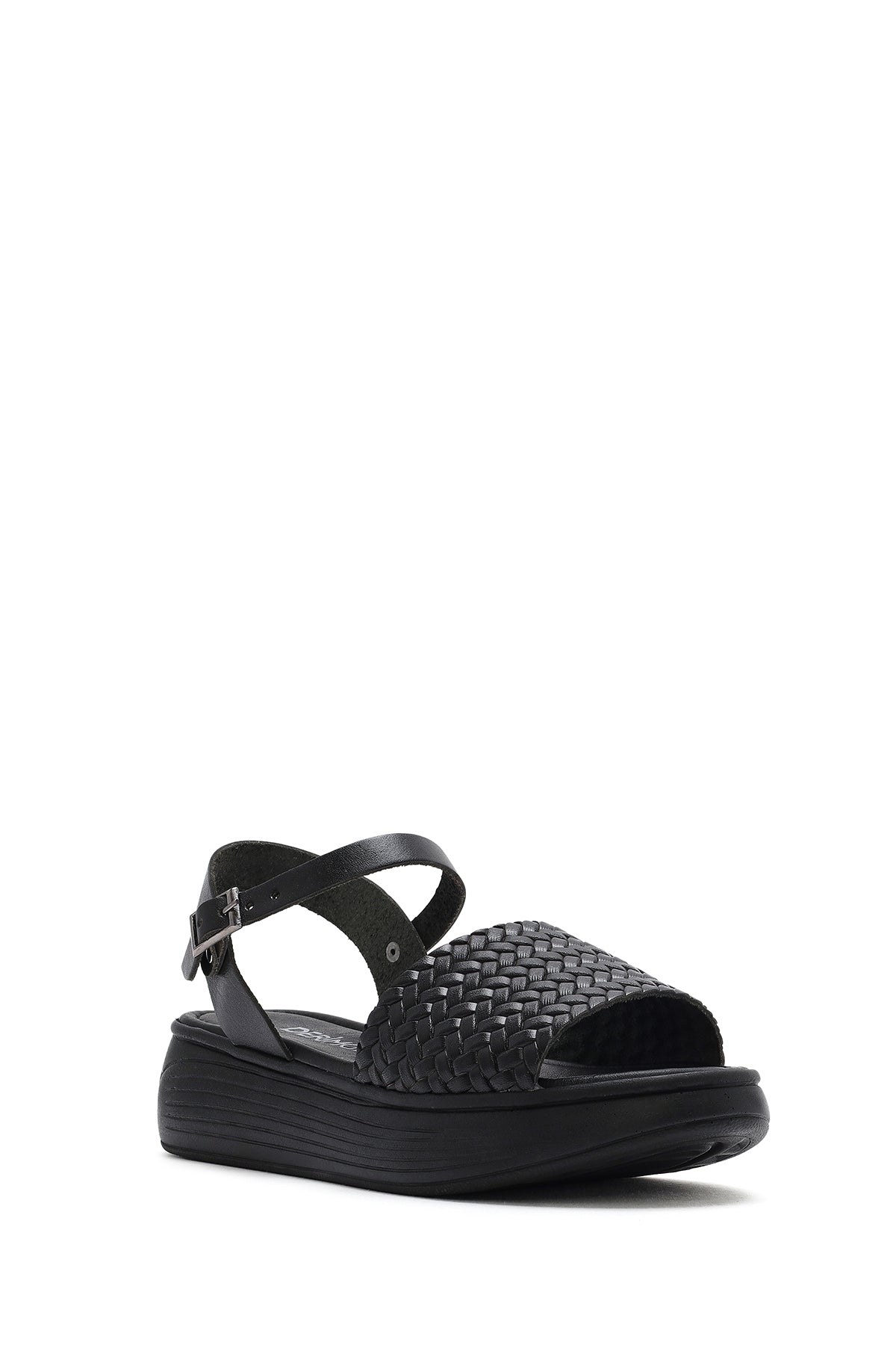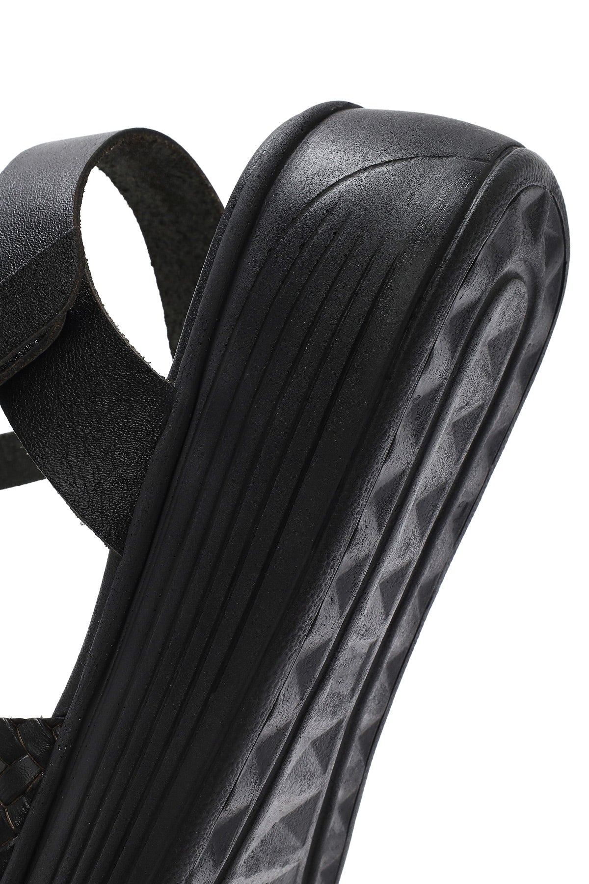 Kadın Siyah Bilekten Bağlamalı Örgülü Kalın Tabanlı Deri Sandalet