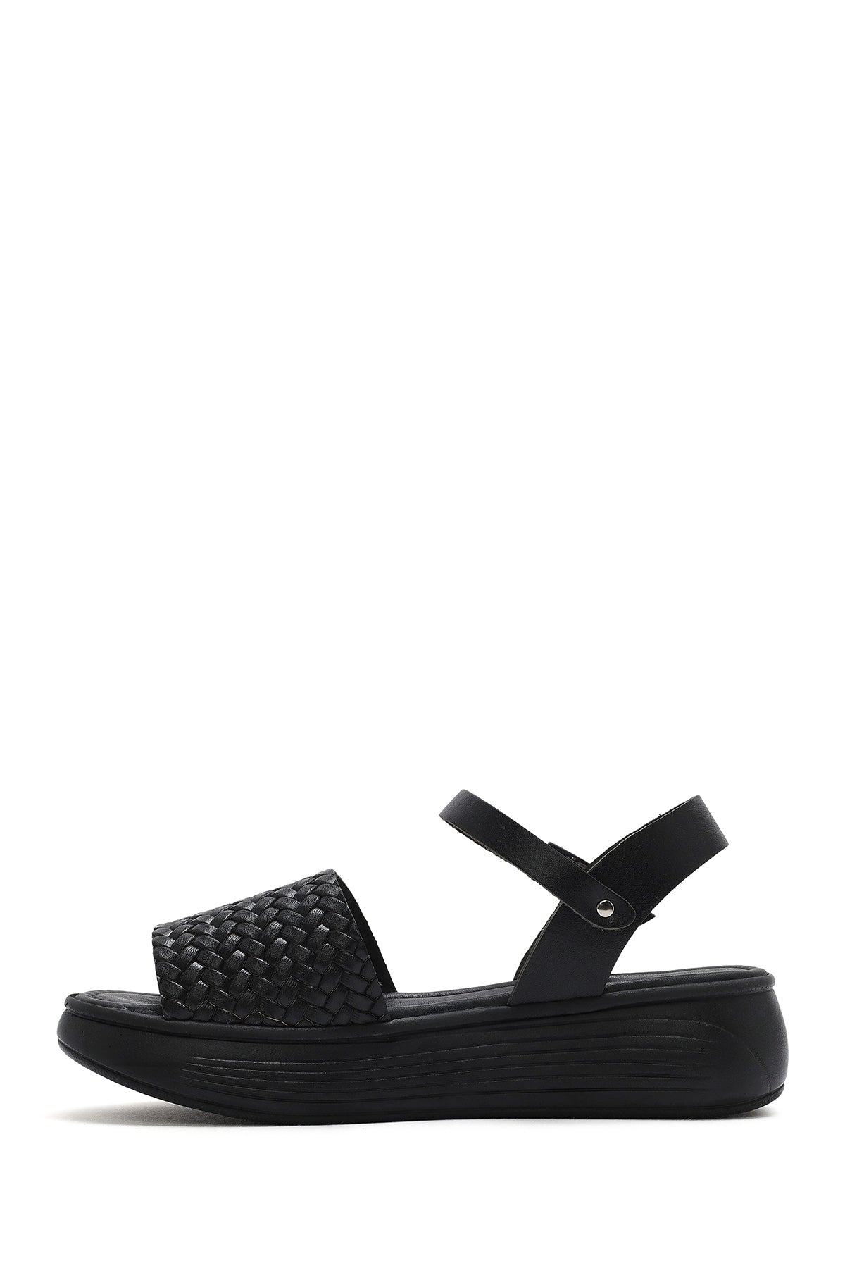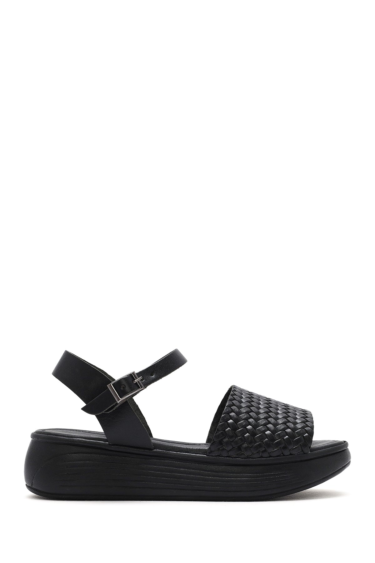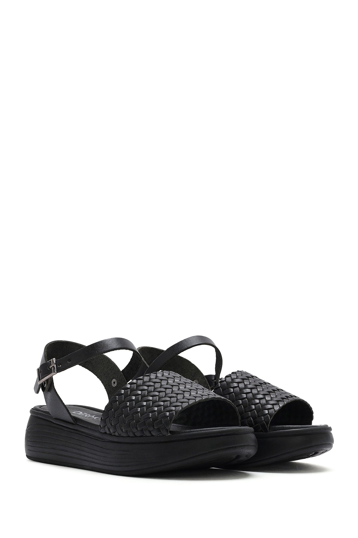 Kadın Siyah Bilekten Bağlamalı Örgülü Kalın Tabanlı Deri Sandalet