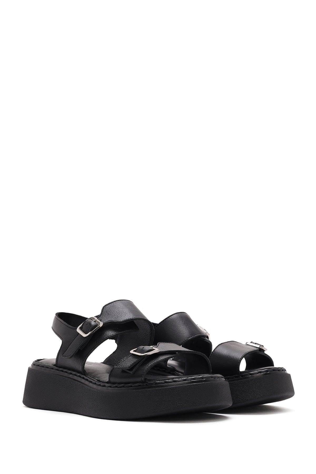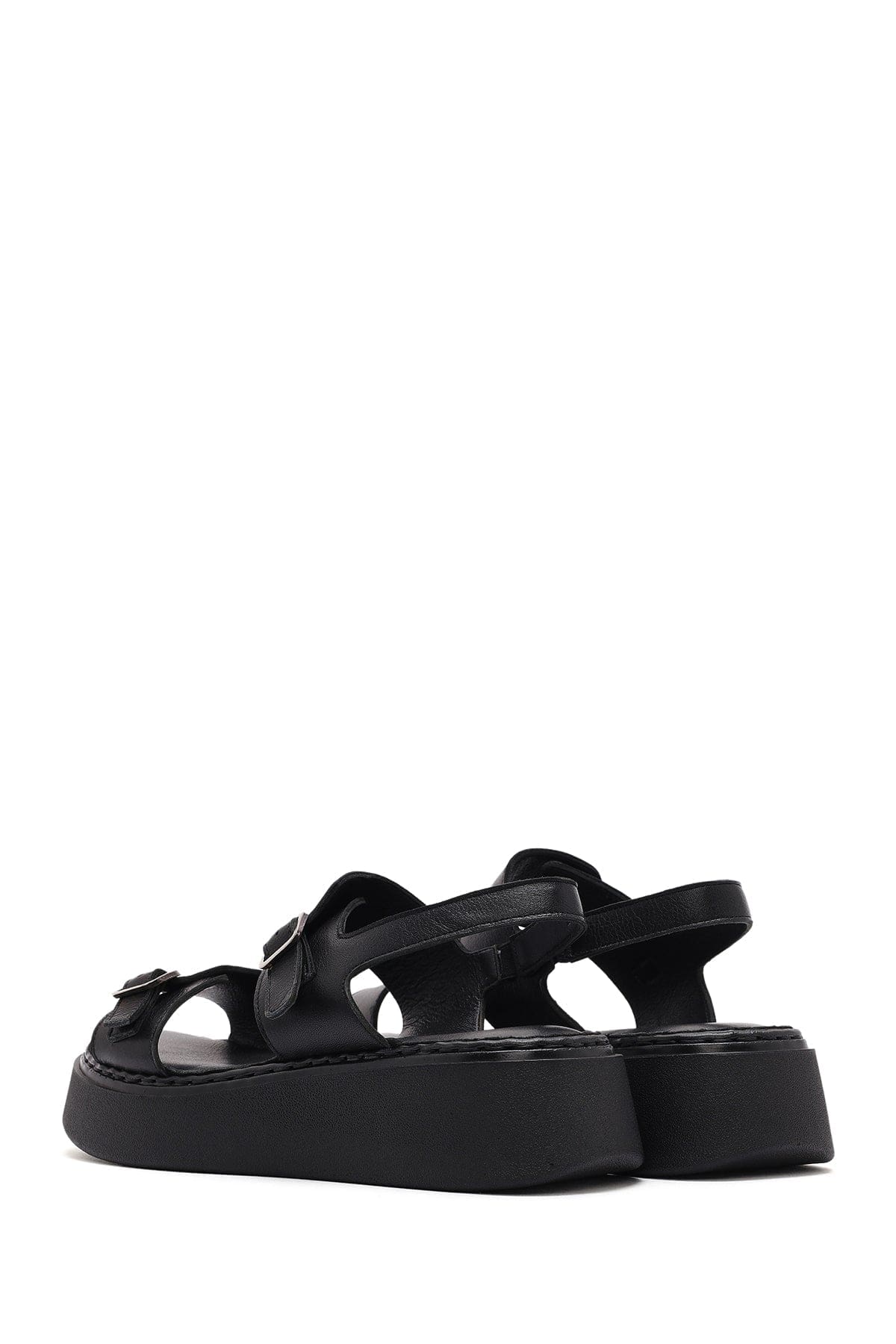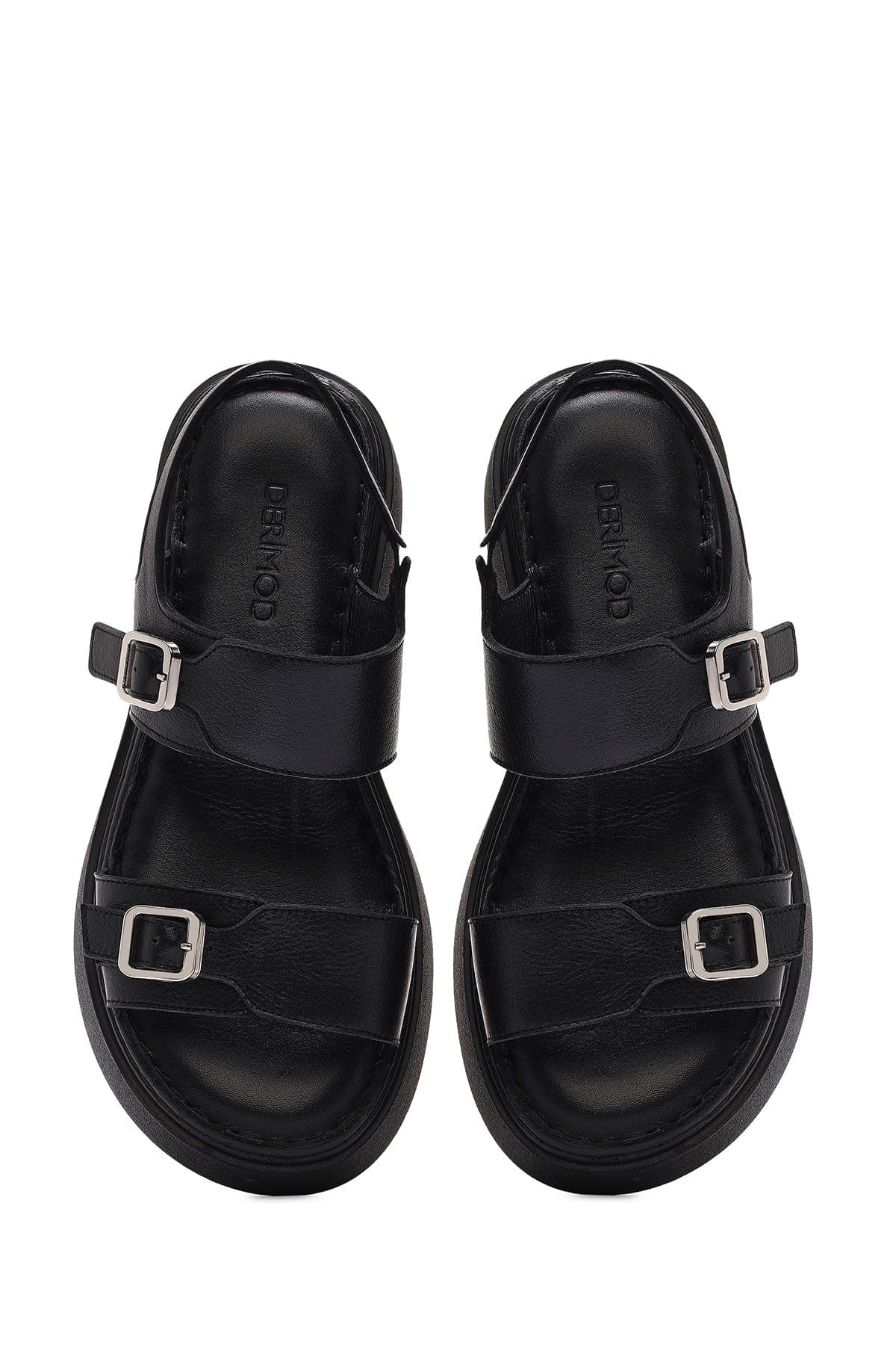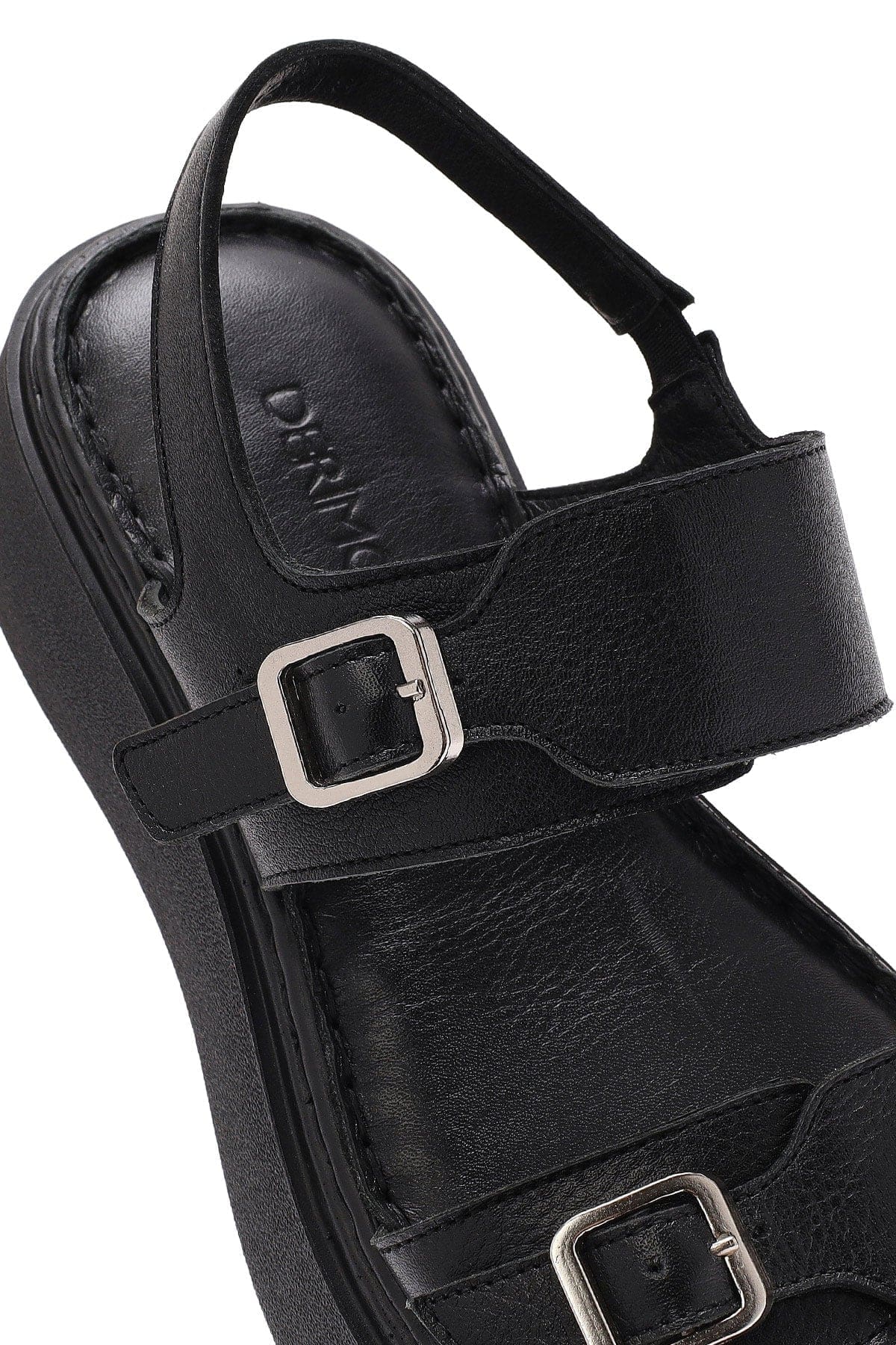 Kadın Siyah Tokalı Kalın Tabanlı Deri Comfort Sandalet