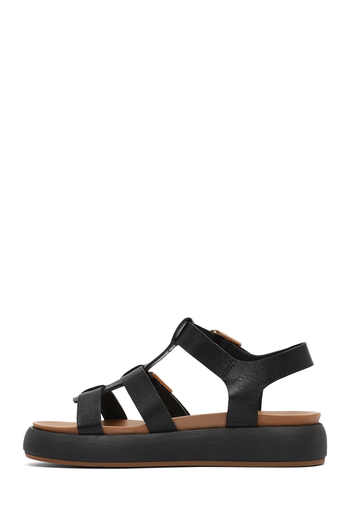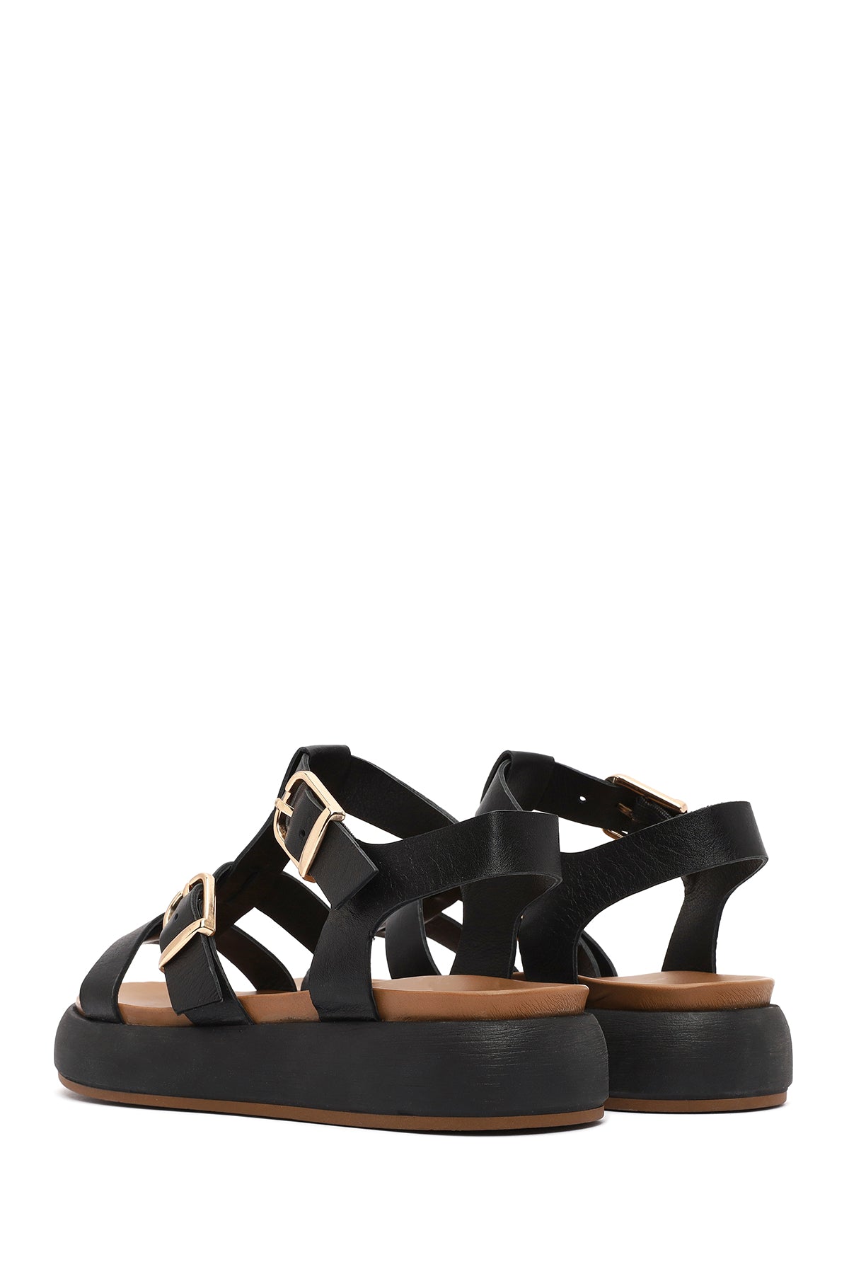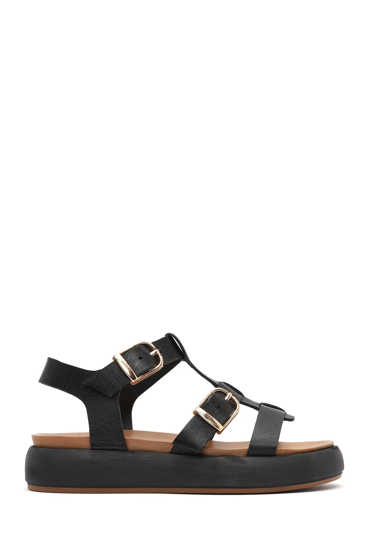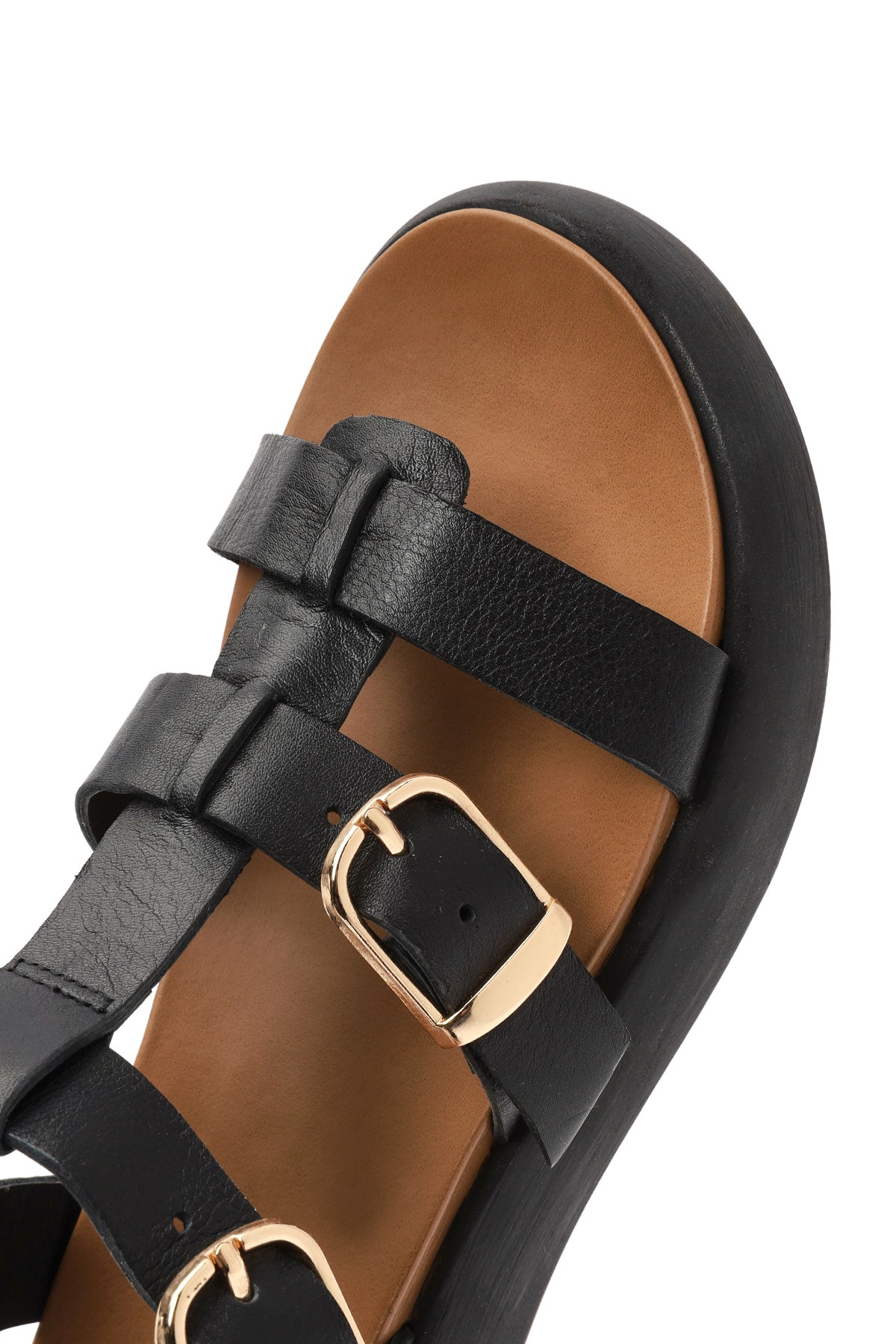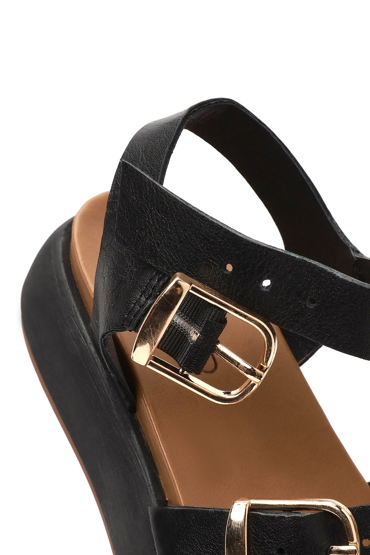 Kadın Siyah Tokalı Kalın Tabanlı Deri Sandalet