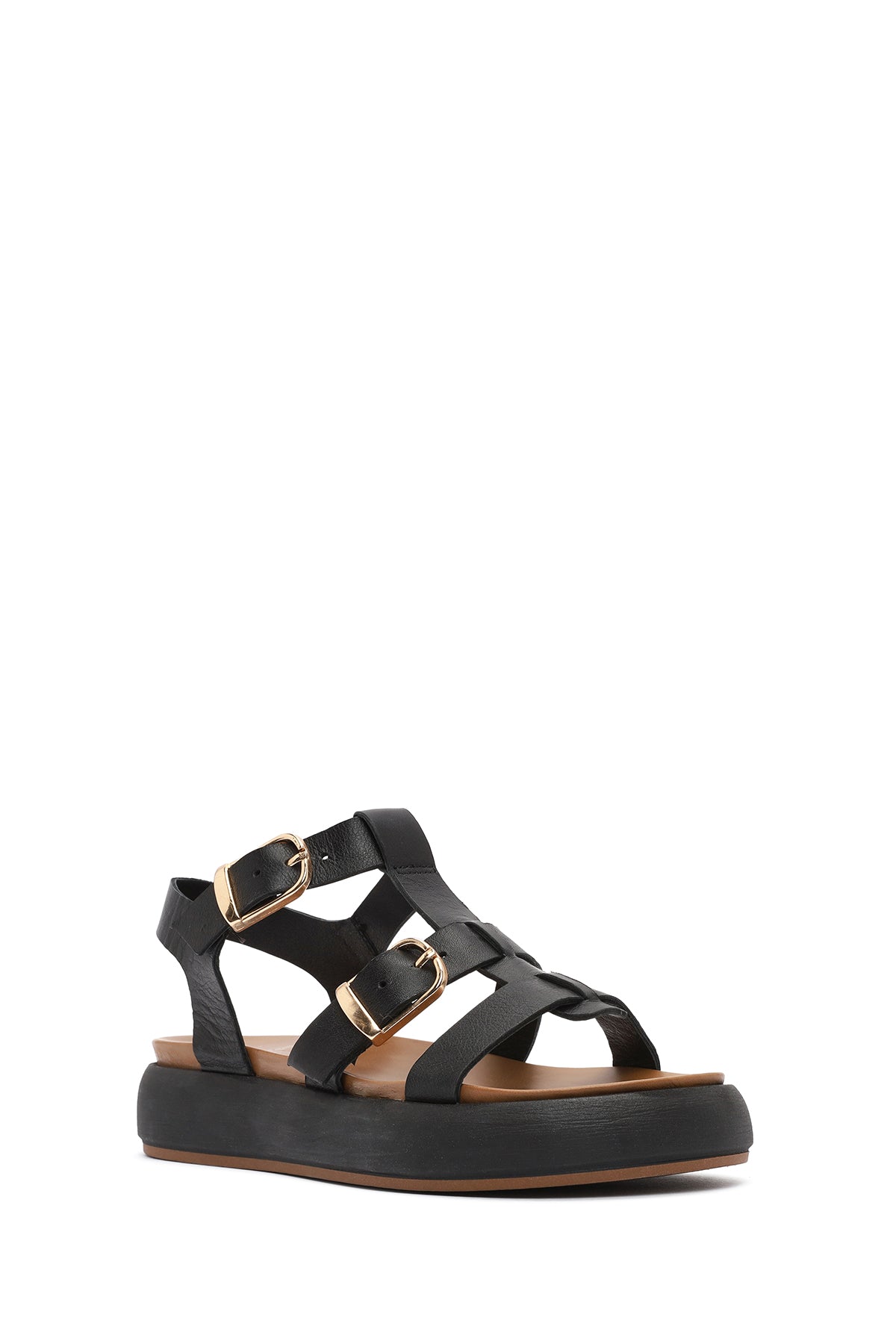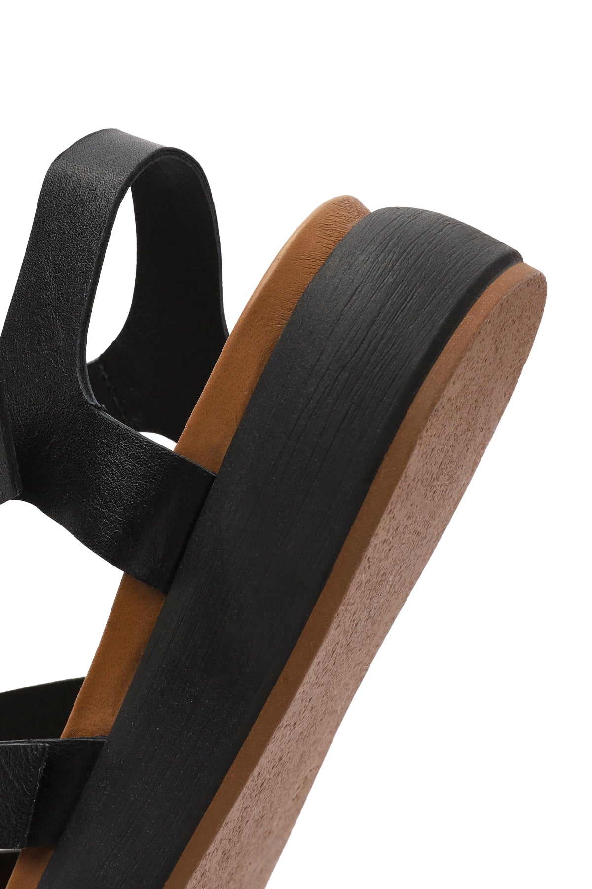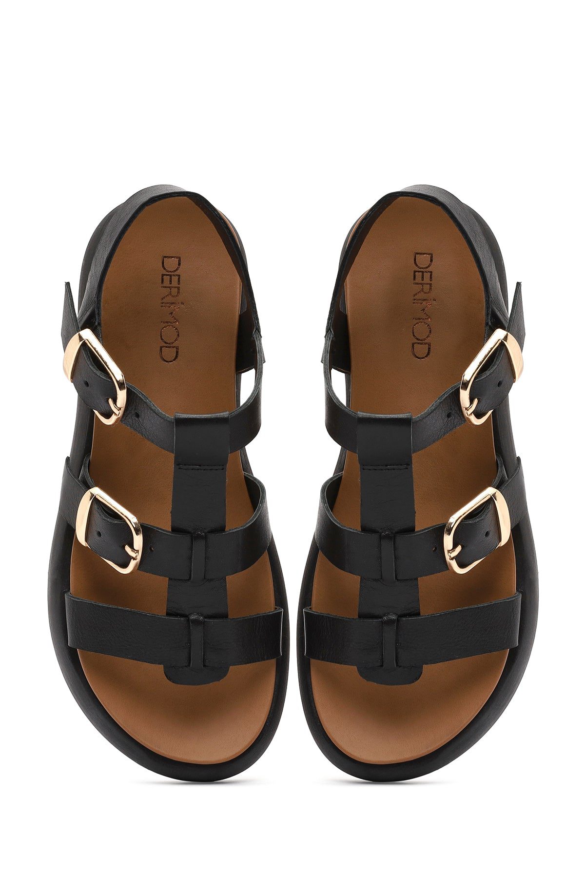 صندل زنانه مشکی چرم سگکدار تخت ضخیم دری مد