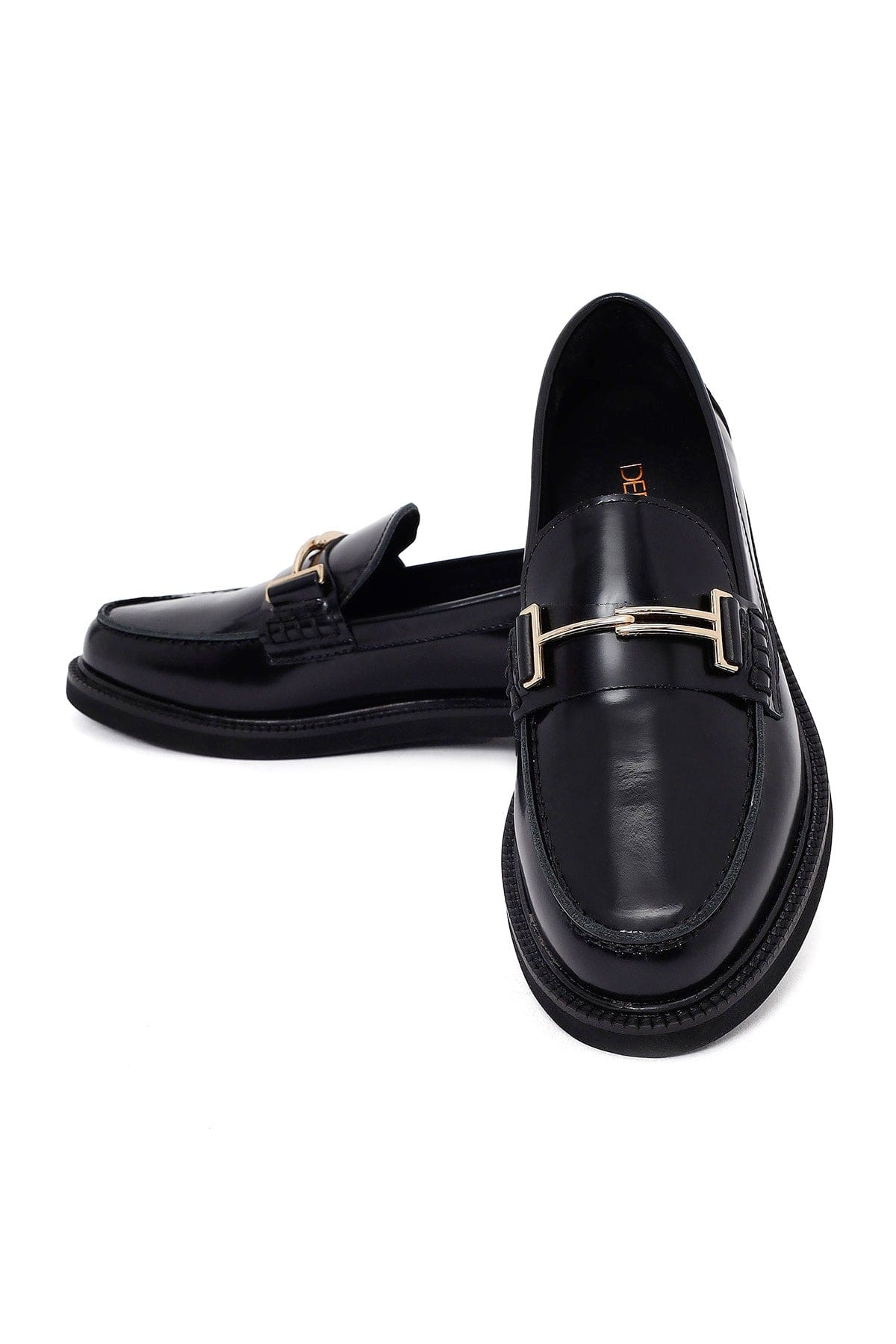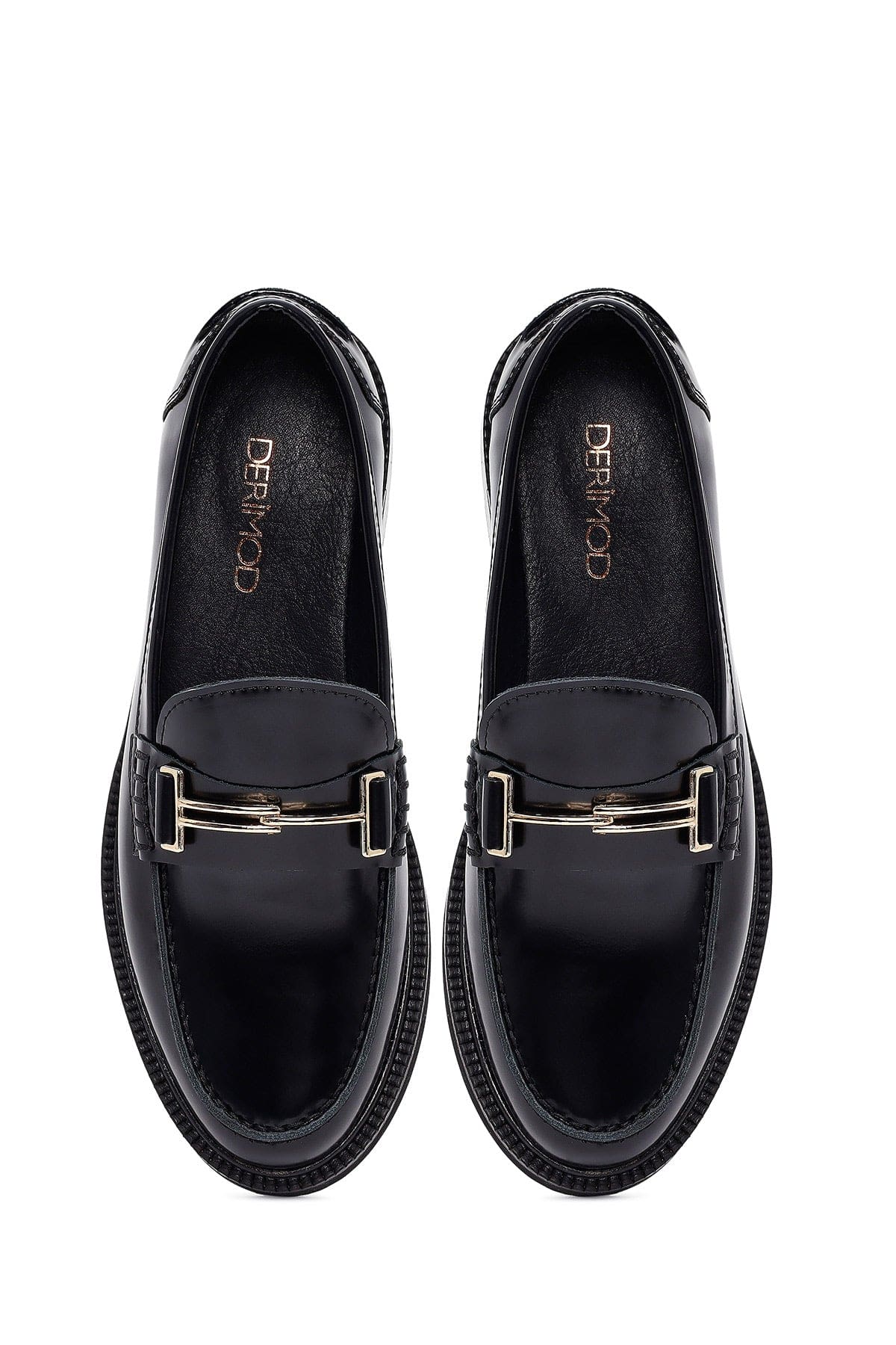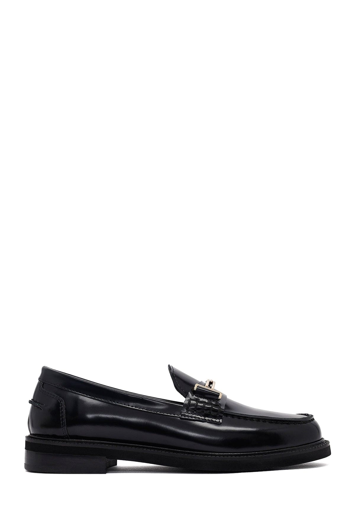 Kadın Siyah Tokalı Deri Maskülen Loafer