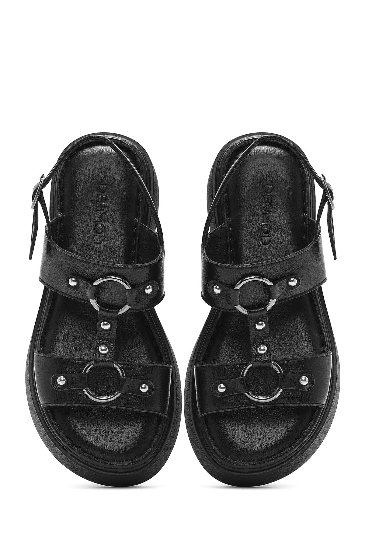 صندل زنانه مشکی چرم بنددار تخت ضخیم راحتی دری مد