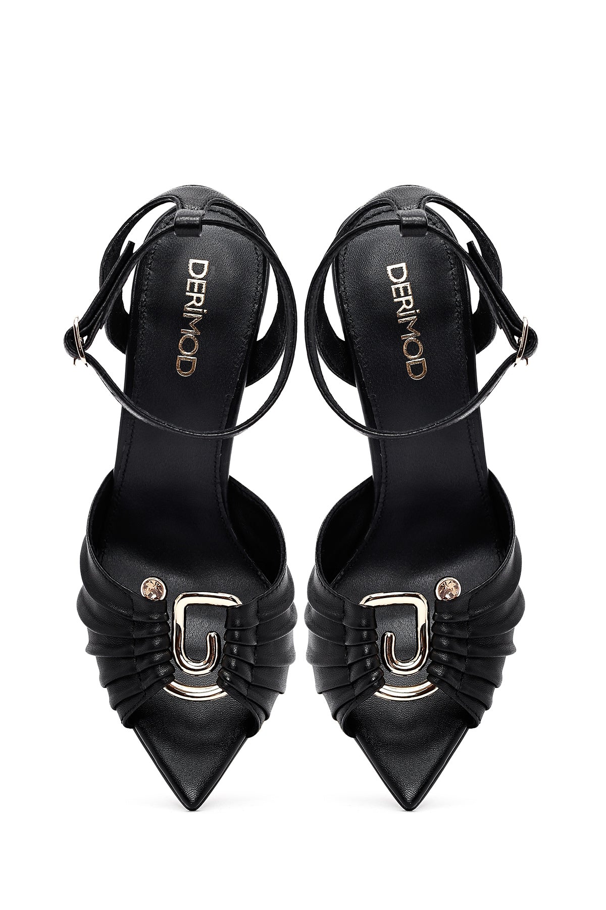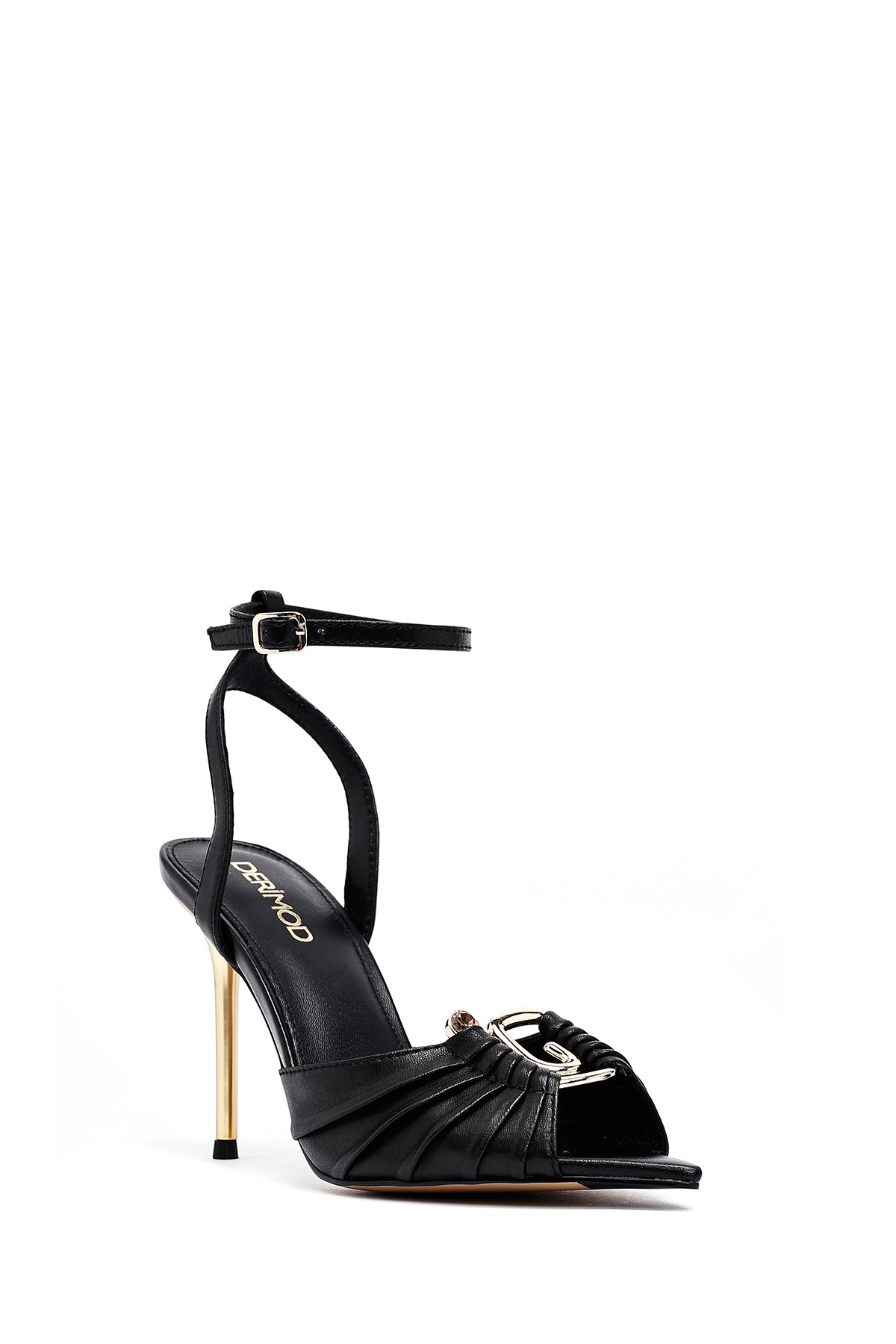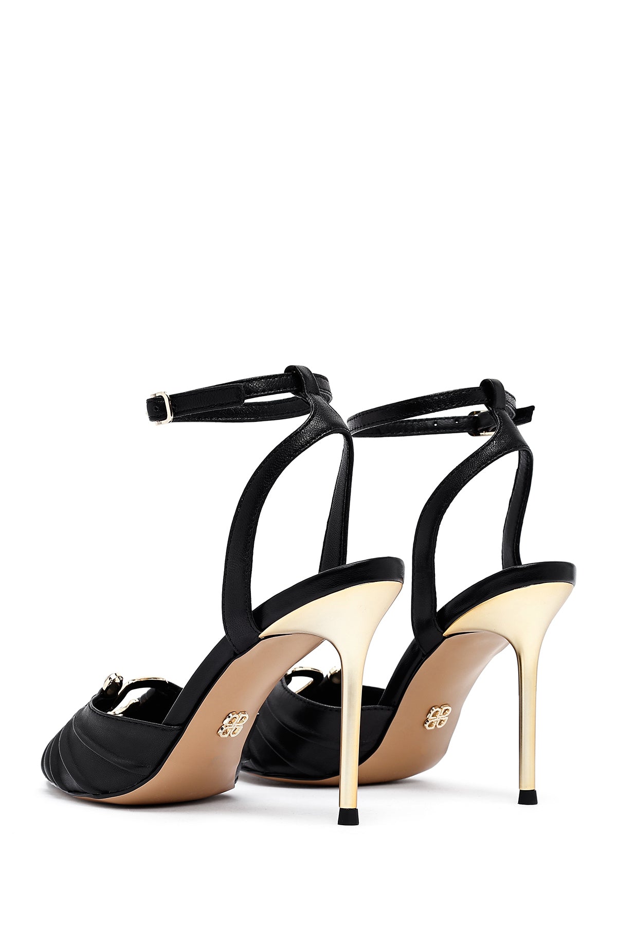 Kadın Siyah Bilekten Tokalı Yüksek İnce Topuklu Deri Sandalet