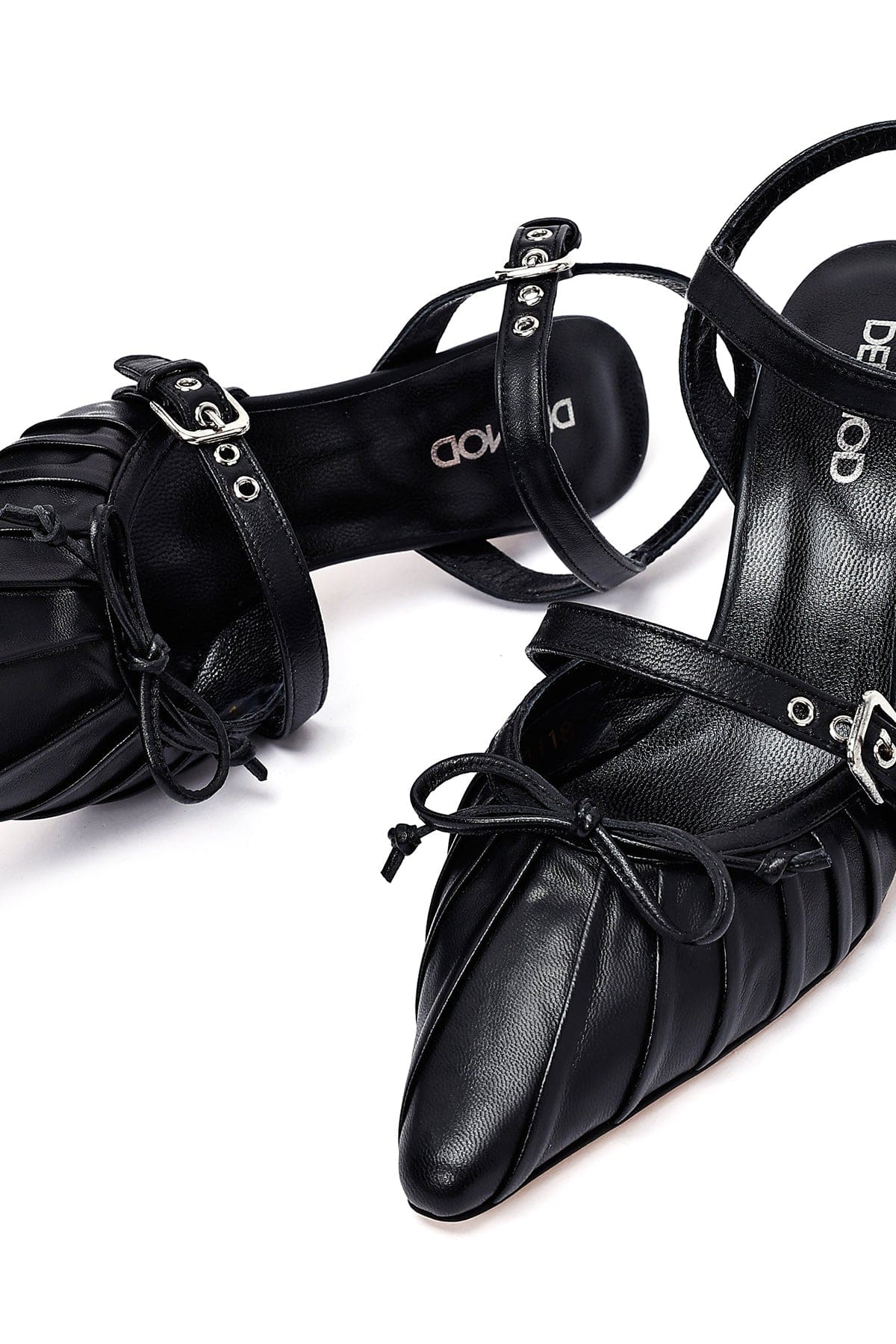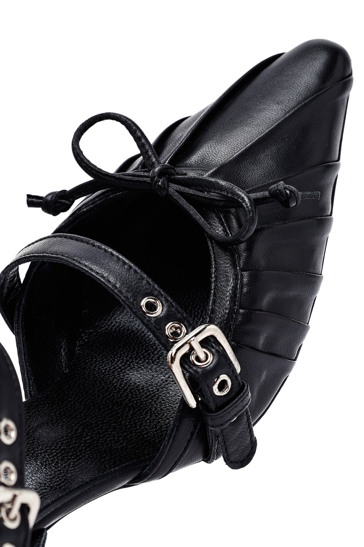 کفش زنانه مشکی چرم پاشنه نازک پشت باز بنددار دری مد