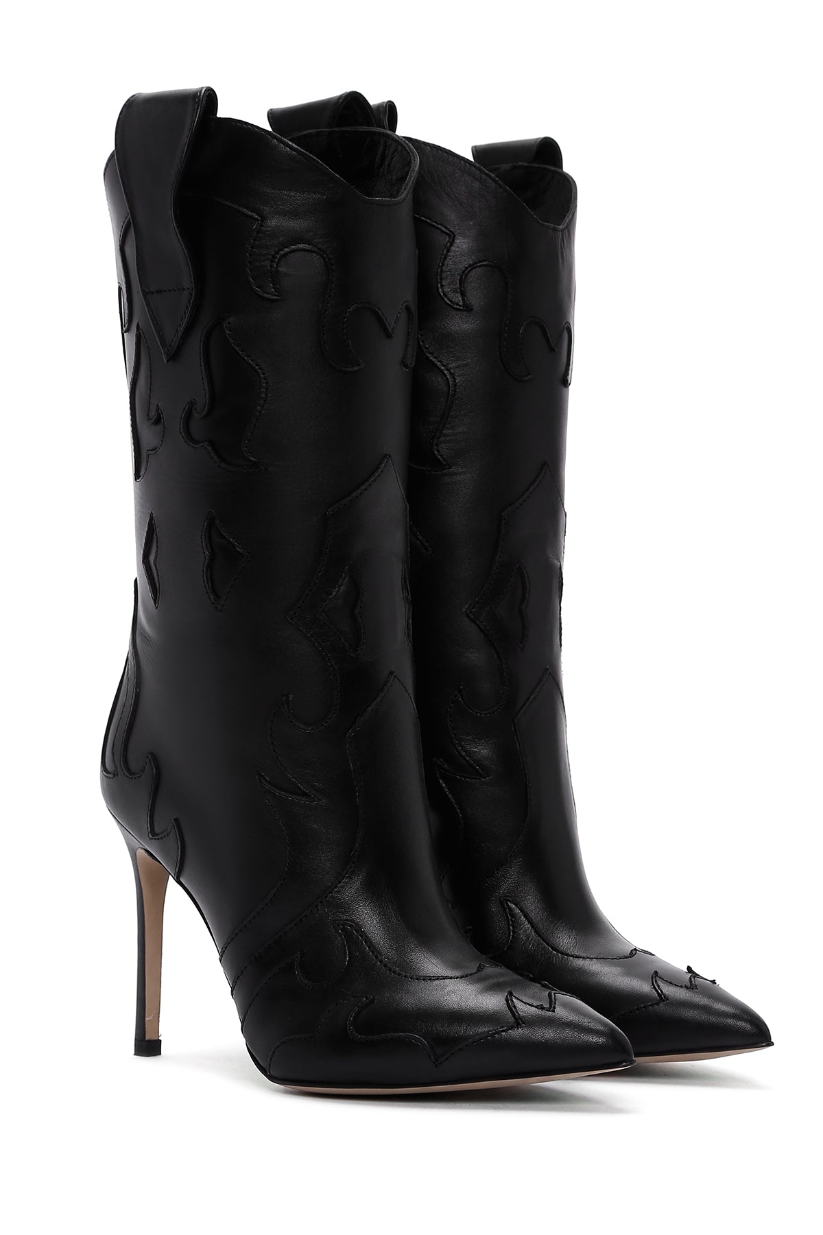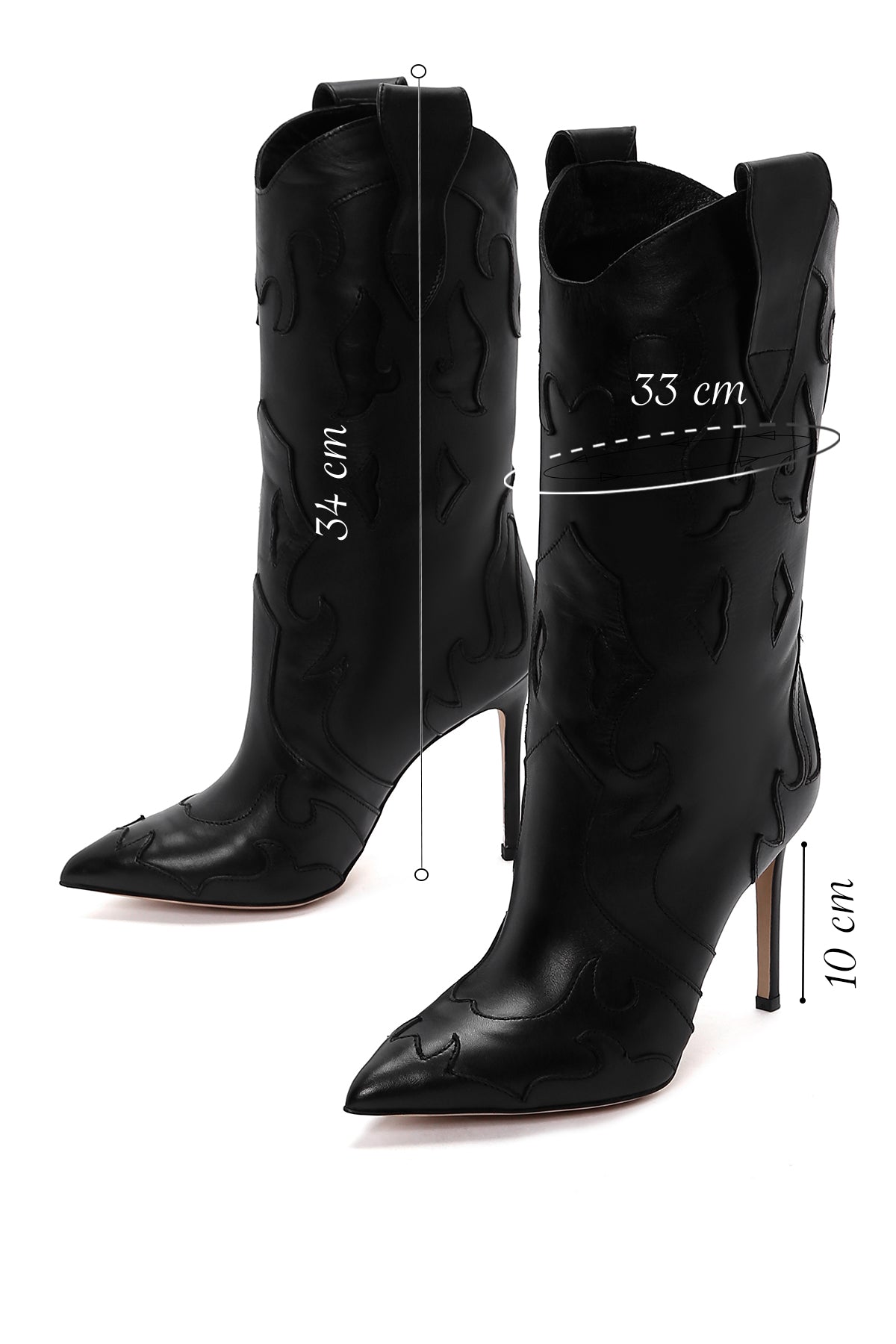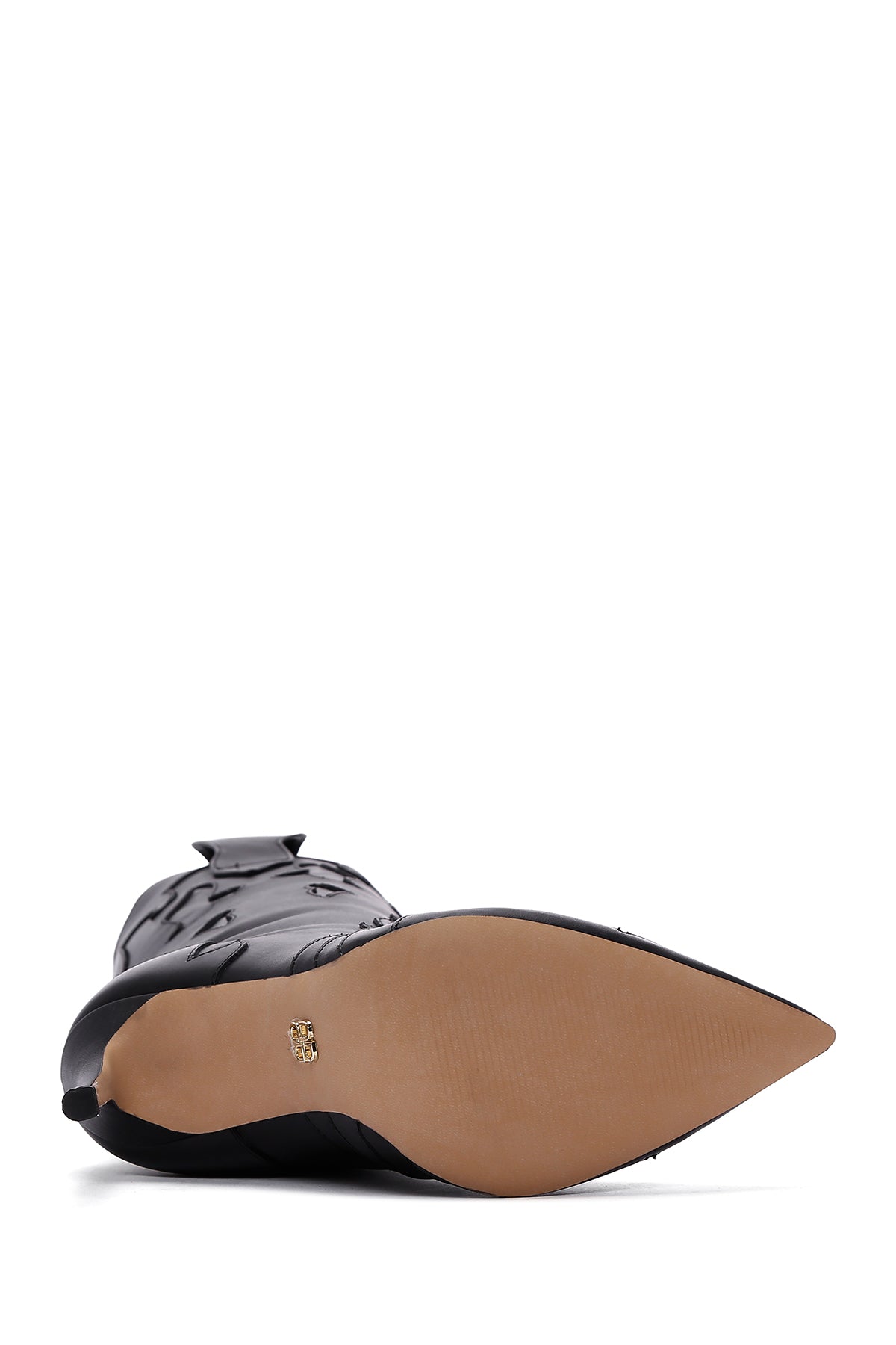 Kadın Siyah Desenli İnce Topuklu Deri Çizme