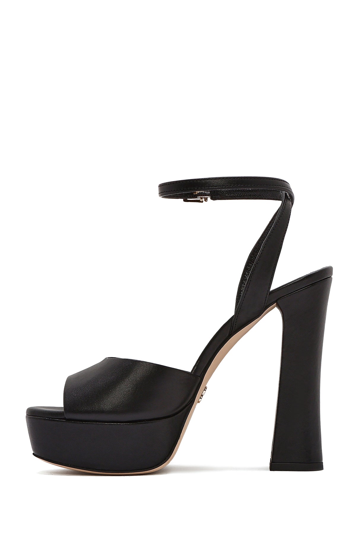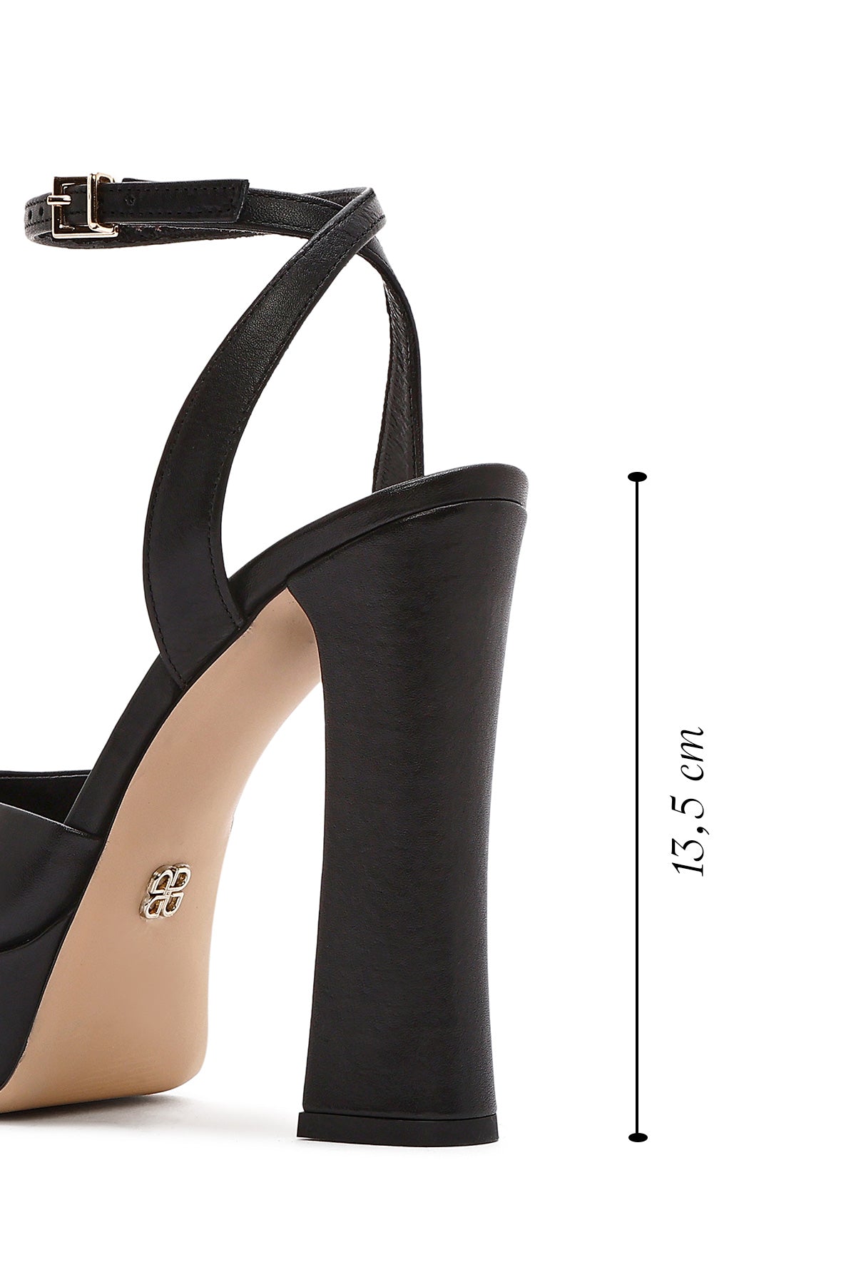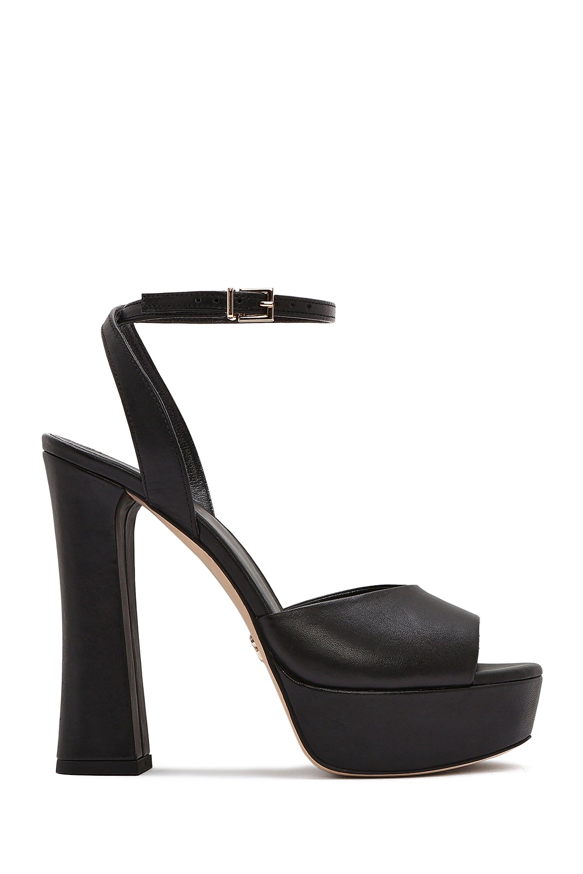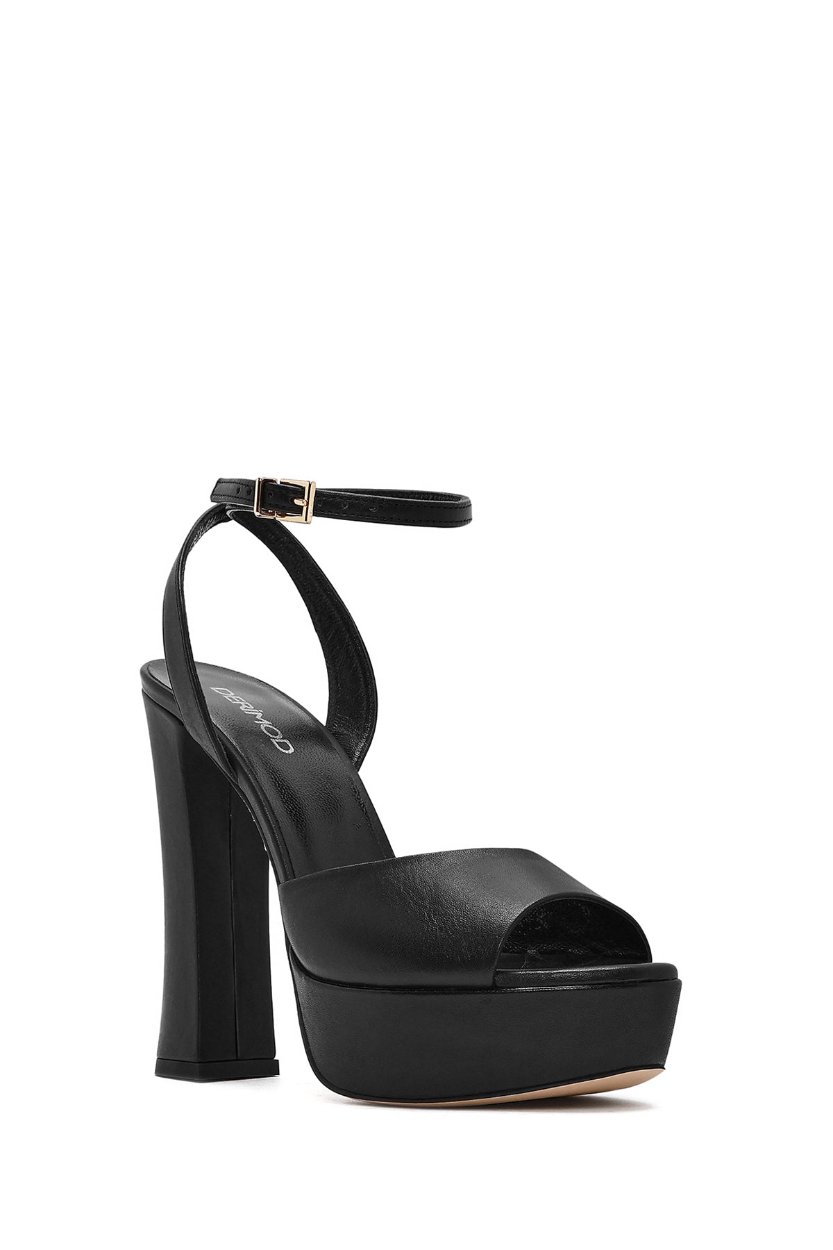 Kadın Siyah Bilekten Tokalı Platformlu Yüksek Kalın Topuklu Deri Sandalet