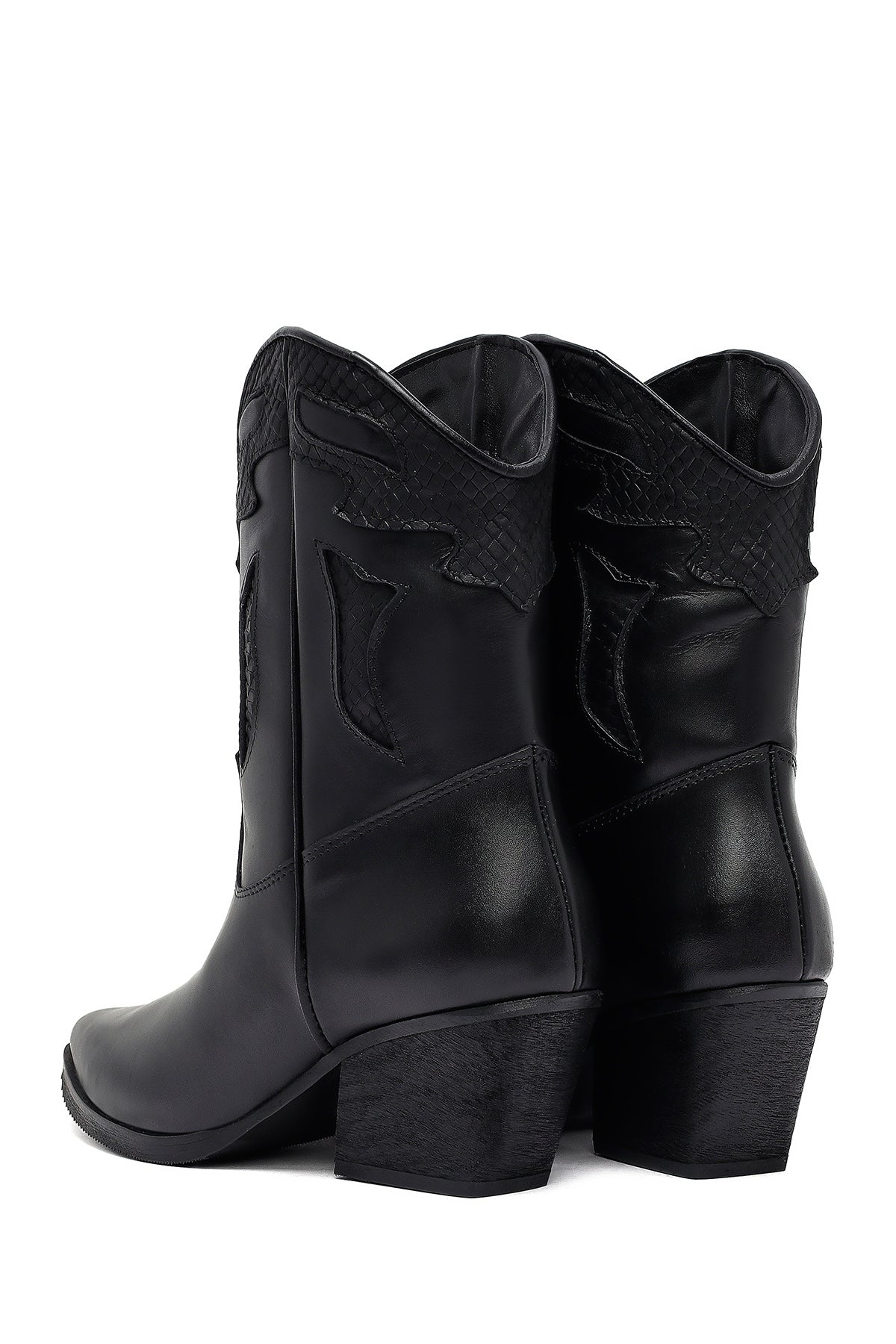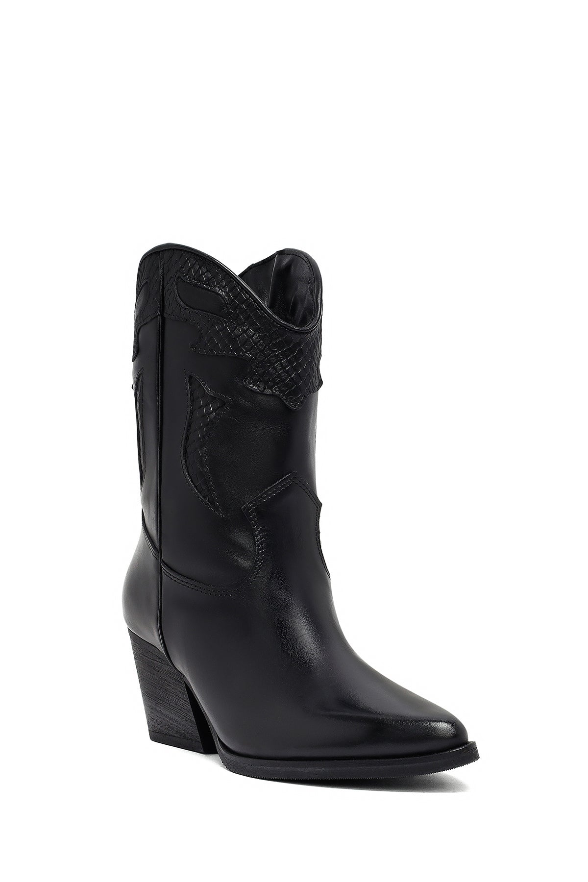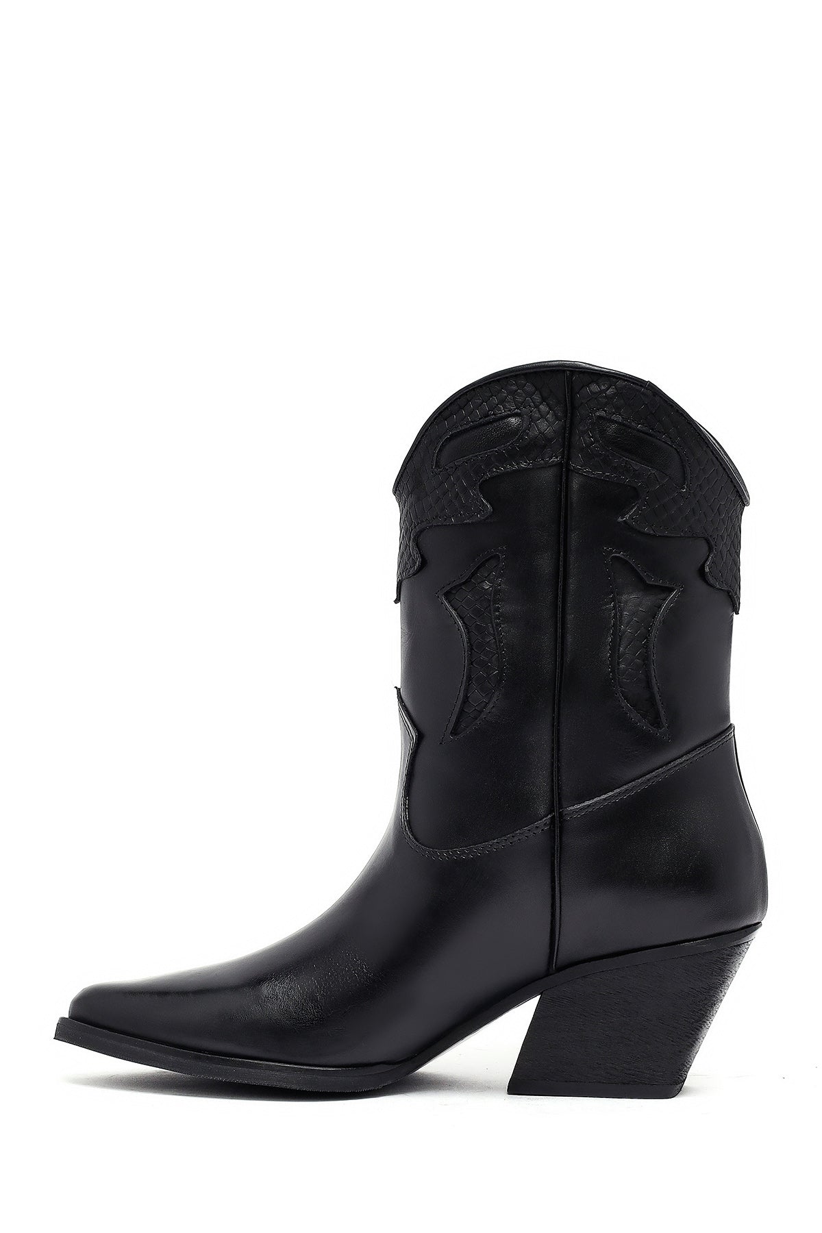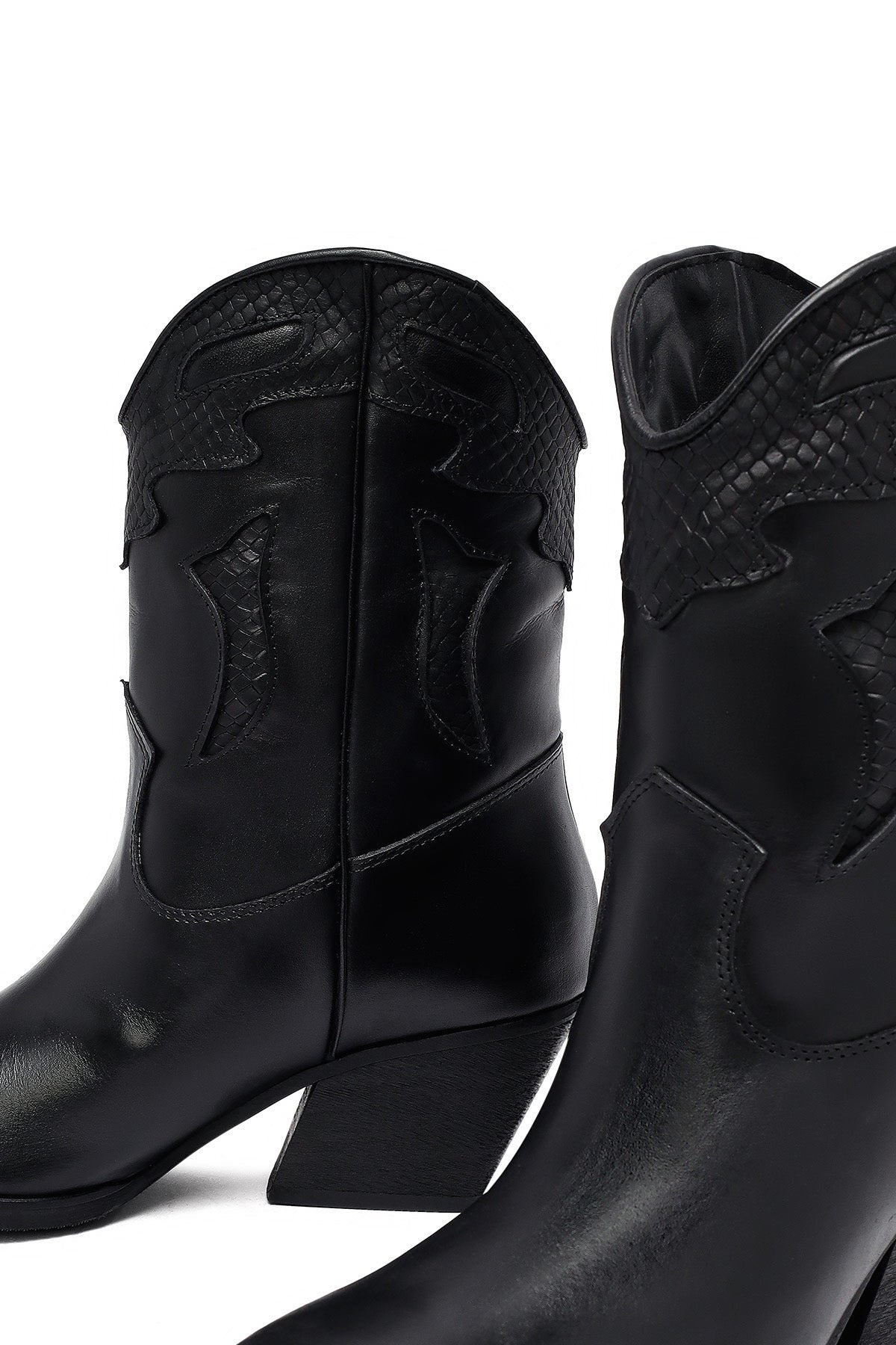 Kadın Siyah Kısa Kalın Topuklu Deri Kovboy Bot