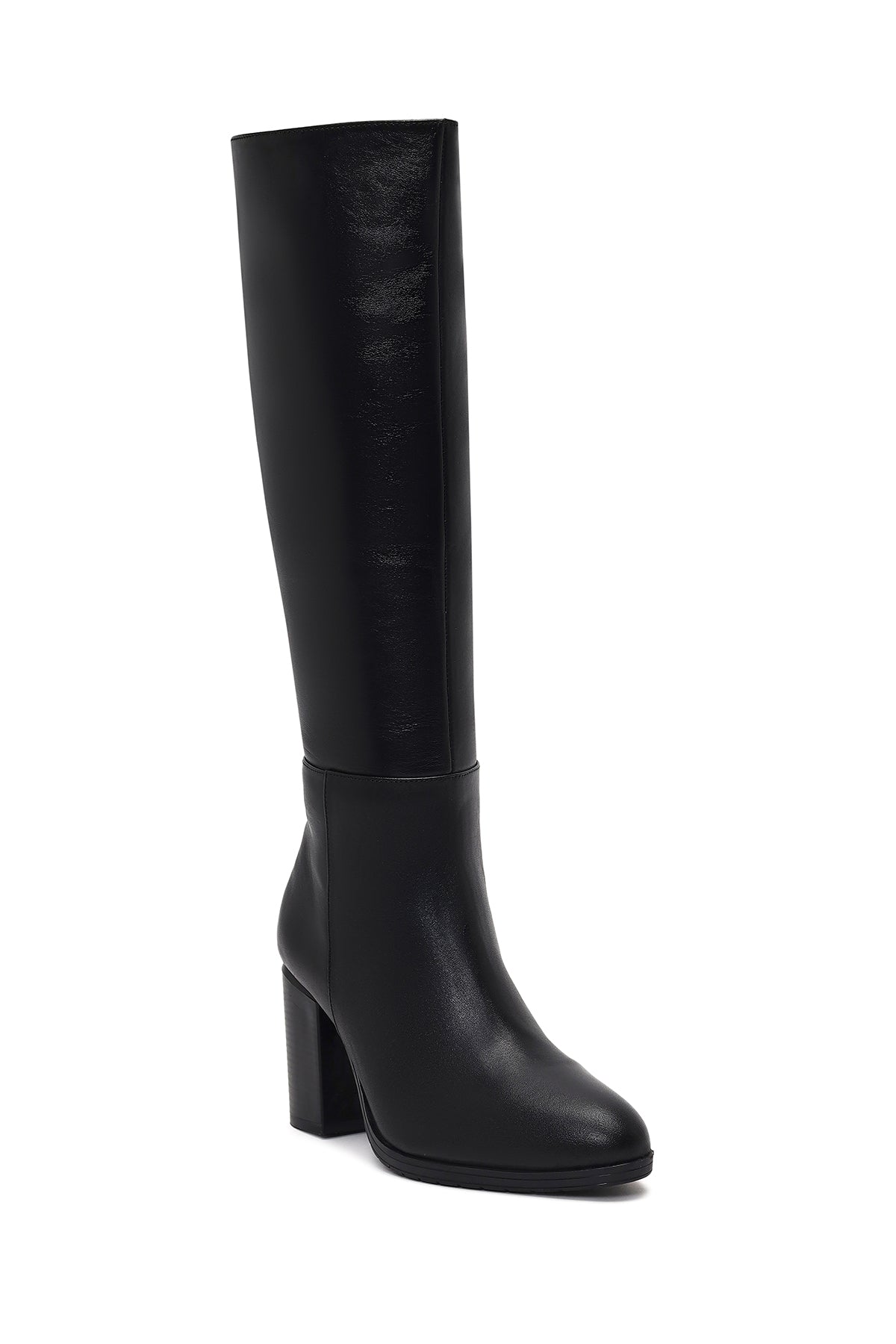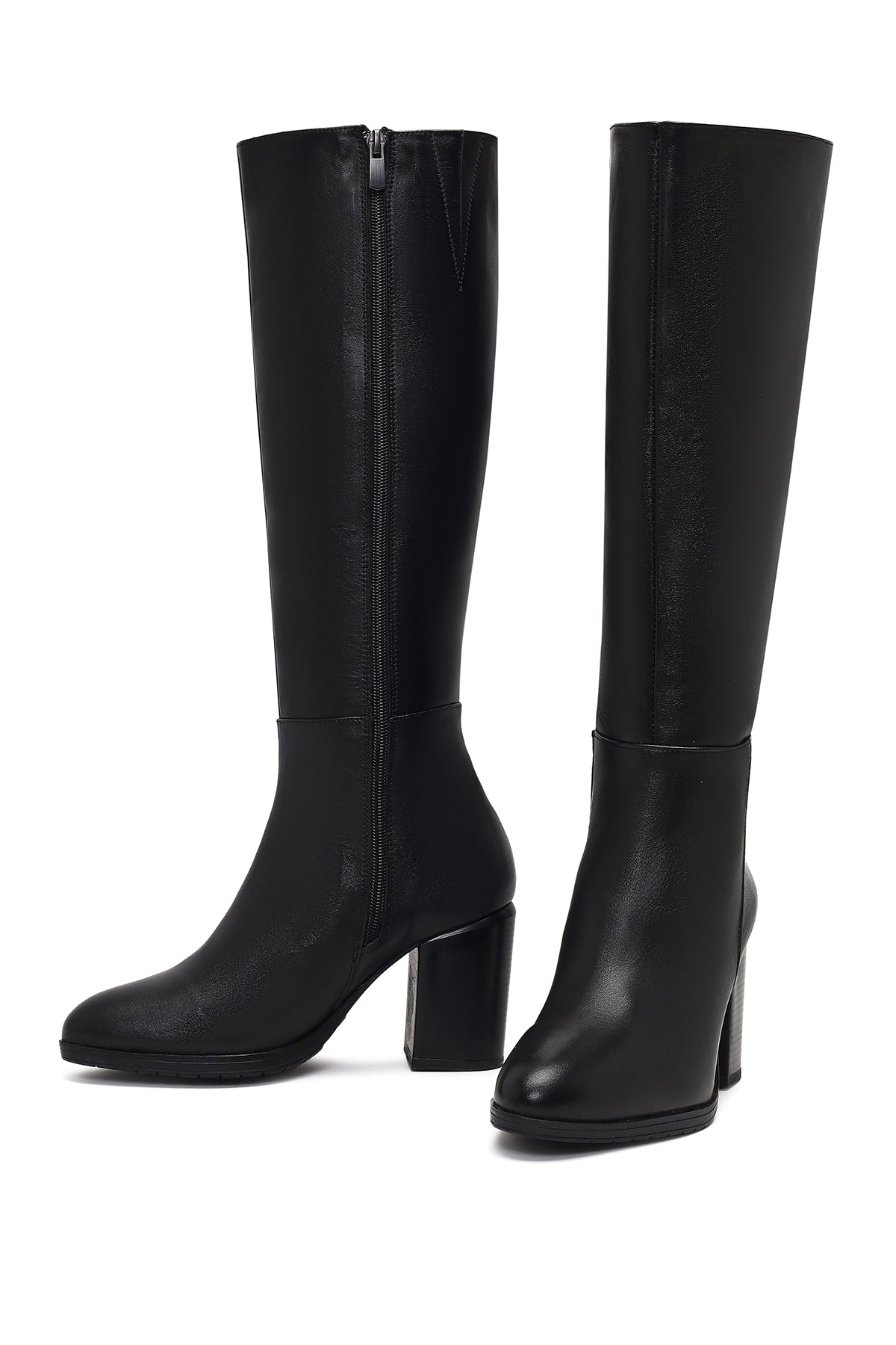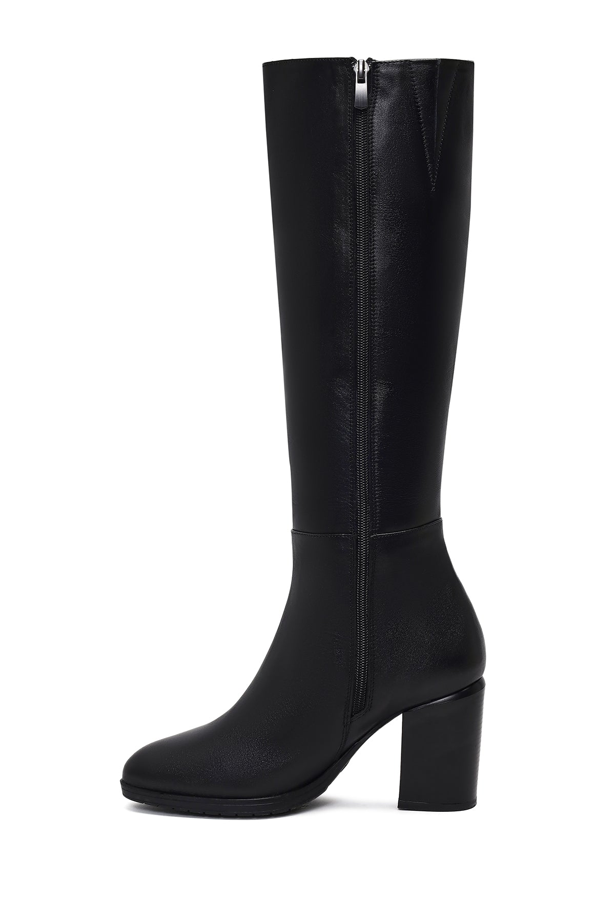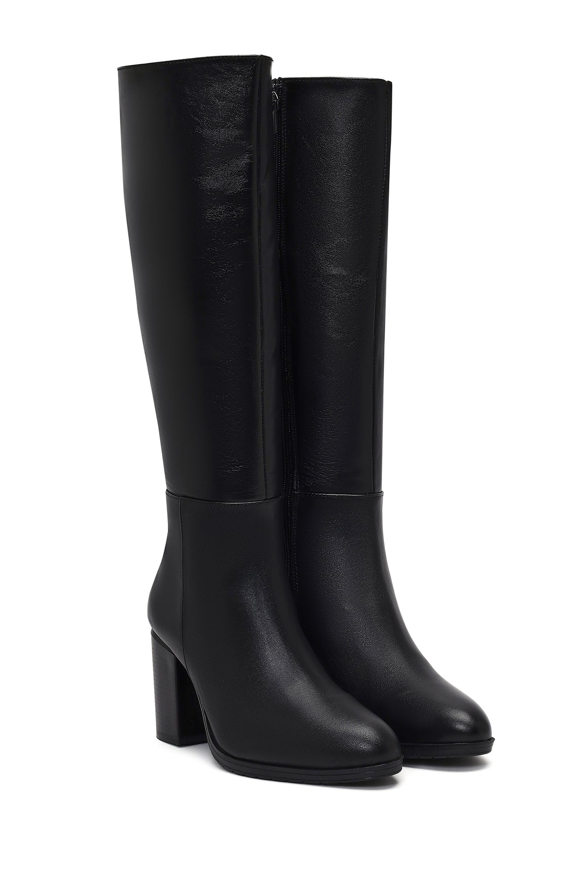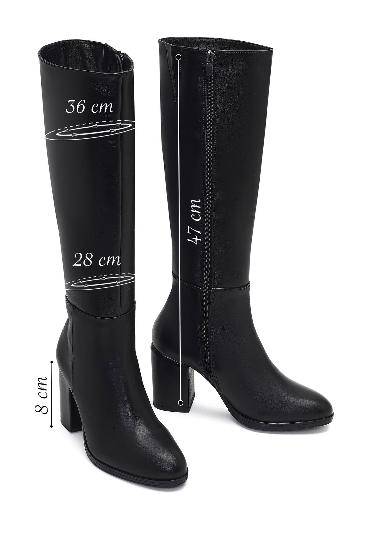Kadın Siyah Fermuarlı Kalın Topuklu Deri Çizme