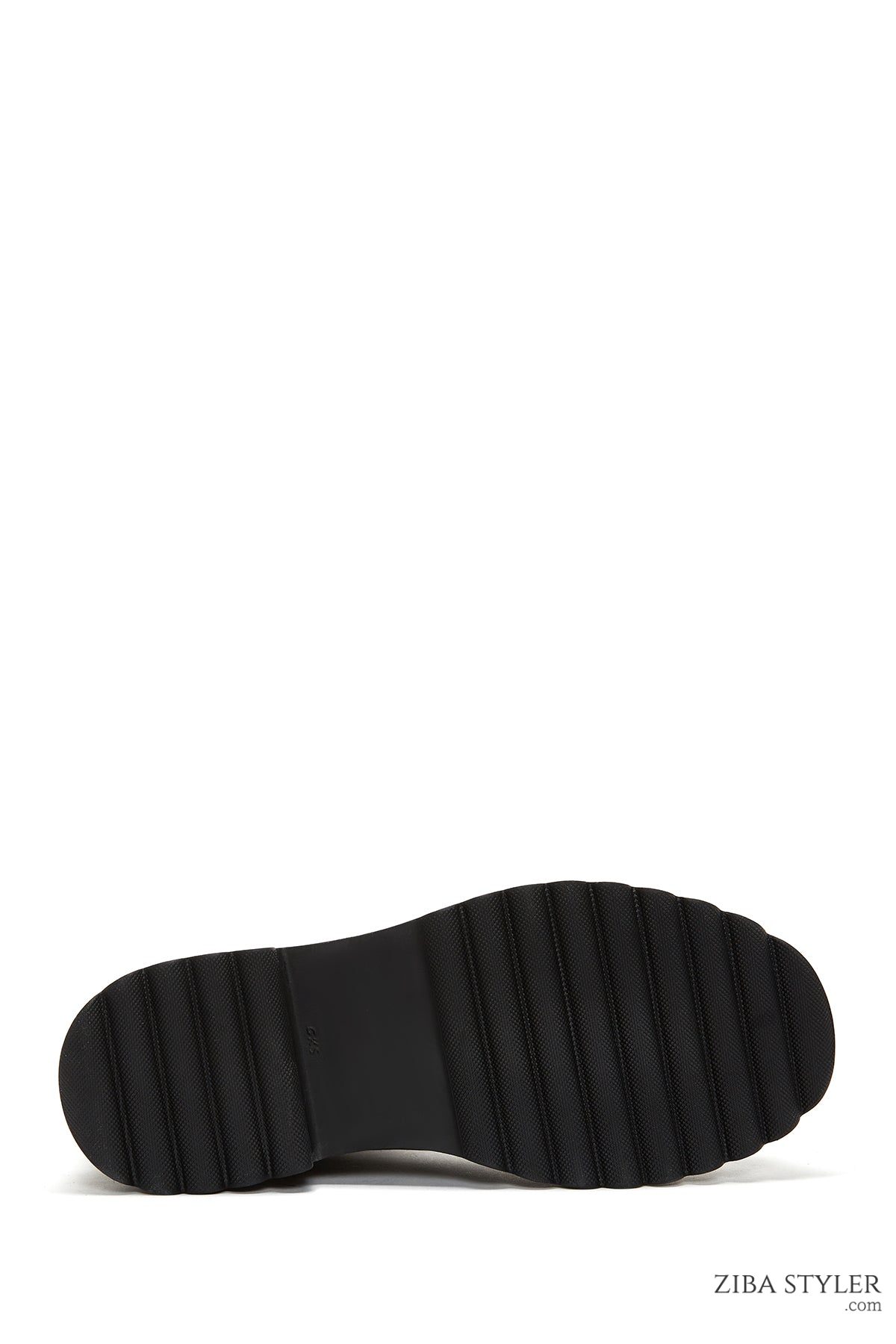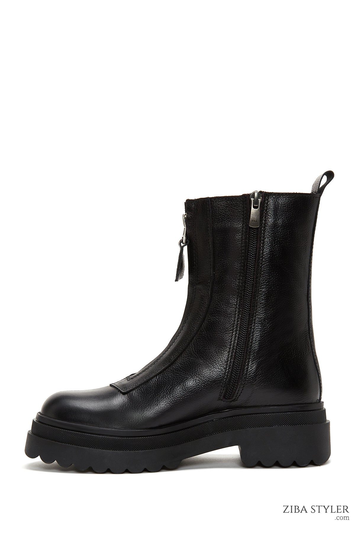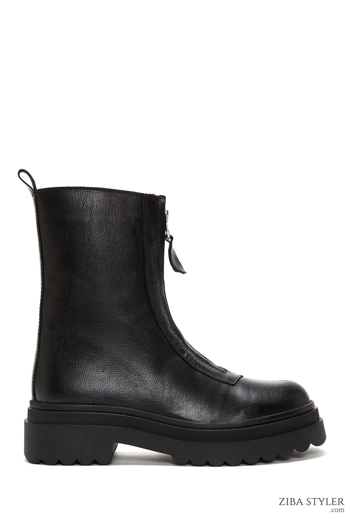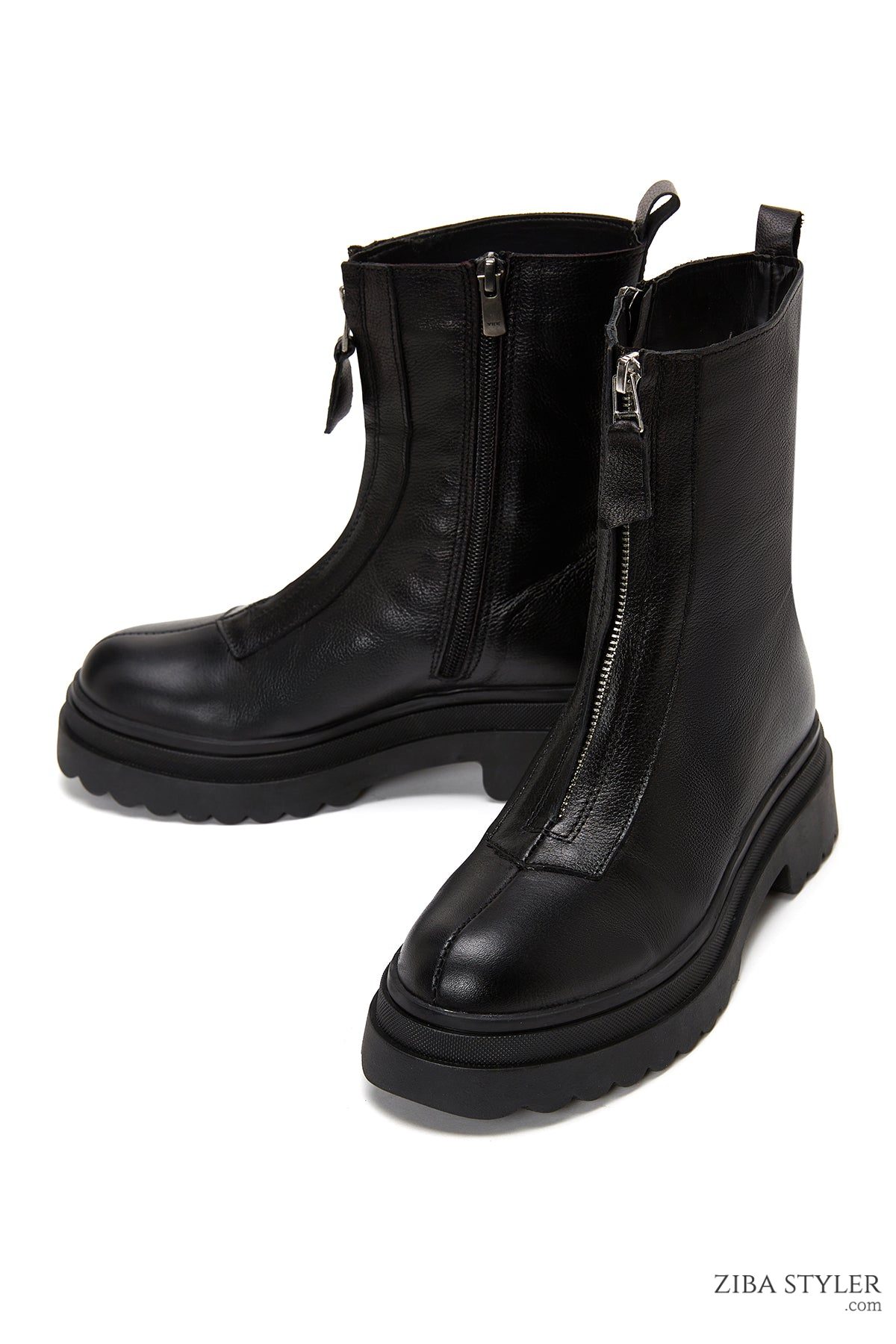 Kadın Siyah Fermuarlı Kalın Tabanlı Deri Bot
