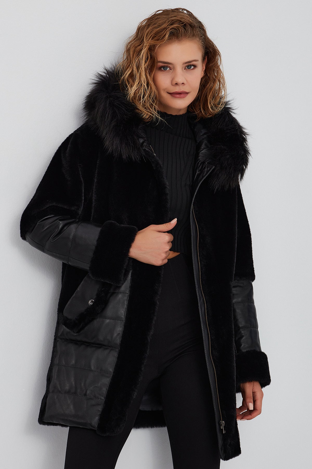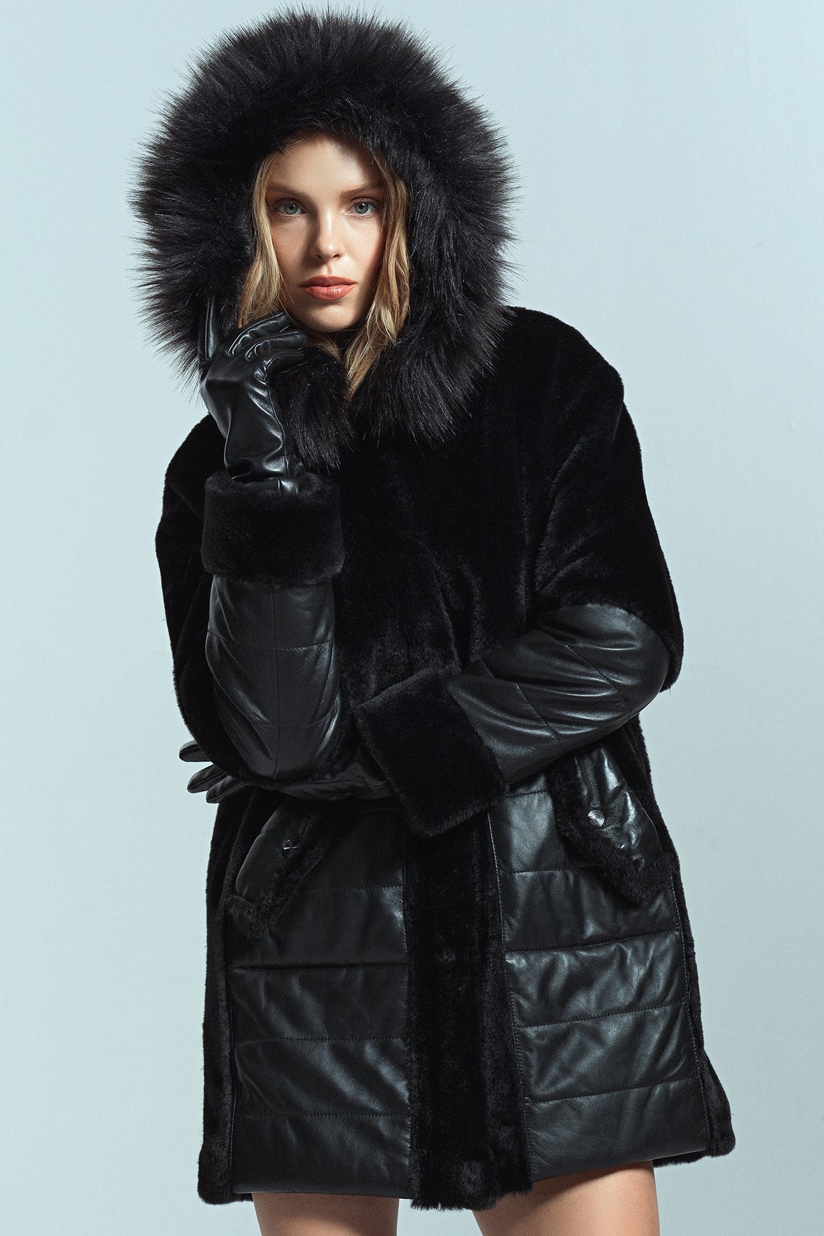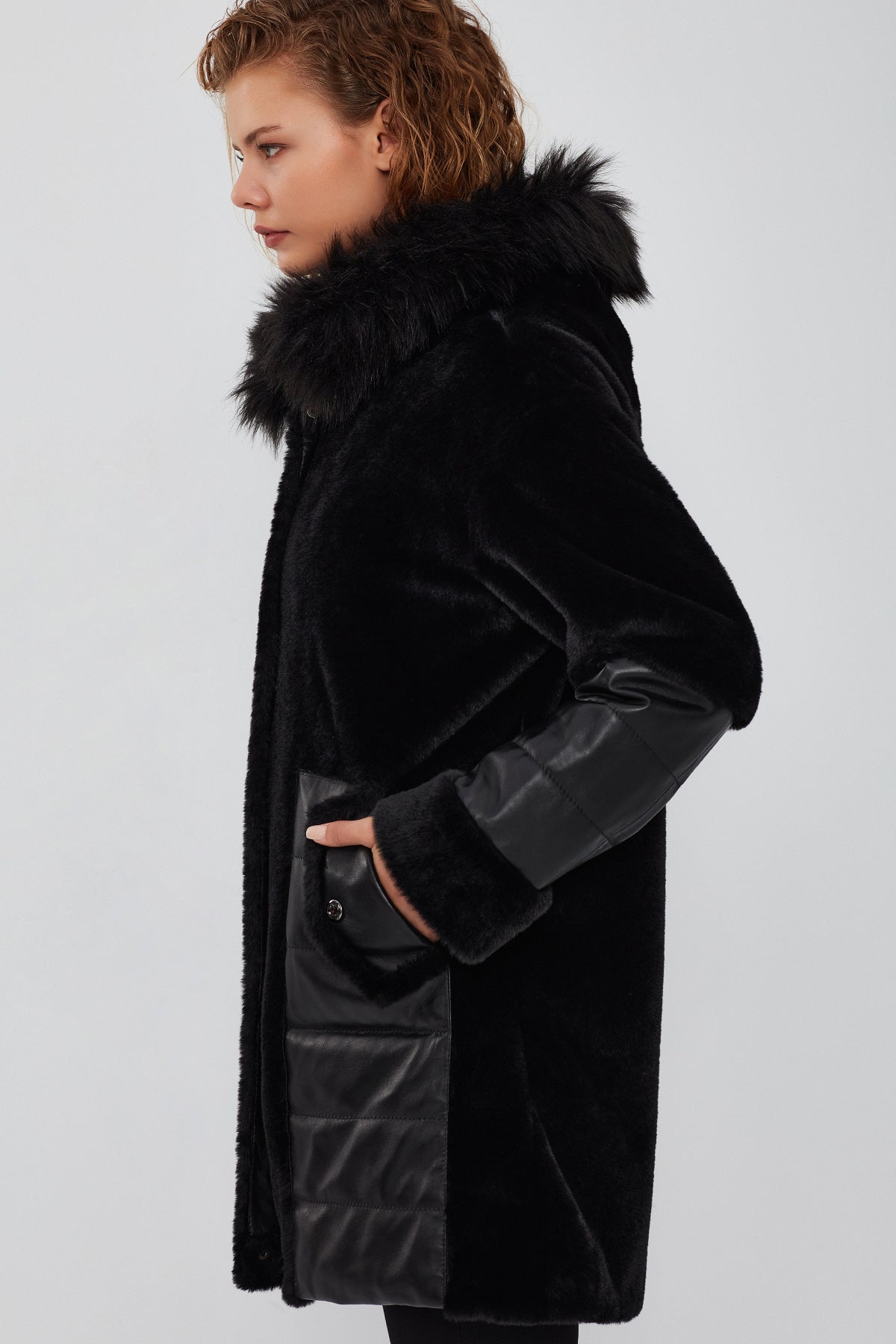 پالتو زنانه مشکی خزدار کلاه دار بلند Virginia دری مد