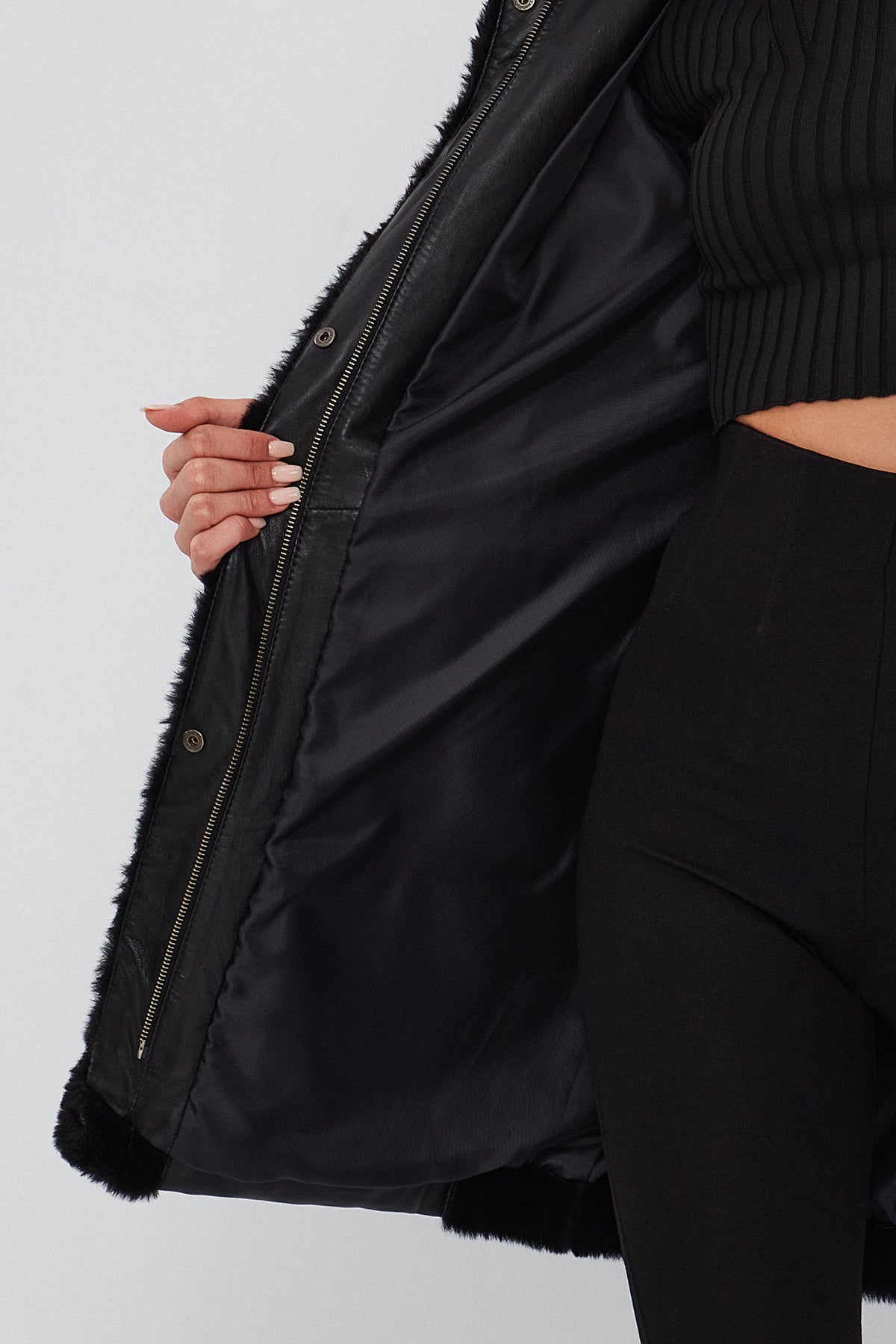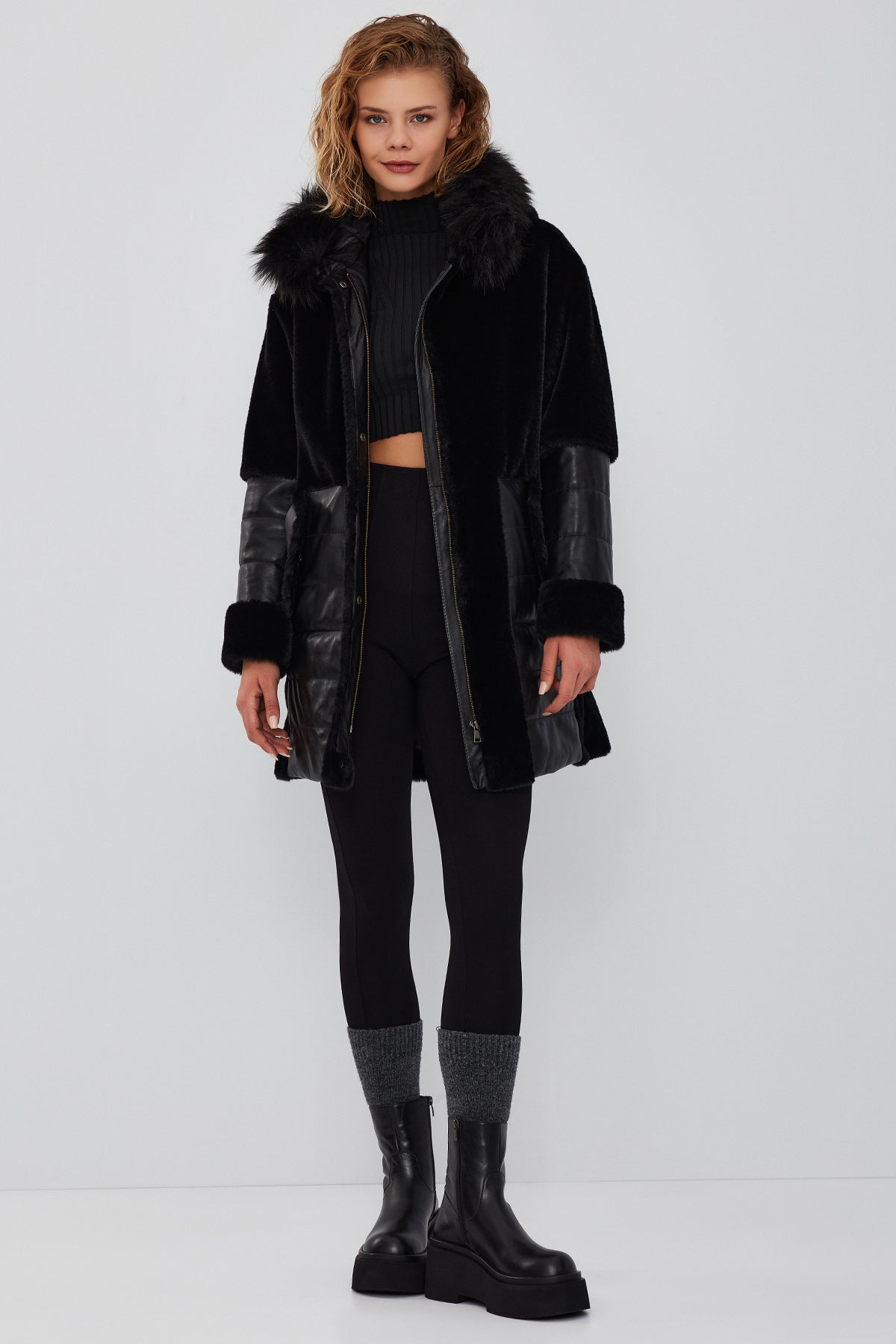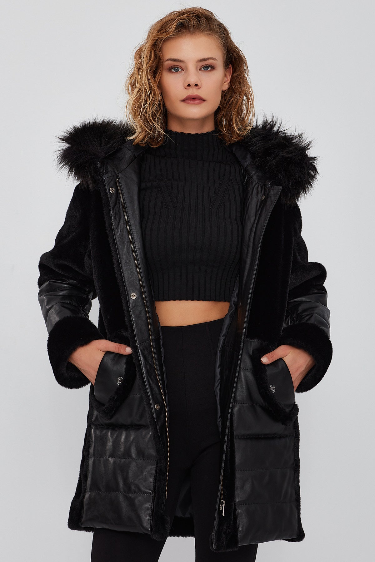 پالتو زنانه مشکی خزدار کلاه دار بلند Virginia دری مد