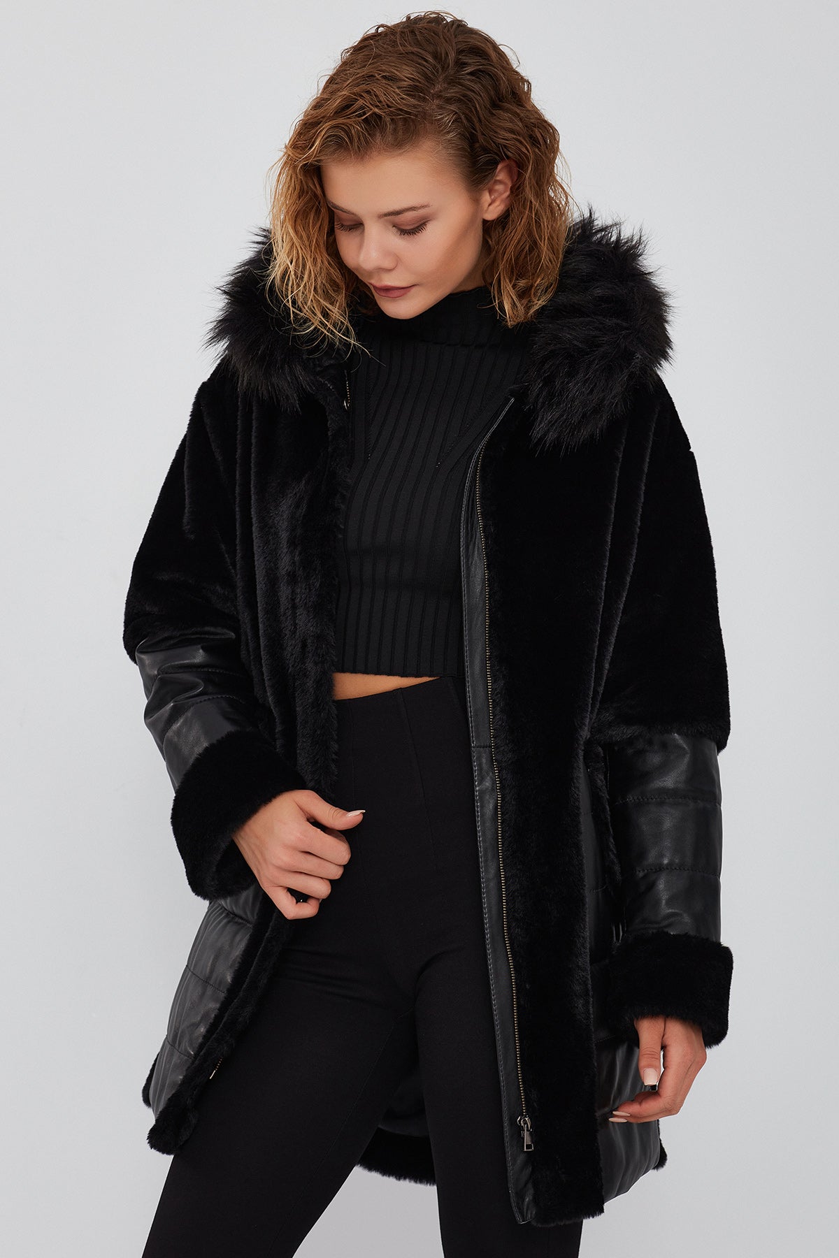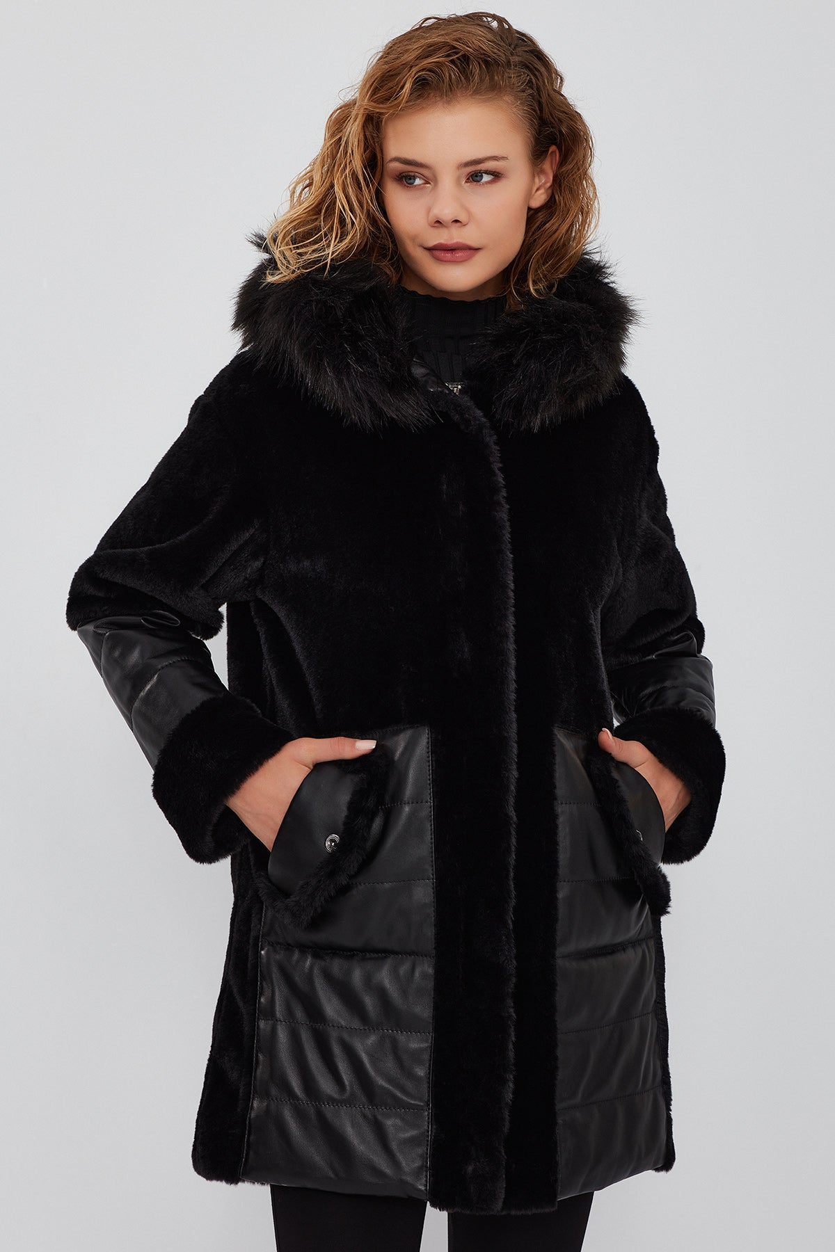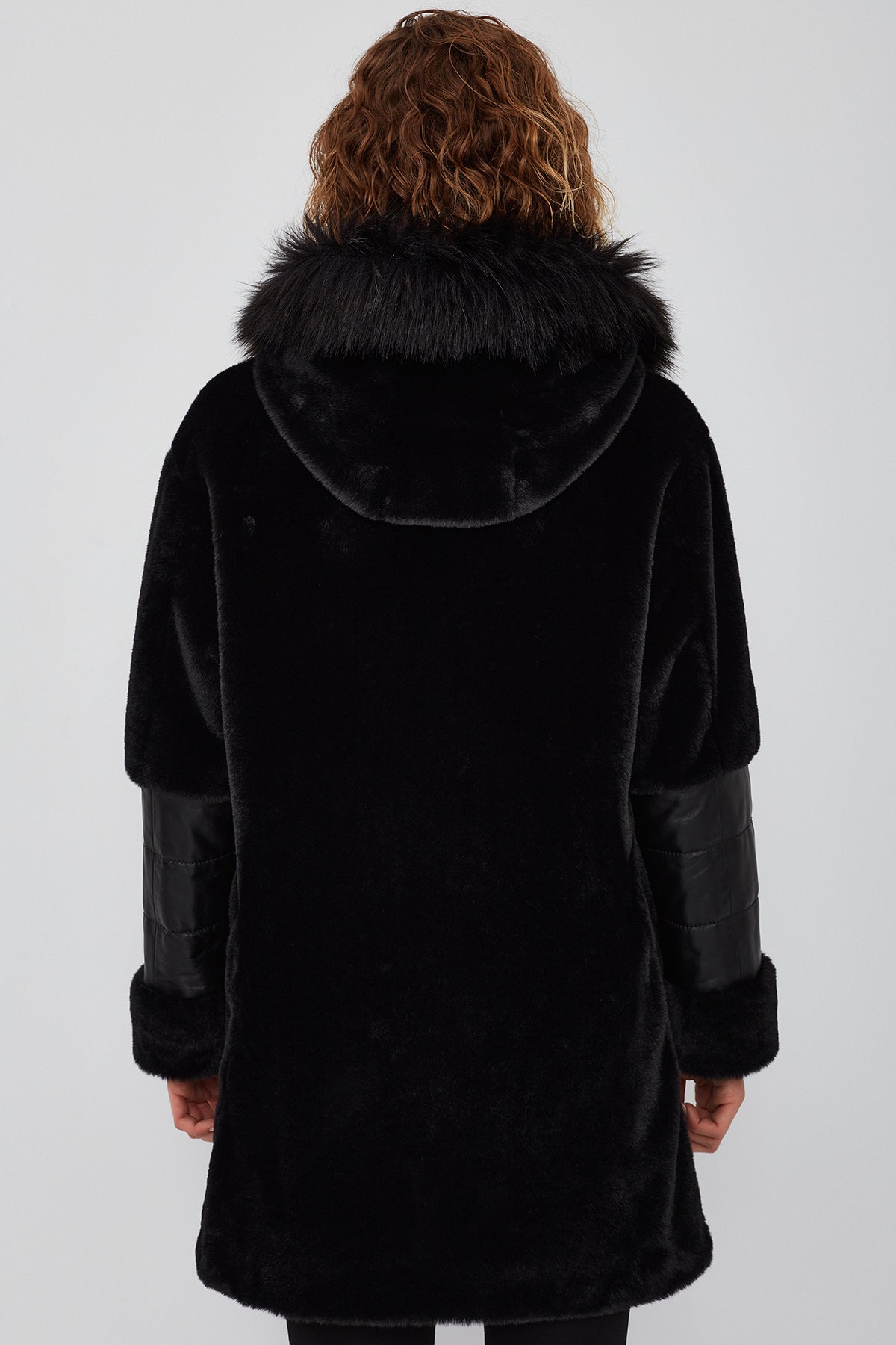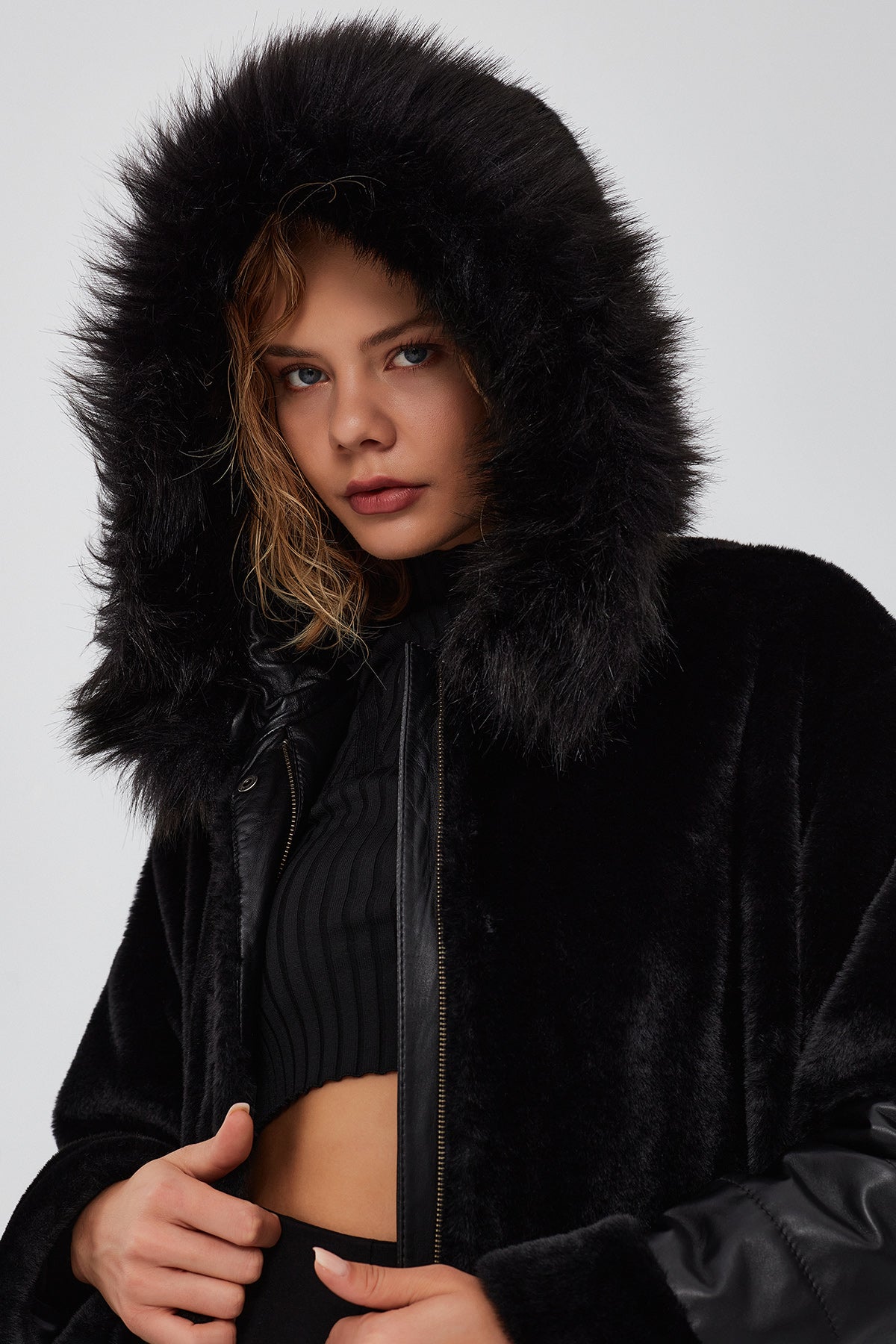 Virginia Kadın Siyah Kapüşonlu Uzun Teddy Kaban