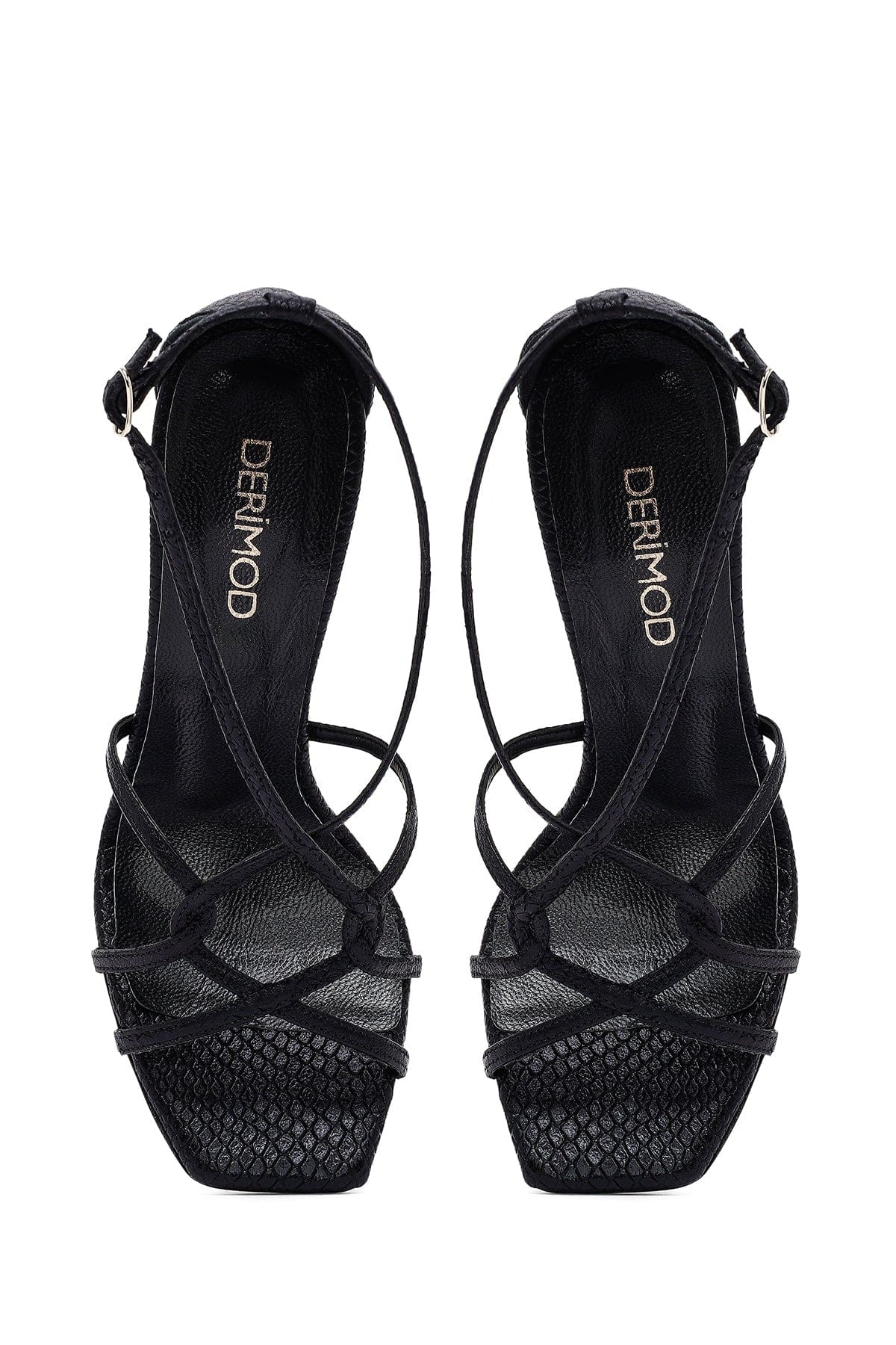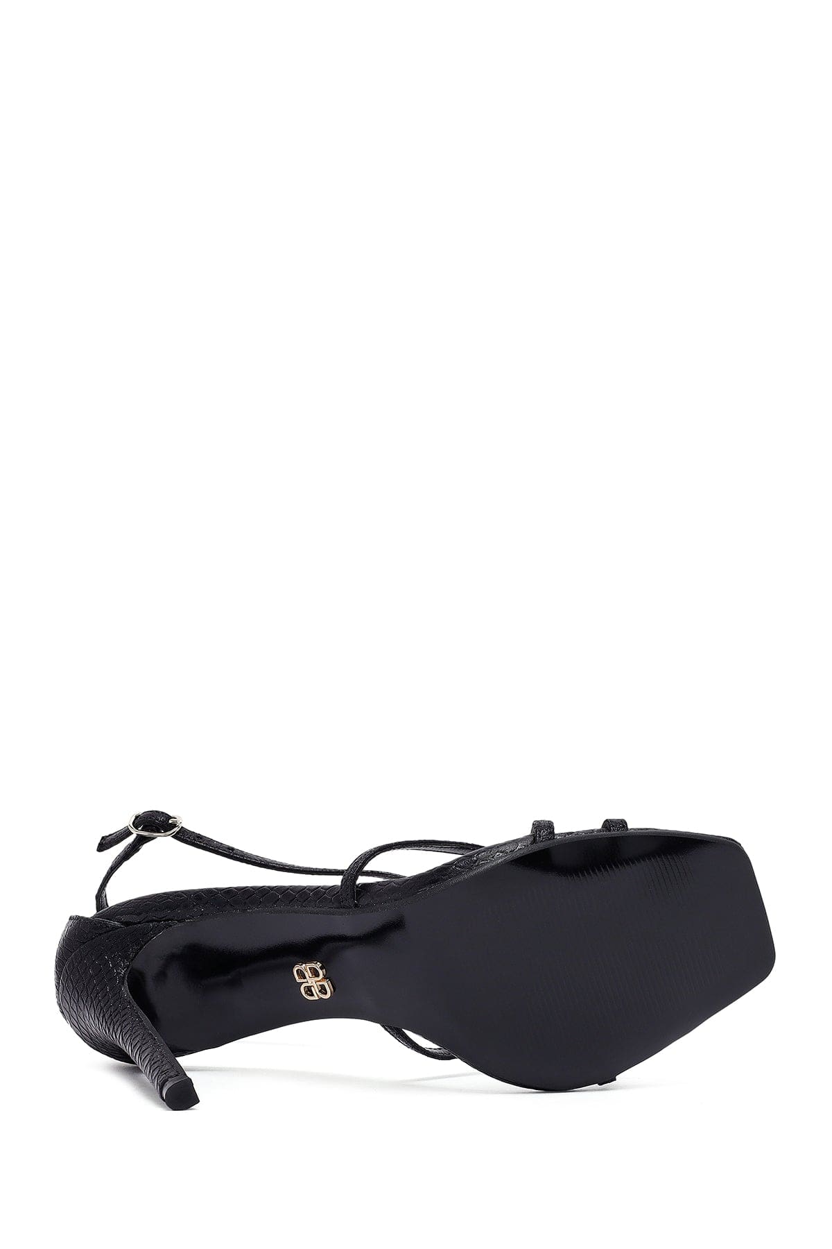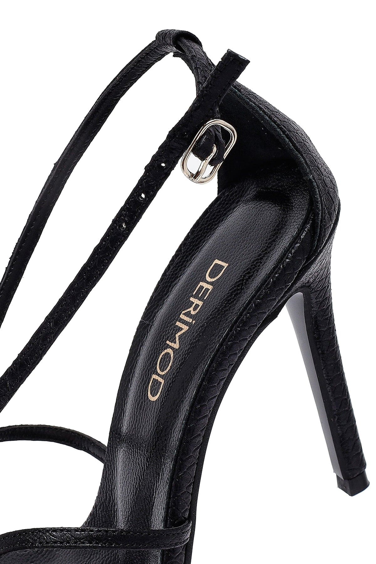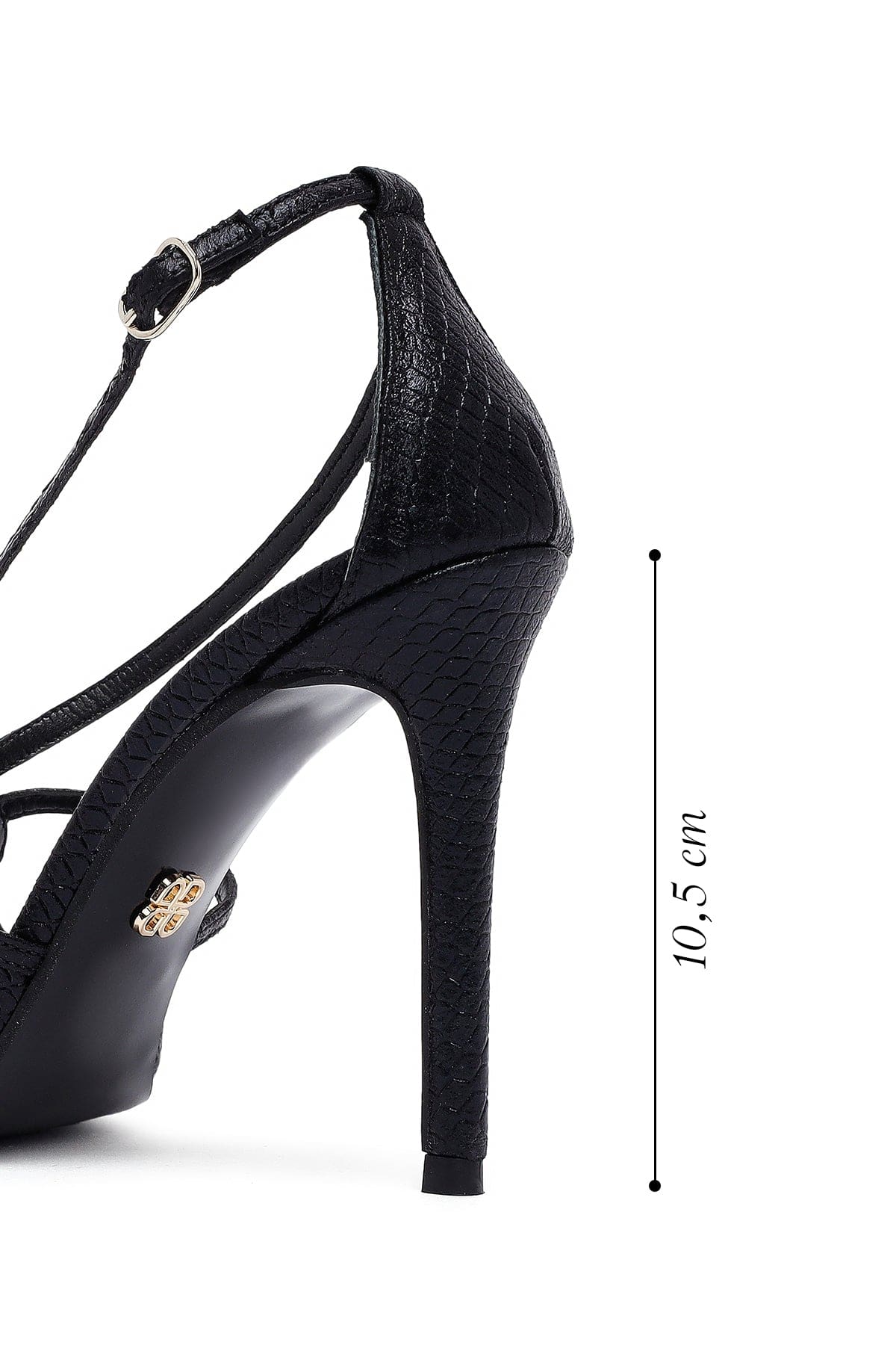 Kadın Siyah Bilekten Tokalı İnce Topuklu Metalik Deri Sandalet