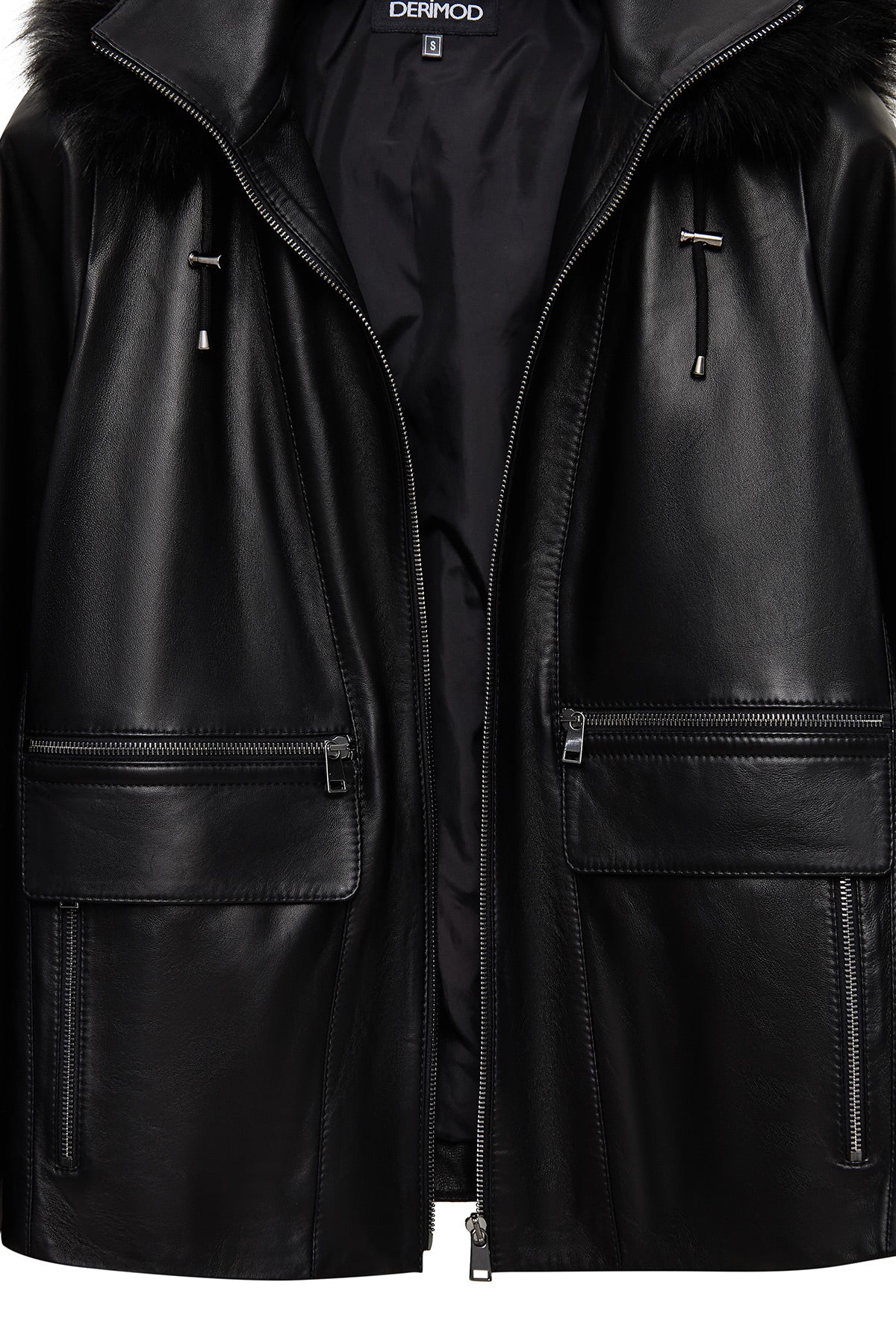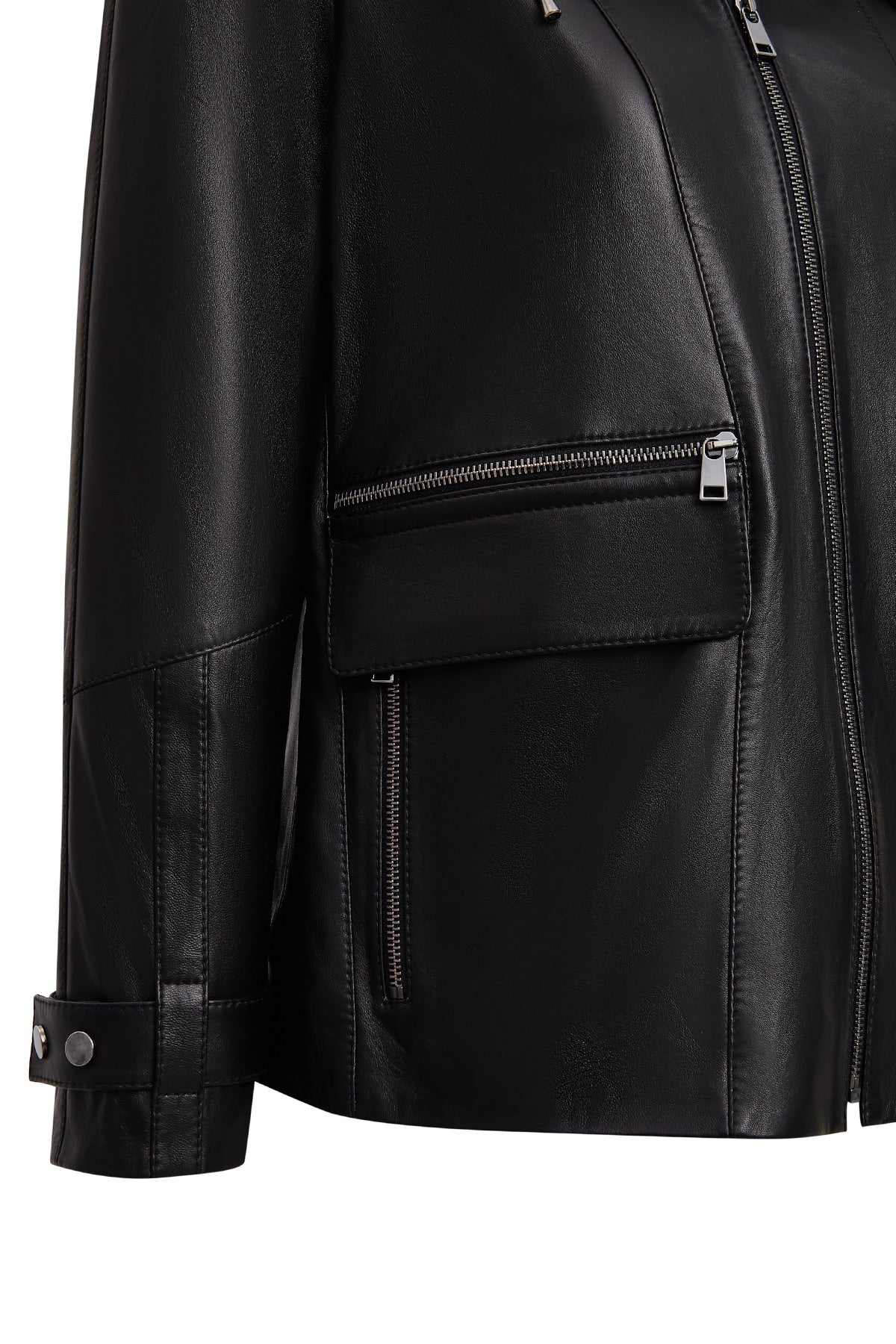 Chantal Kadın Siyah Kapüşonlu Kürklü Oversize Deri Kaban