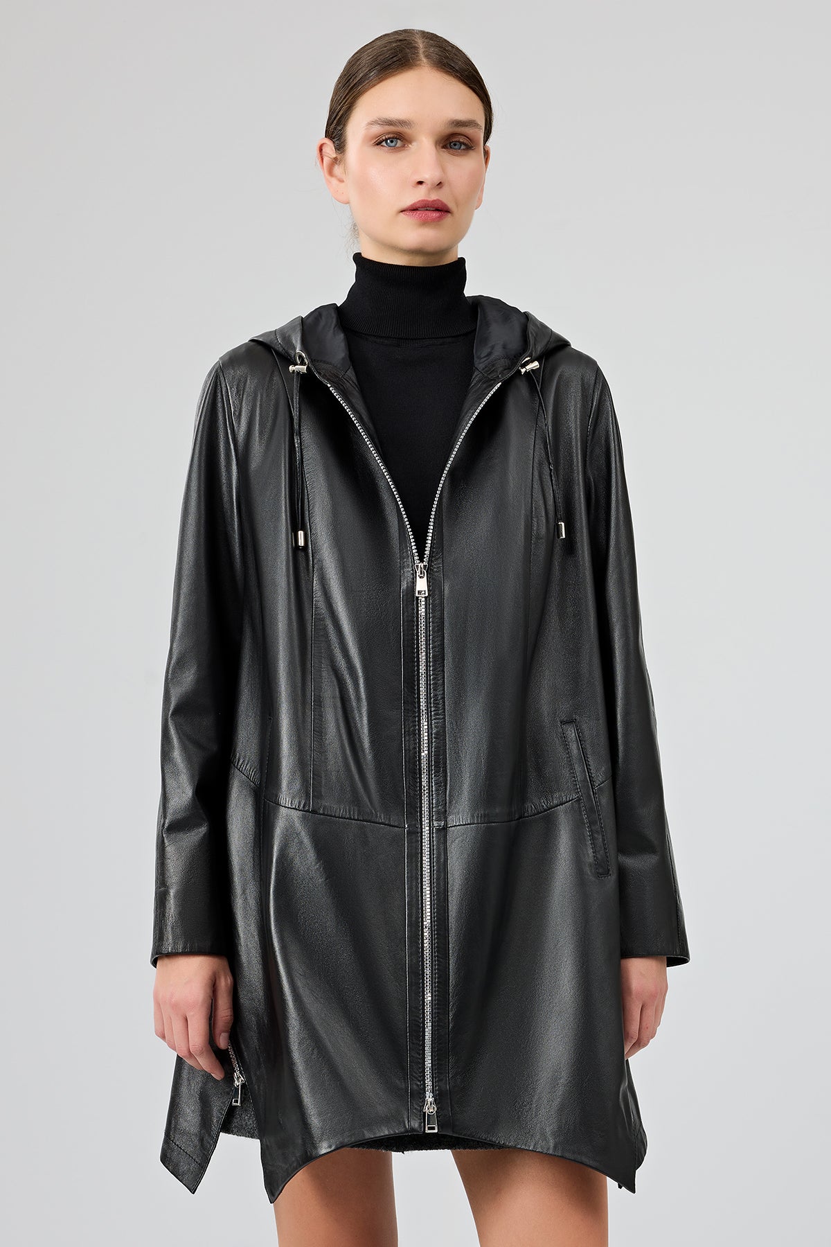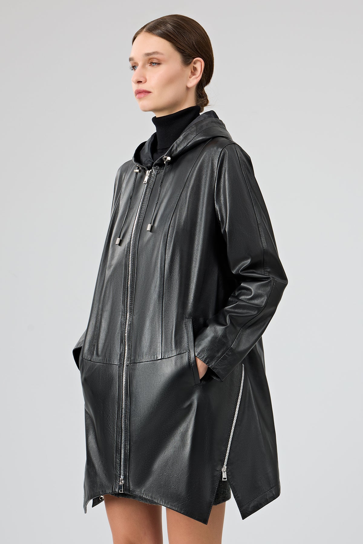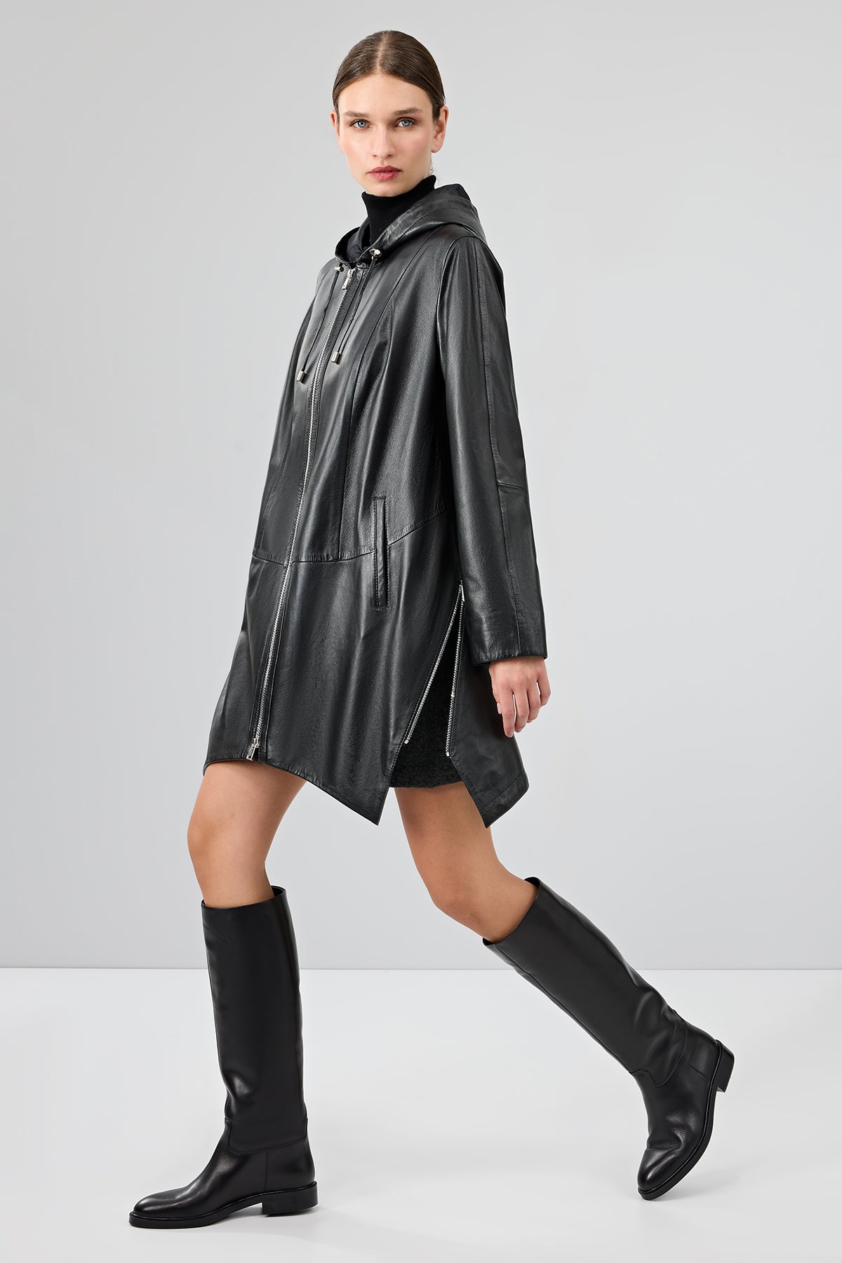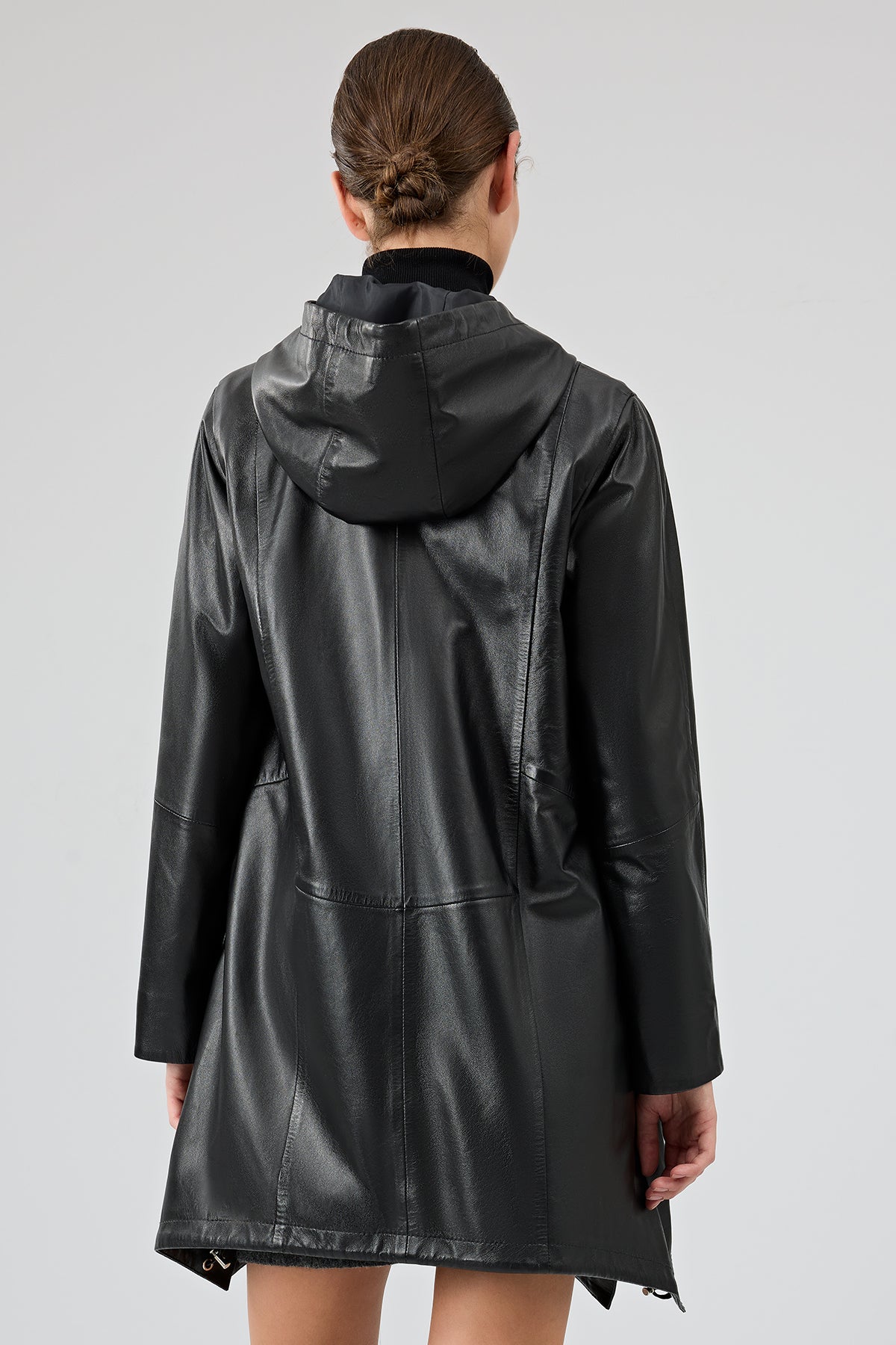 Daniela Kadın Siyah Kapüşonlu Oversize Deri Kaban
