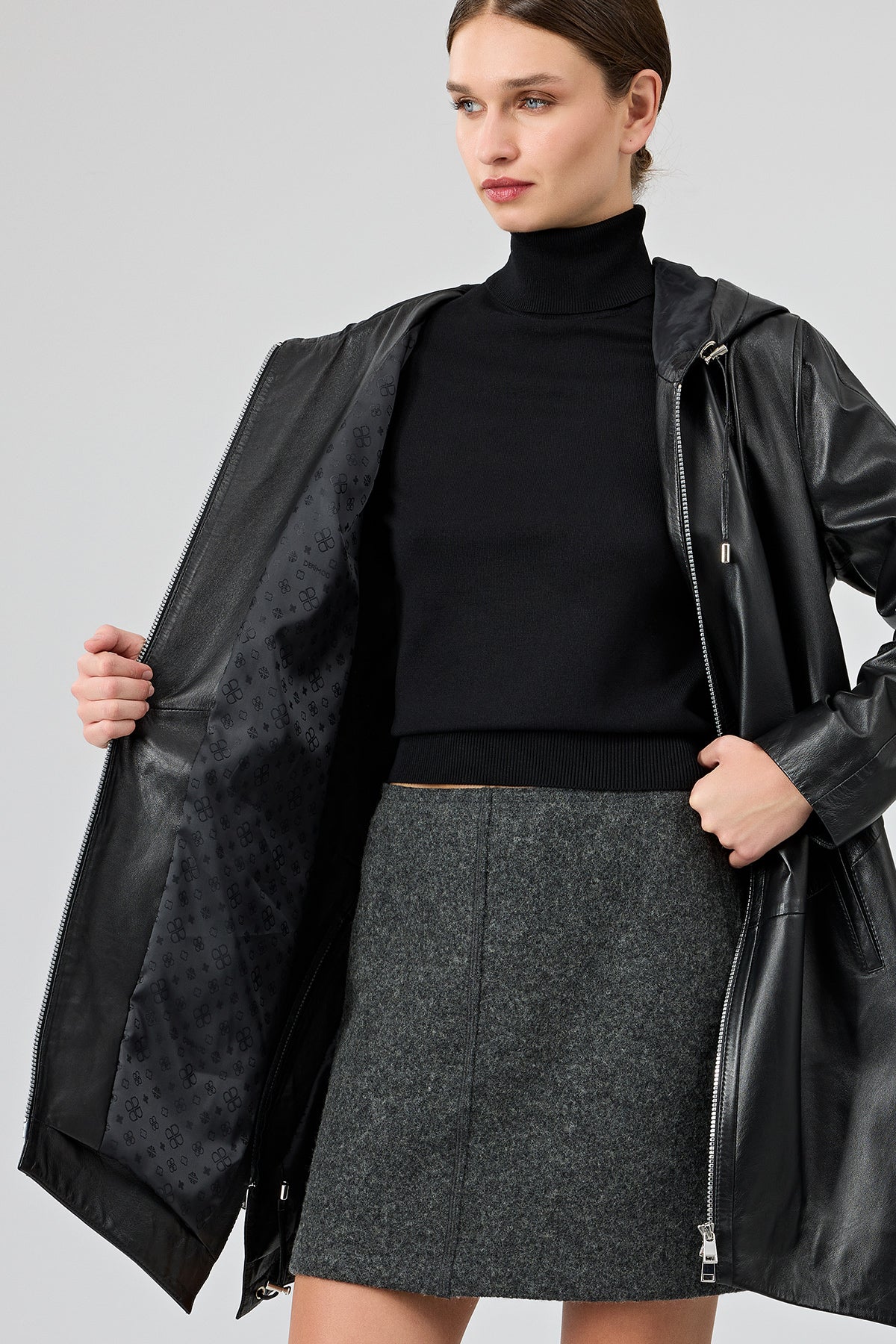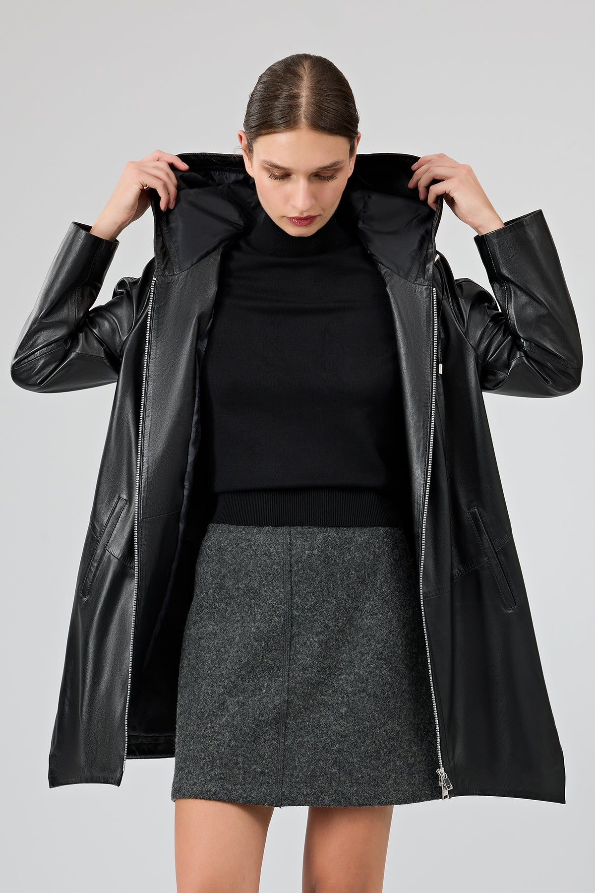 کت چرمی زنانه مشکی اورسایز کلاهدار Daniela دری مد