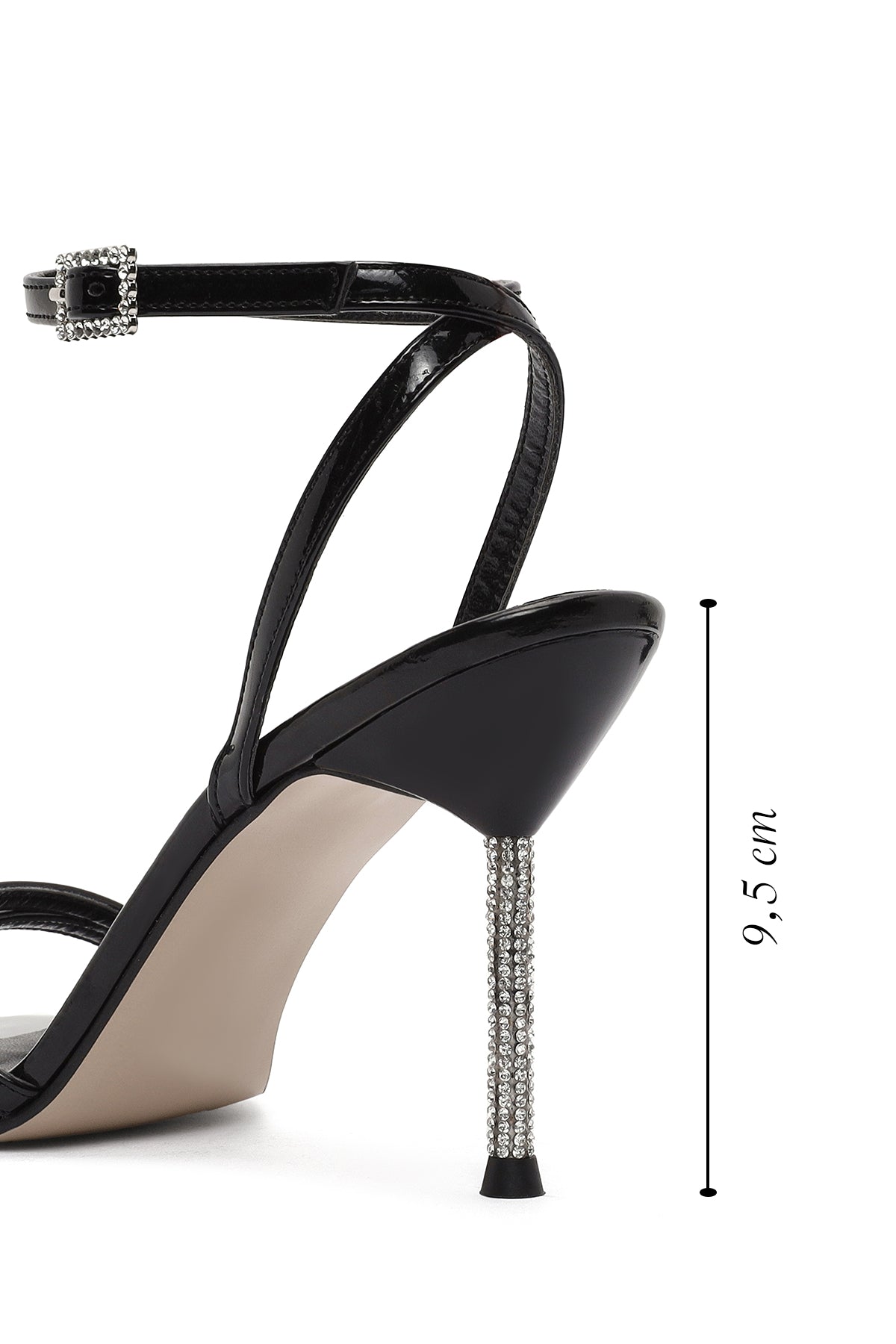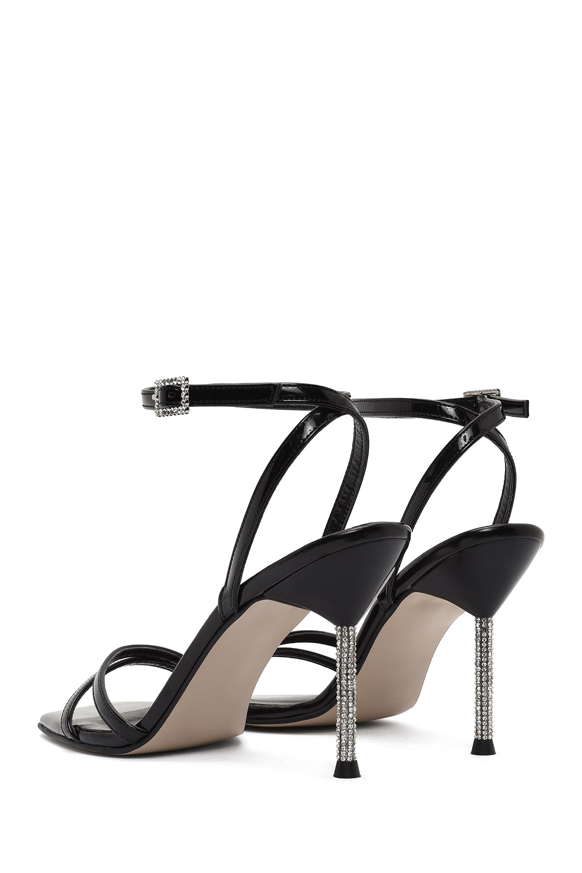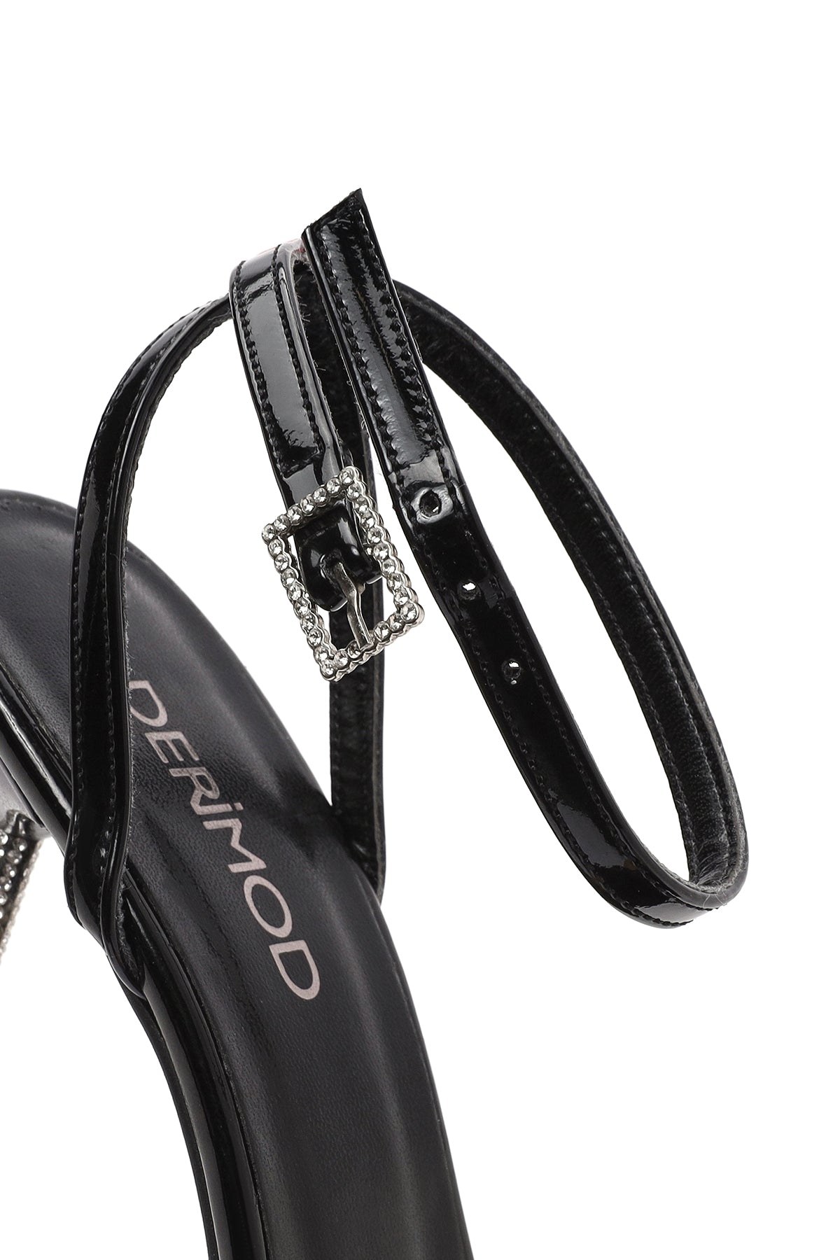 Kadın Siyah Bilekten Tokalı Taşlı İnce Topuklu Rugan Sandalet
