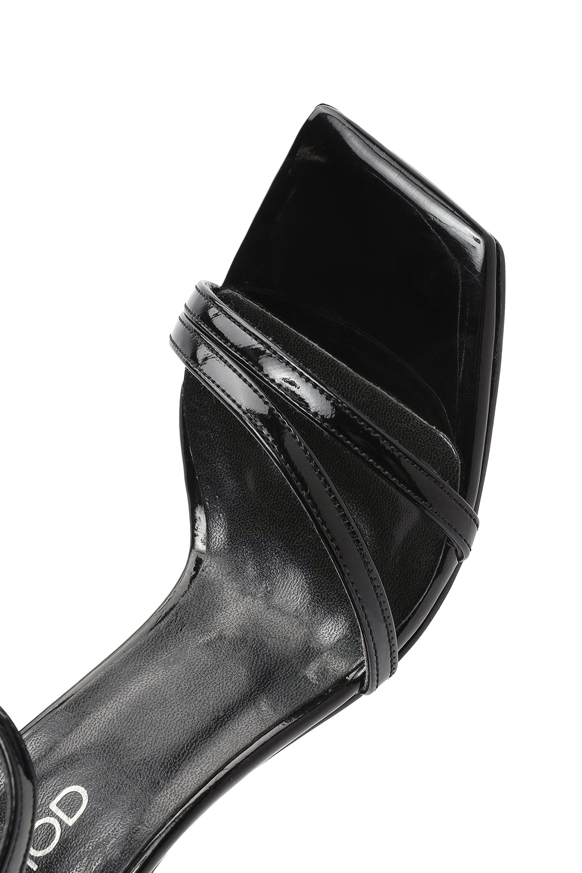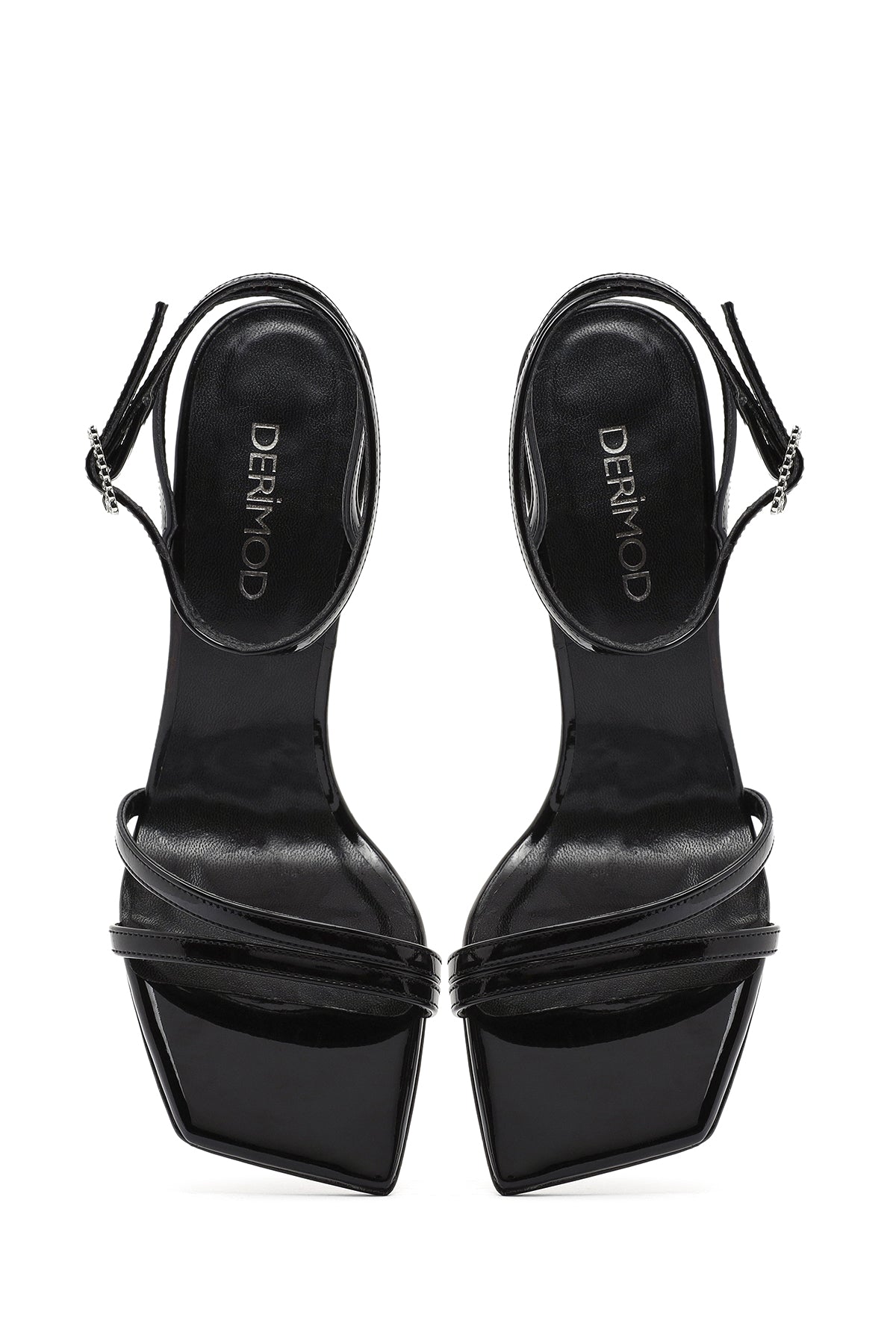 صندل زنانه مشکی براق پاشنه نازک نگیندار بنددار دری مد