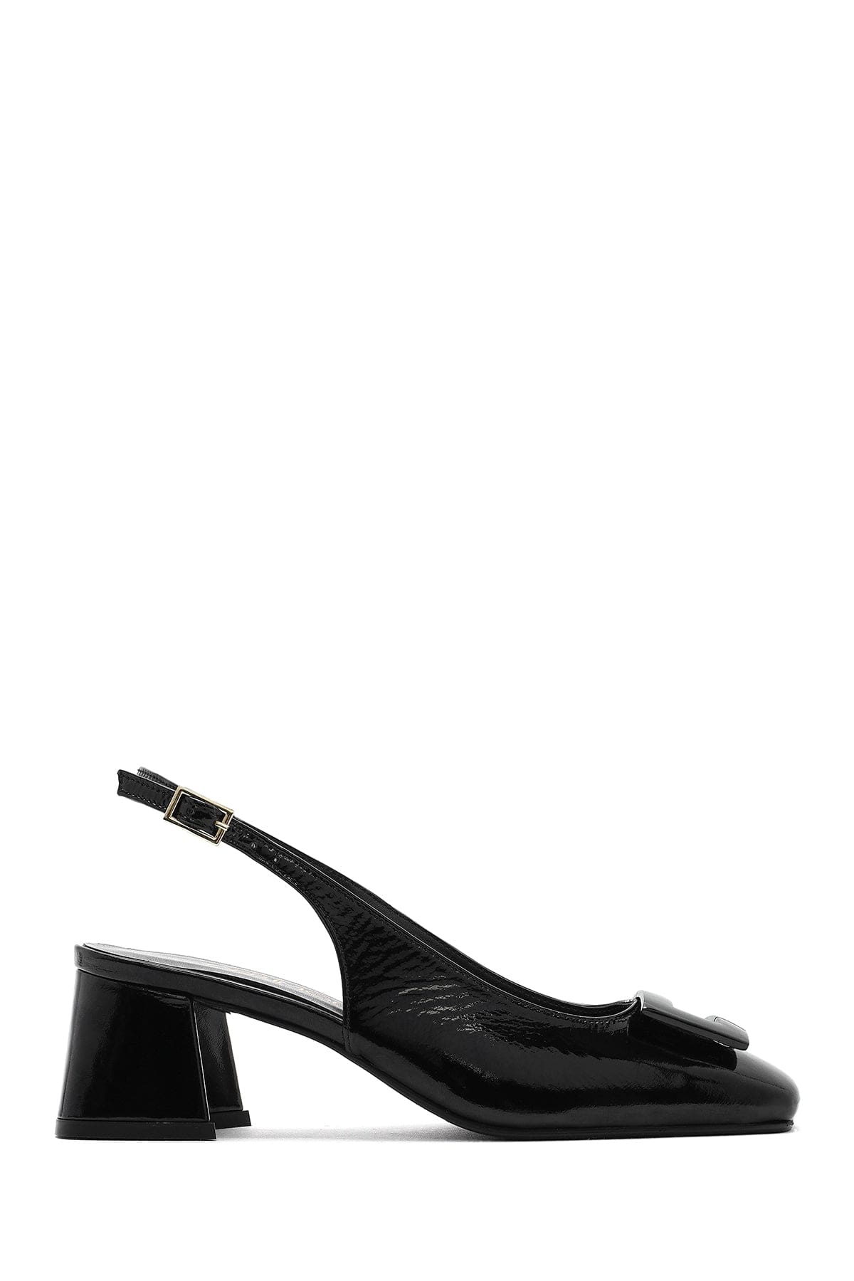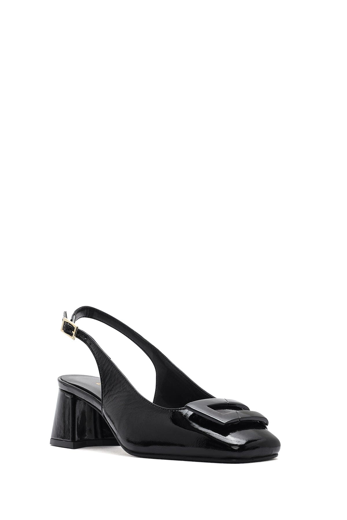 Kadın Siyah Bilekten Tokalı Arkası Açık Kısa Kalın Topuklu Rugan Deri Ayakkabı