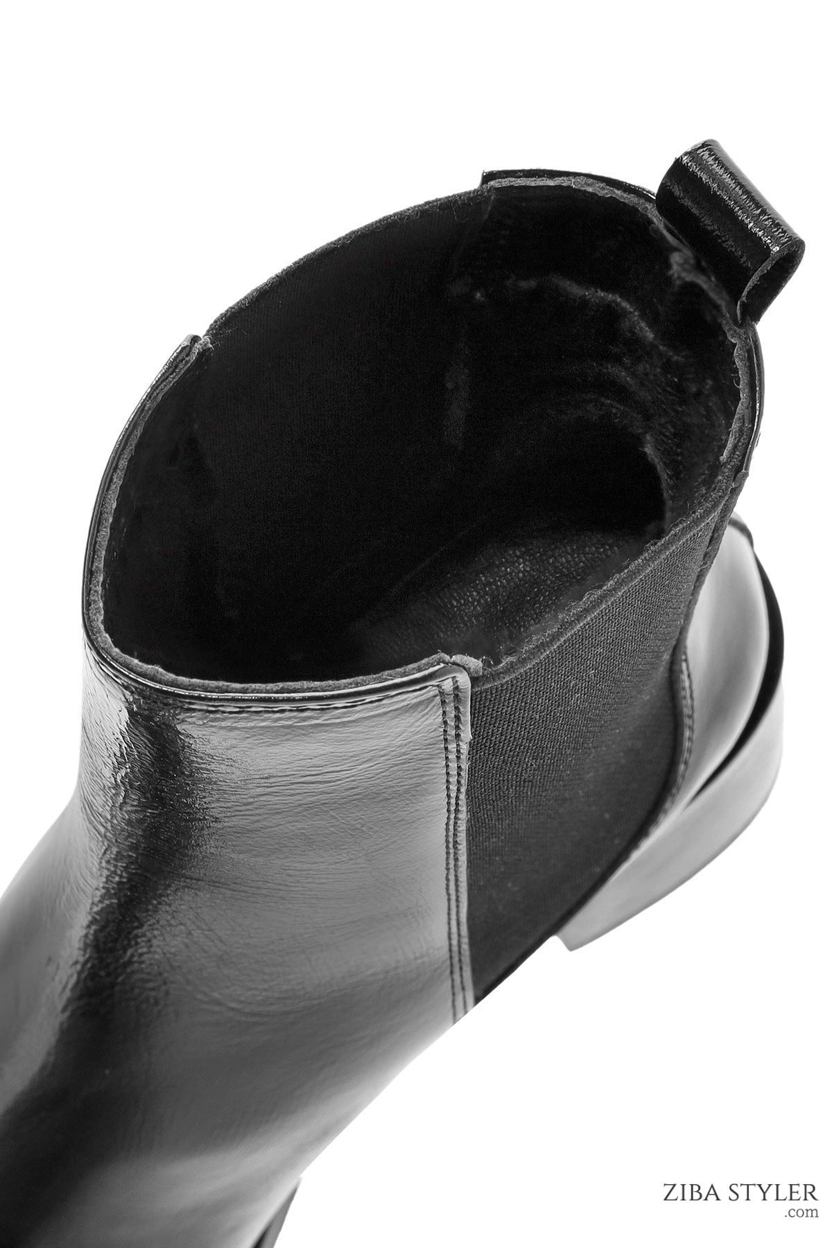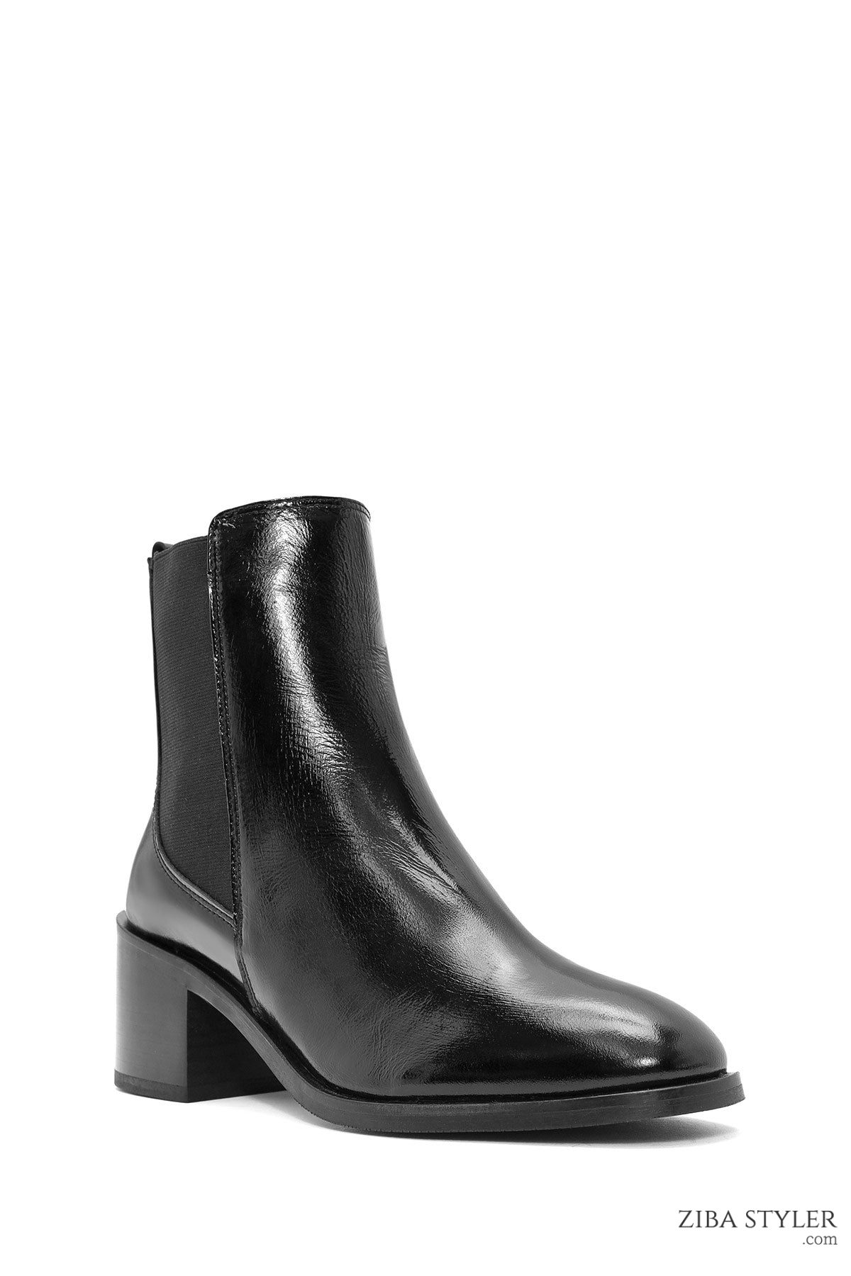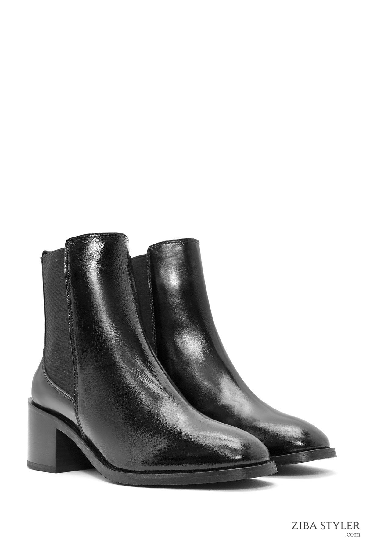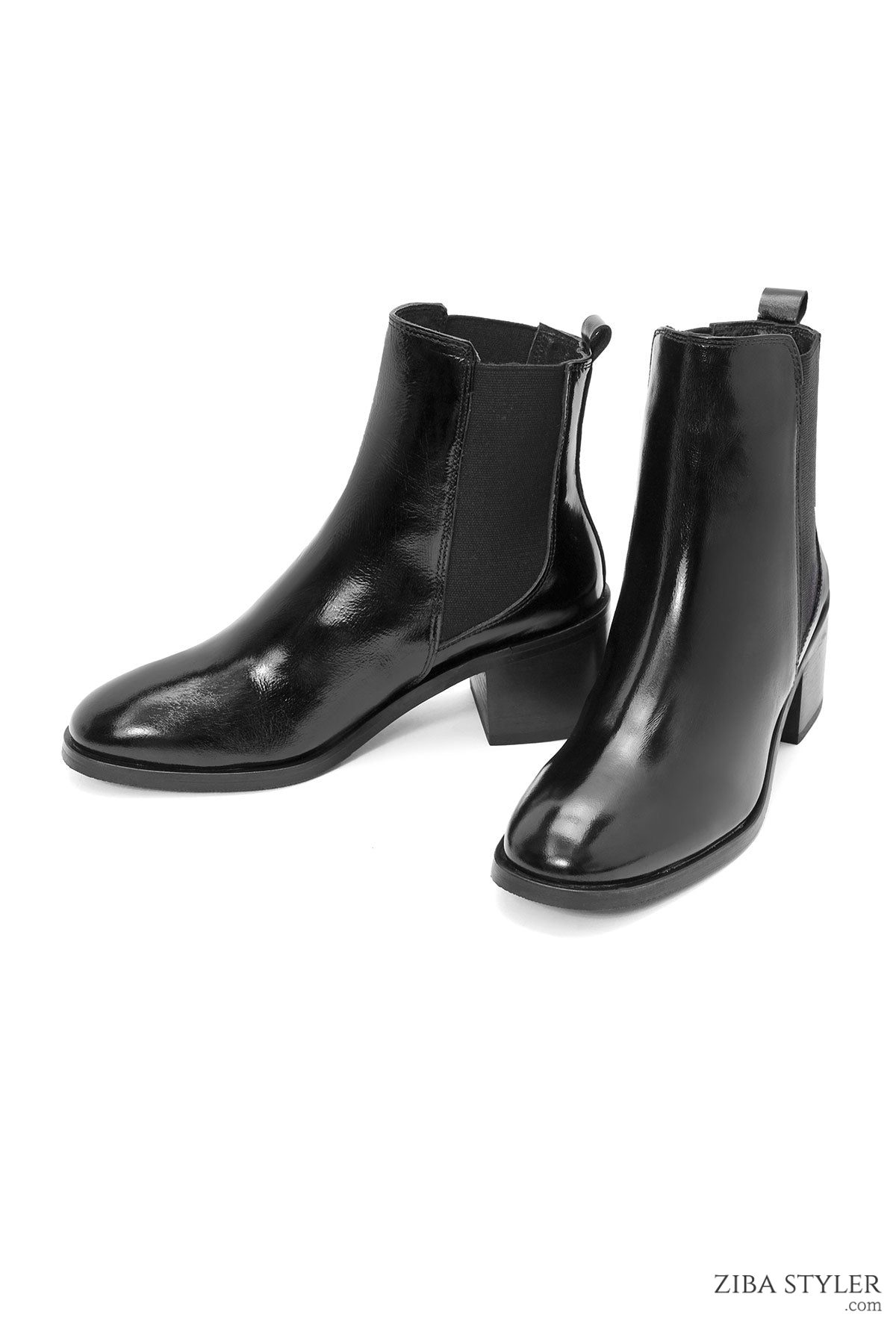 بوت چلسی زنانه چرمی مشکی براق پاشنه ضخیم دری مد
