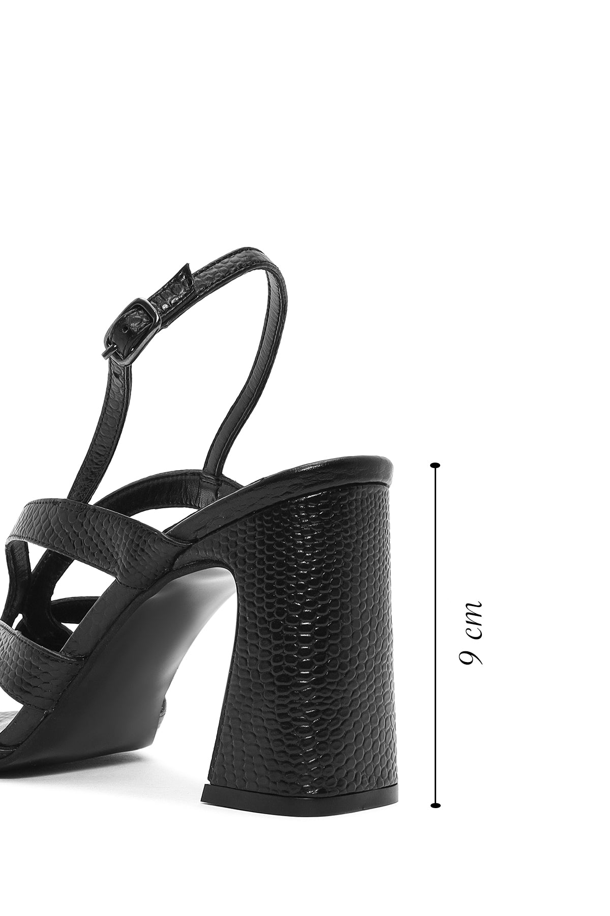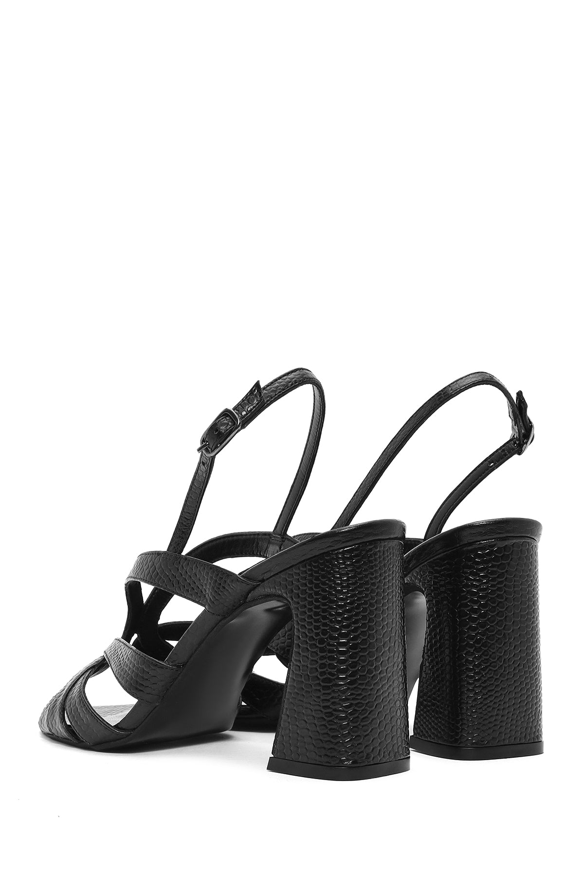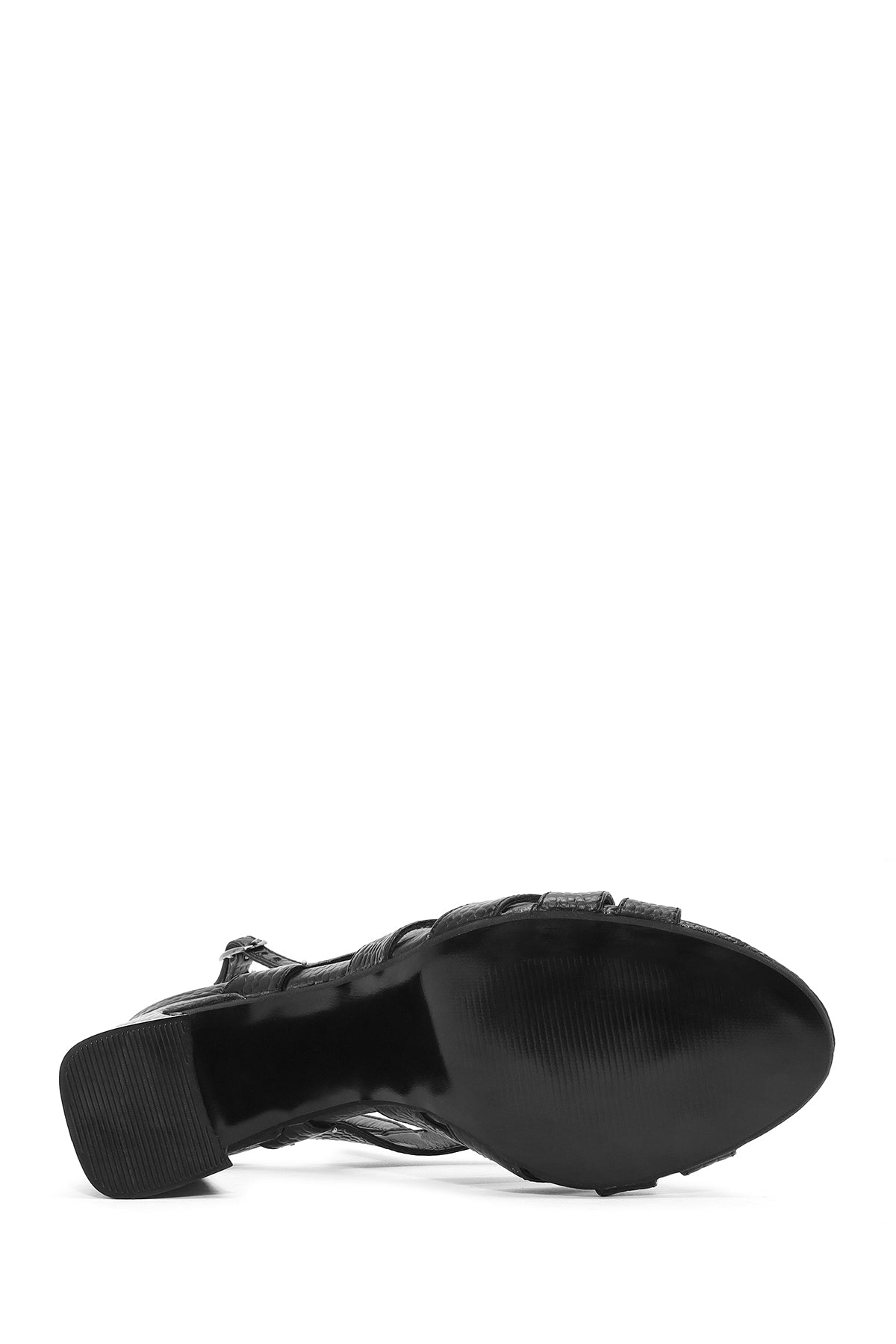 Kadın Siyah Bilekten Tokalı Desenli Kalın Topuklu Deri Sandalet