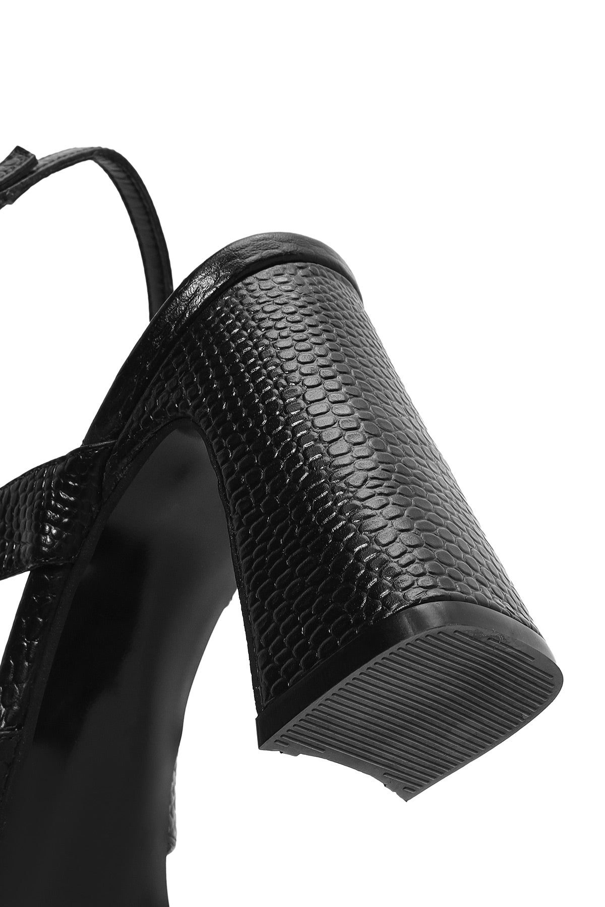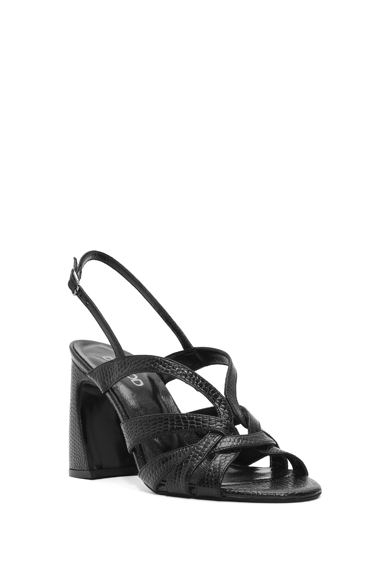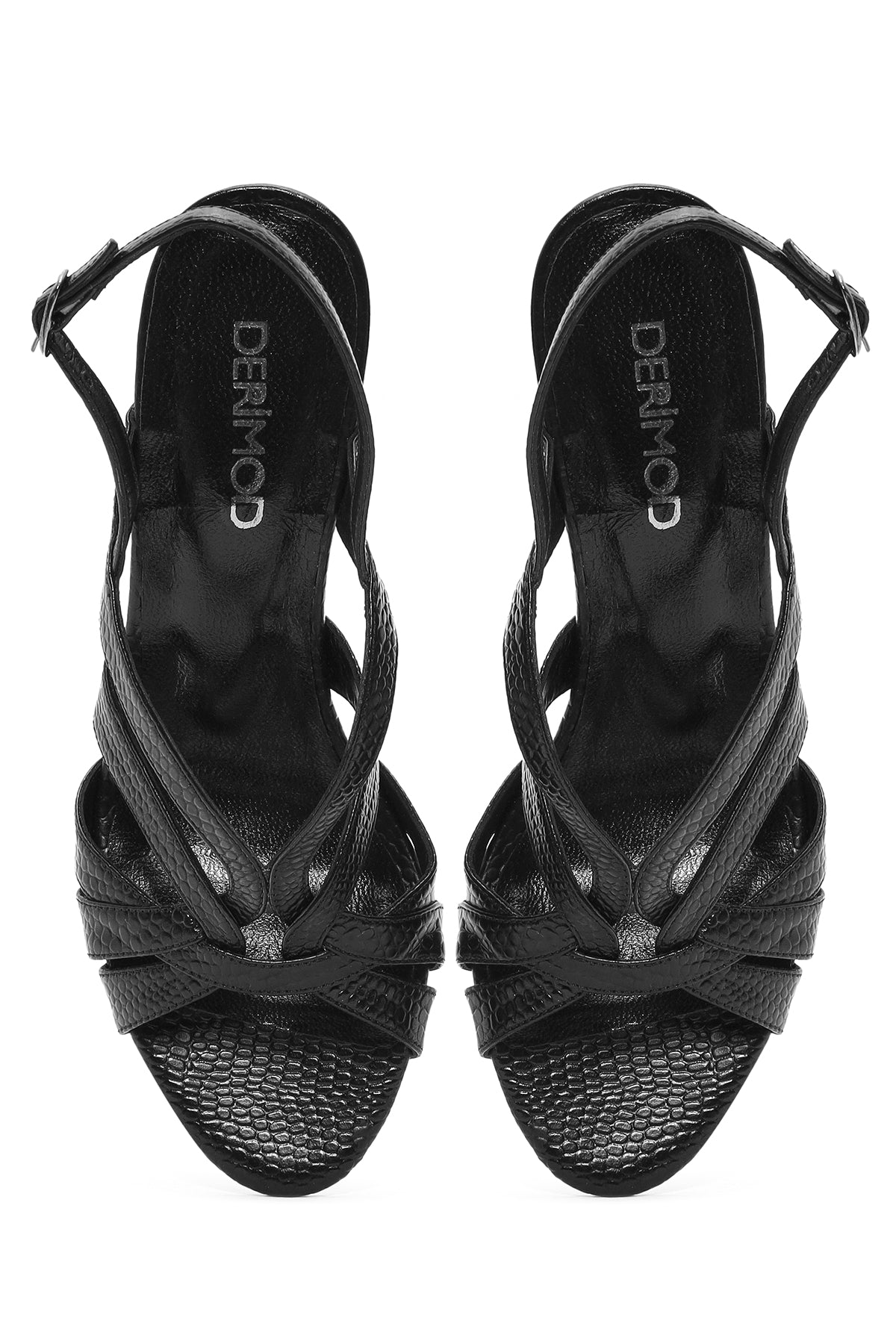 Kadın Siyah Bilekten Tokalı Desenli Kalın Topuklu Deri Sandalet