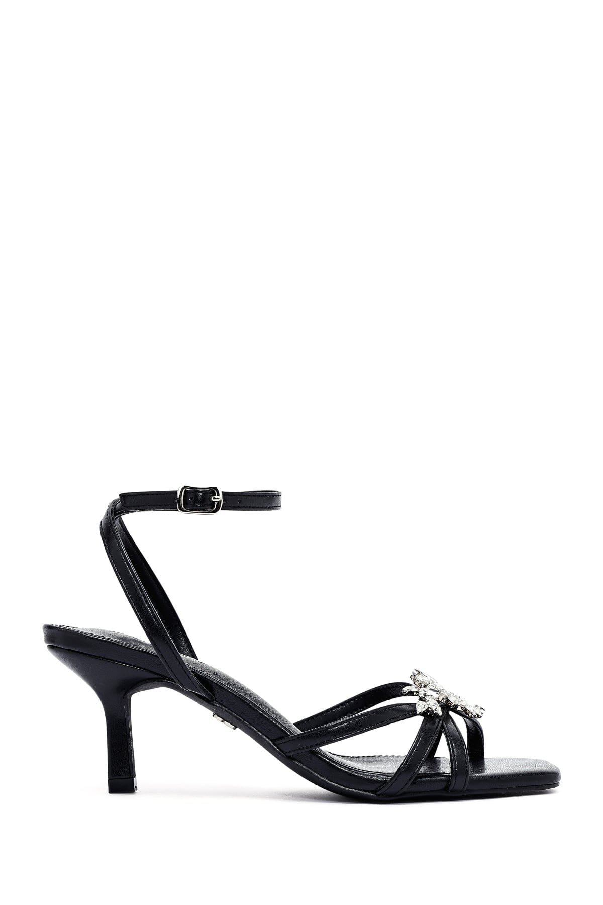 Kadın Siyah Bilekten Tokalı Taşlı İnce Kısa Topuklu Sandalet