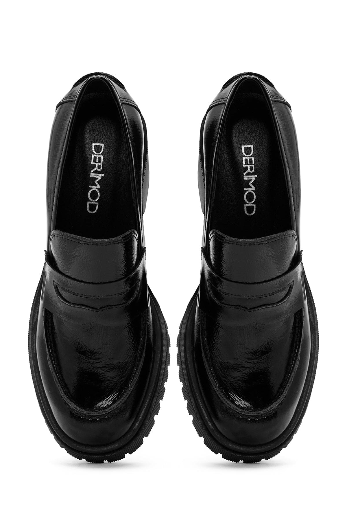 Kadın Siyah Kalın Topuklu Rugan Deri Maskülen Loafer