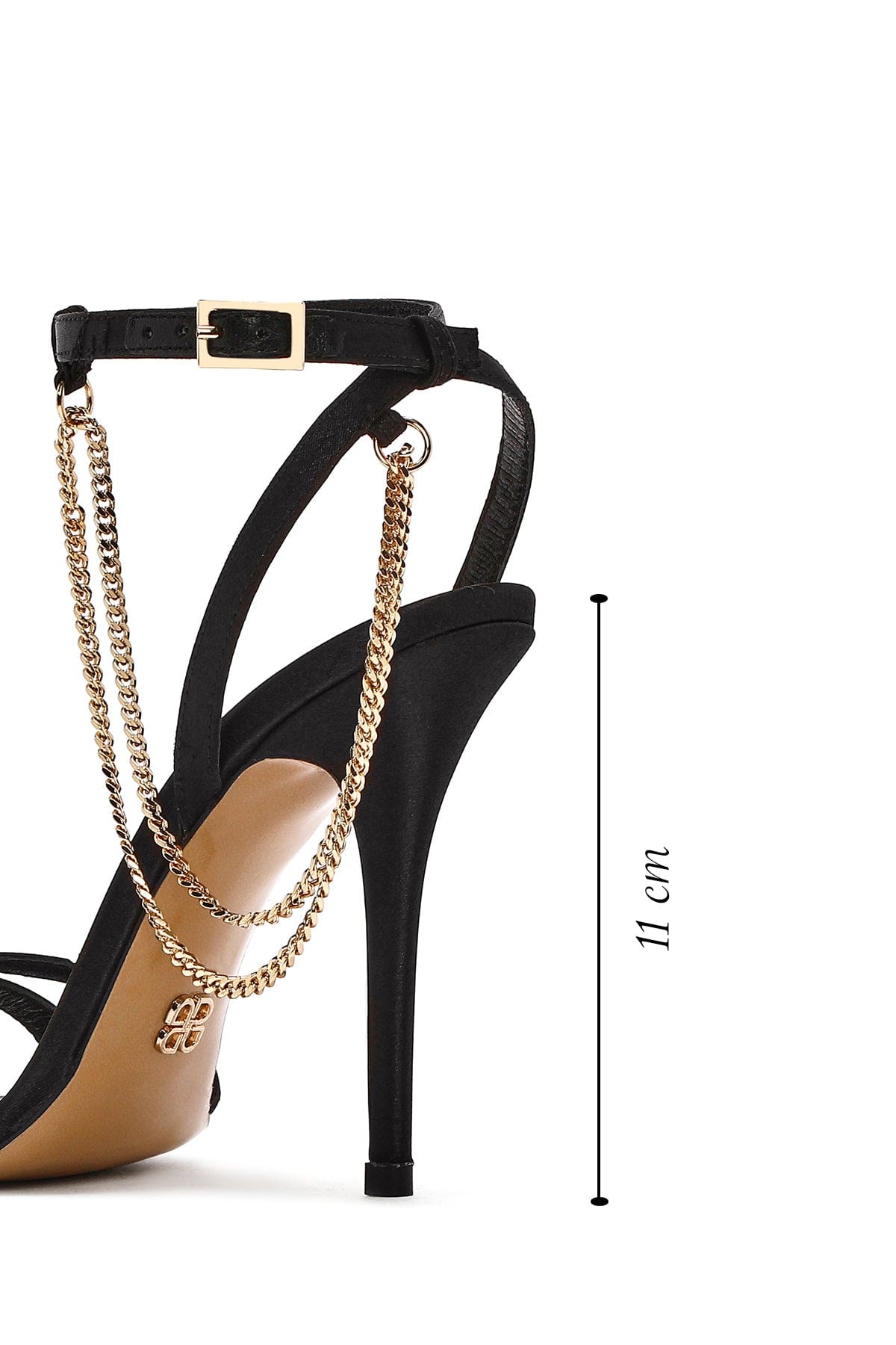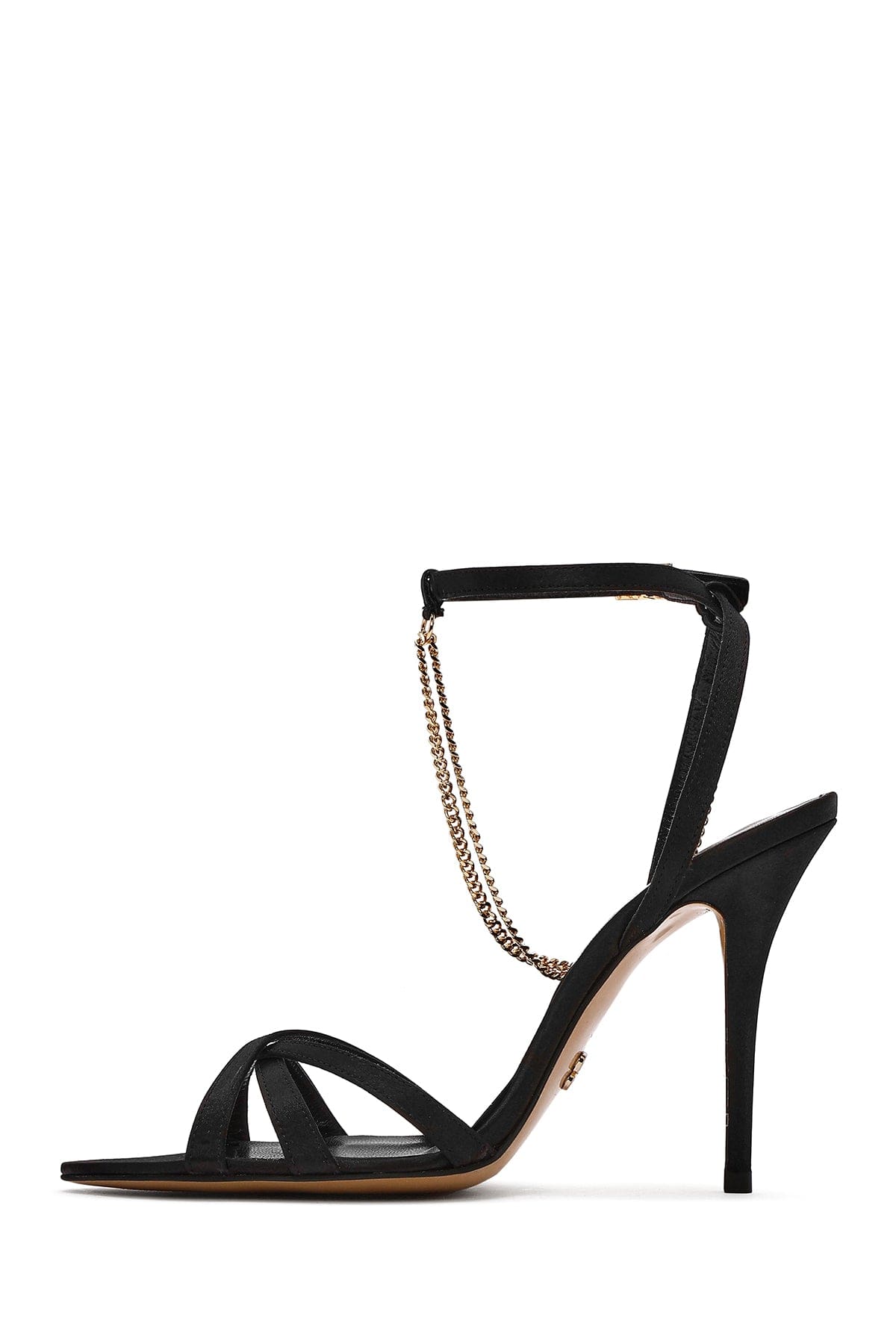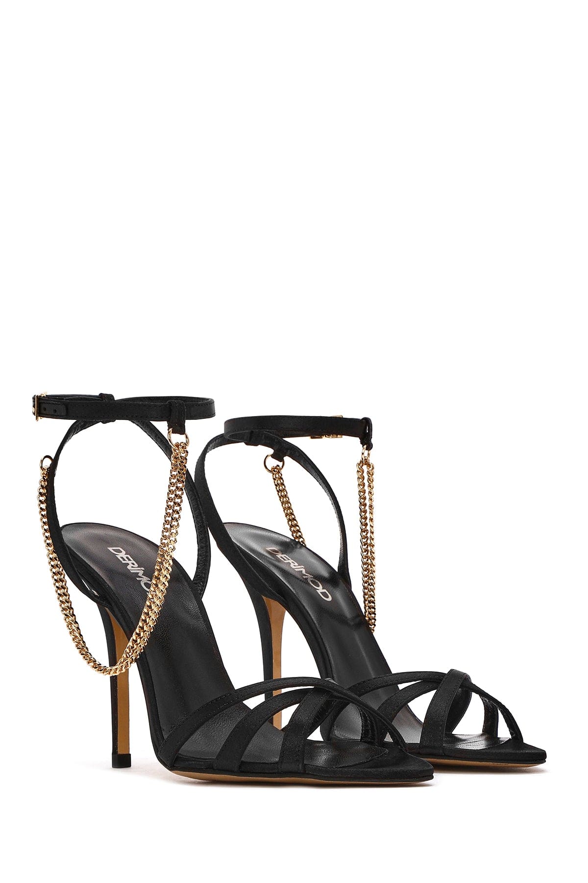 Kadın Siyah Bilekten Bantlı Zincir Detaylı Saten Deri İnce Yüksek Topuklu Sandalet