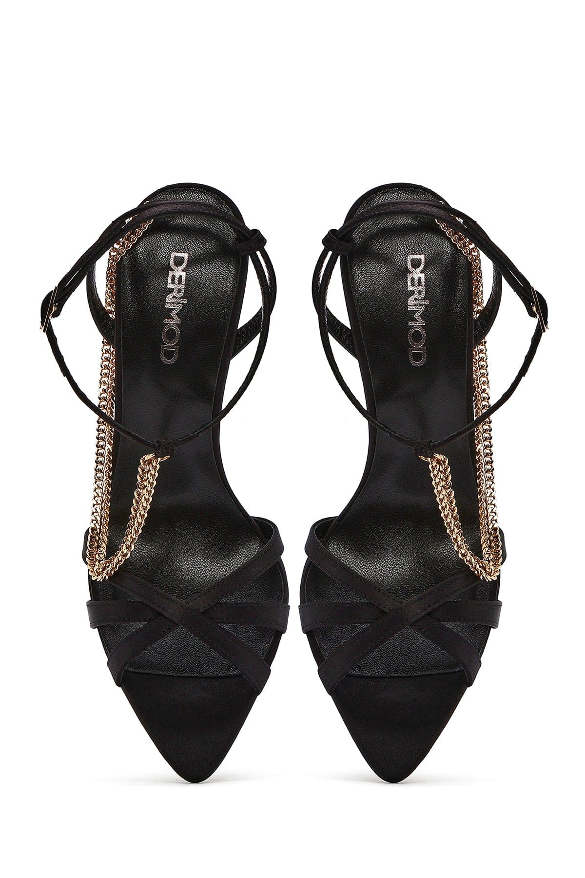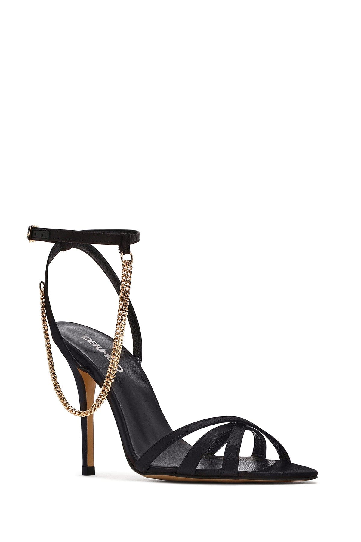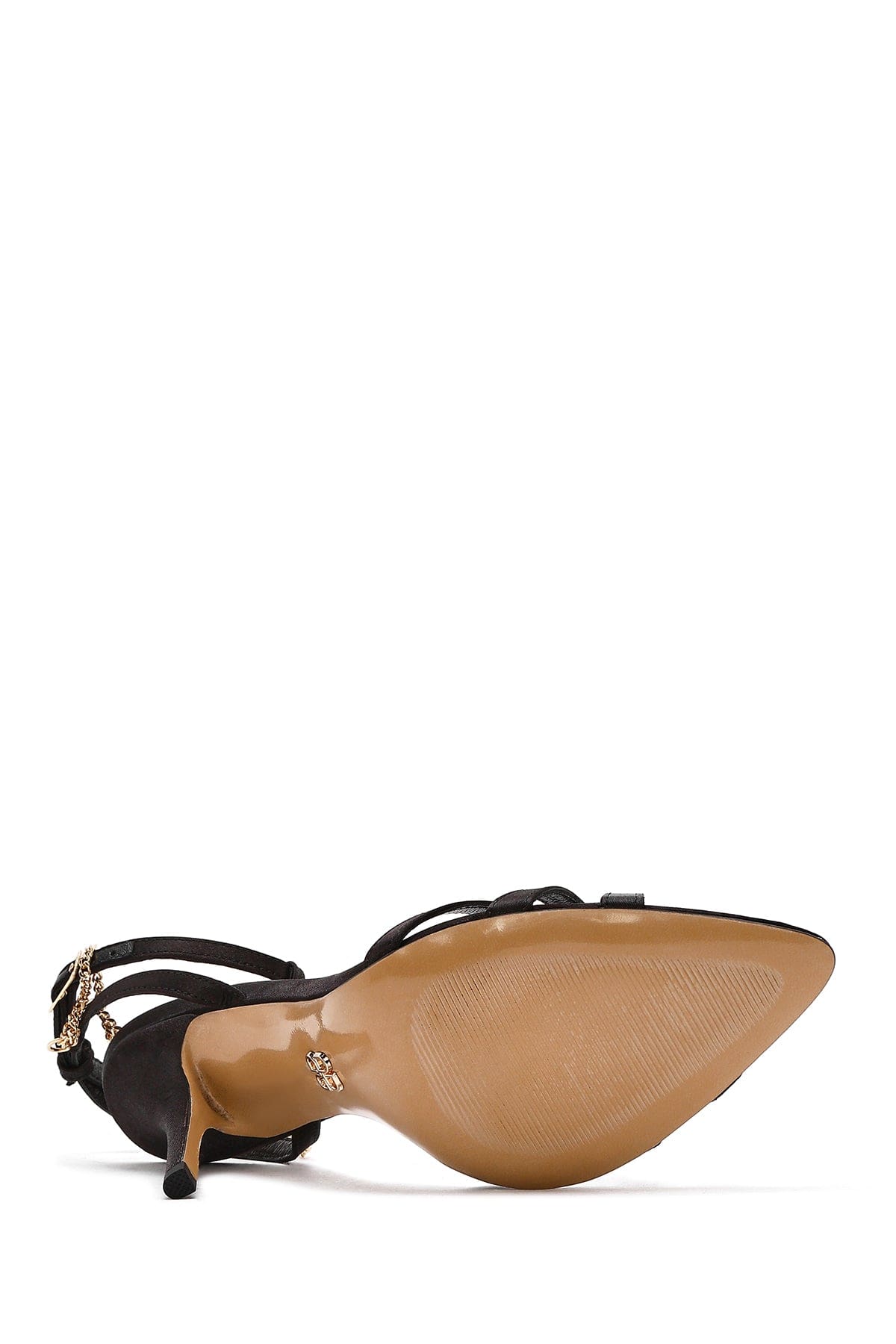 Kadın Siyah Bilekten Bantlı Zincir Detaylı Saten Deri İnce Yüksek Topuklu Sandalet
