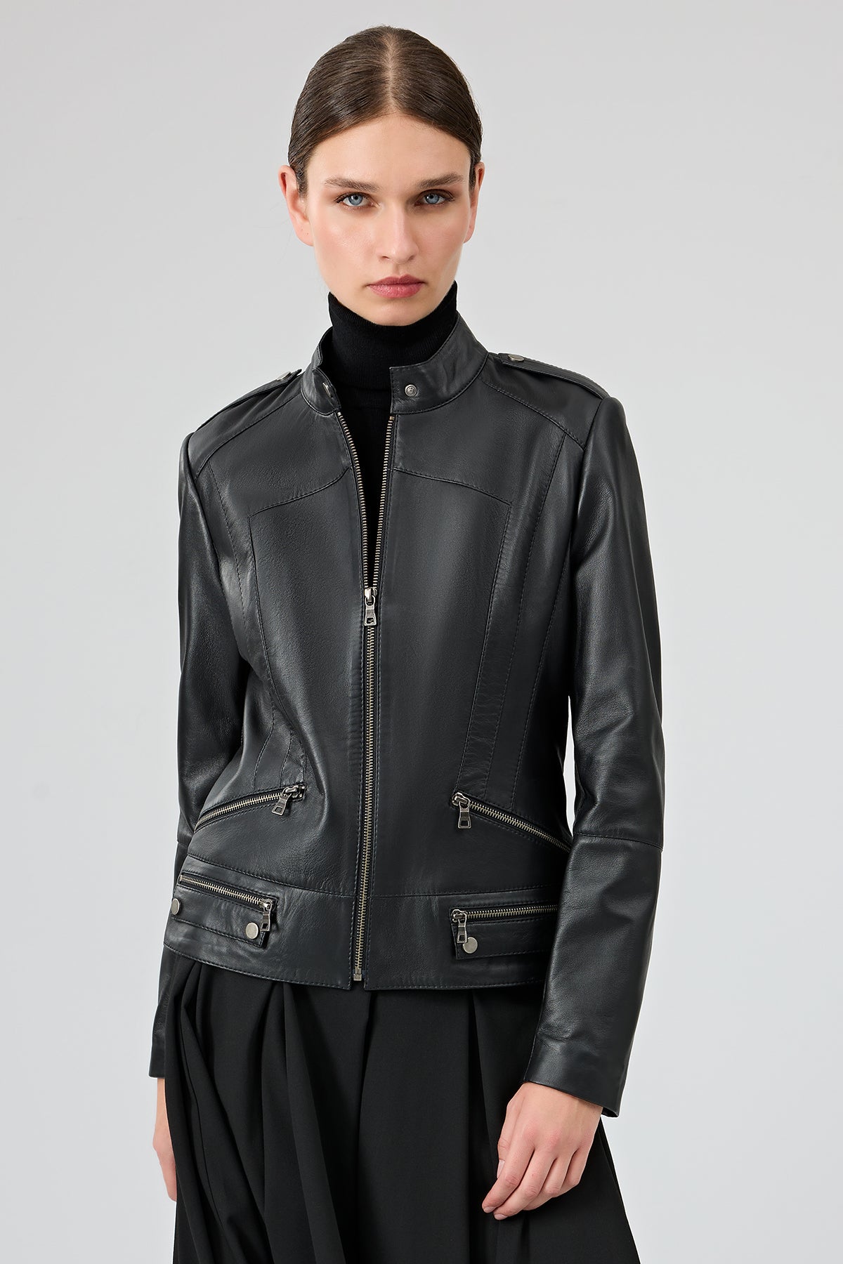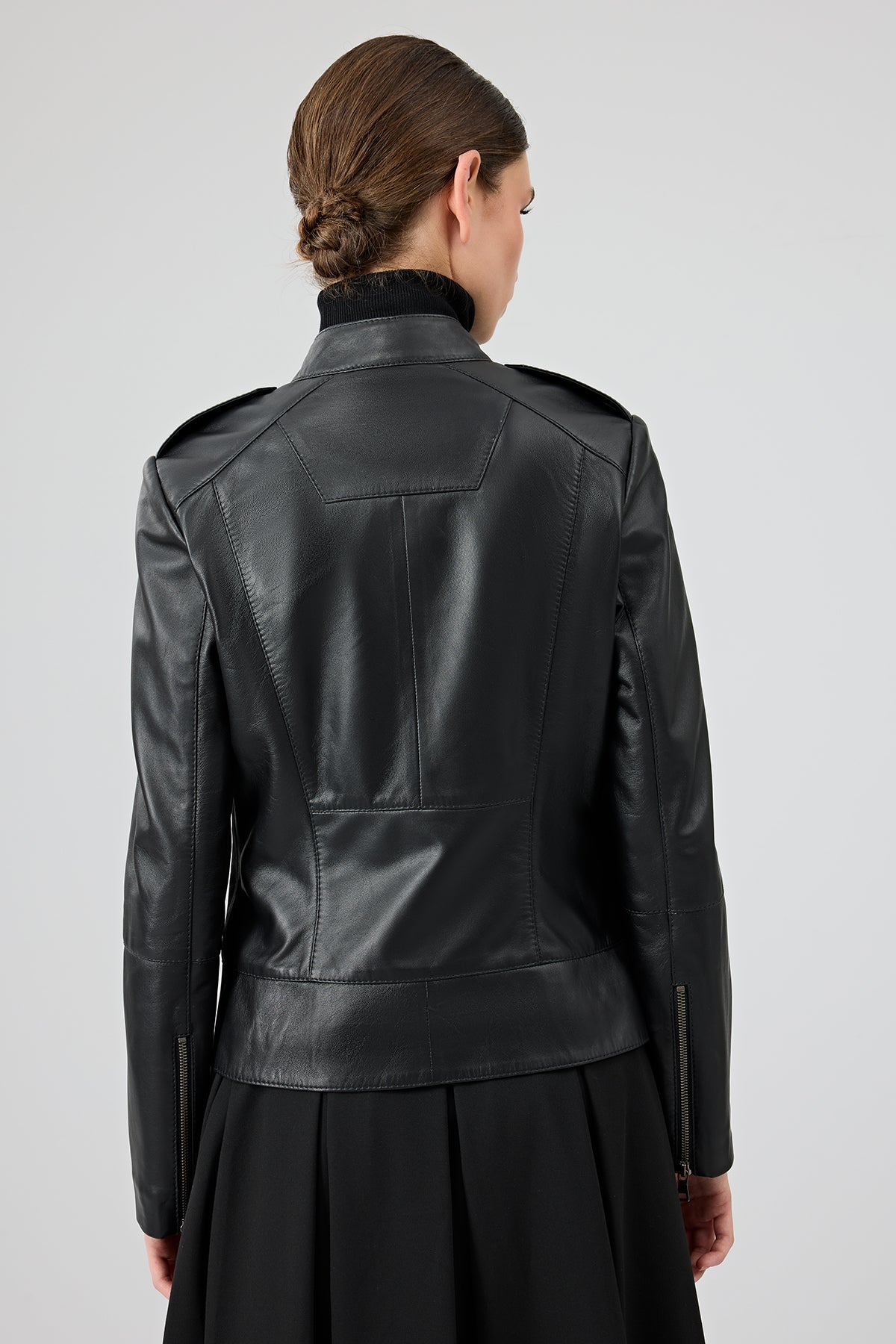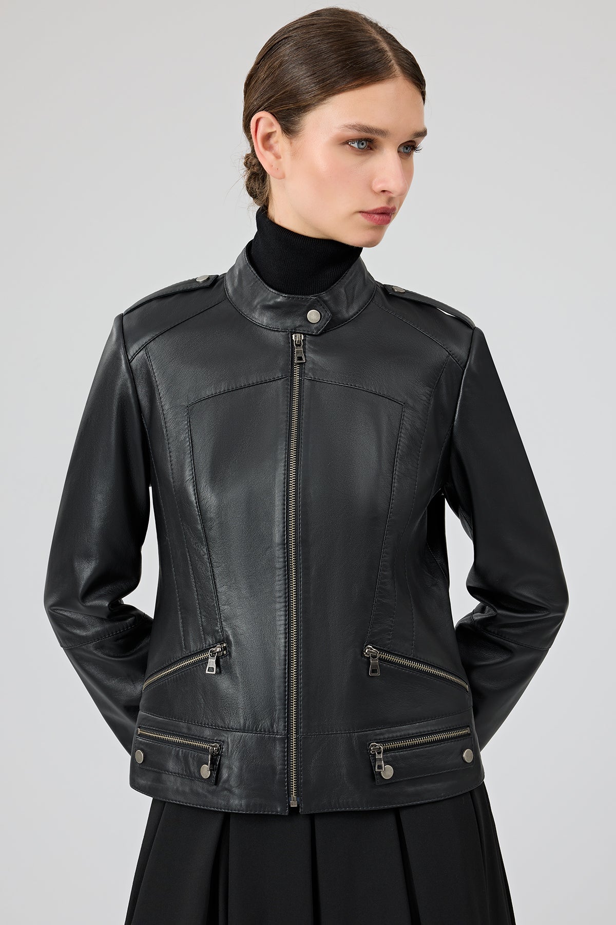کت چرمی زنانه مشکی یقه ایستاده کوتاه Nora دری مد